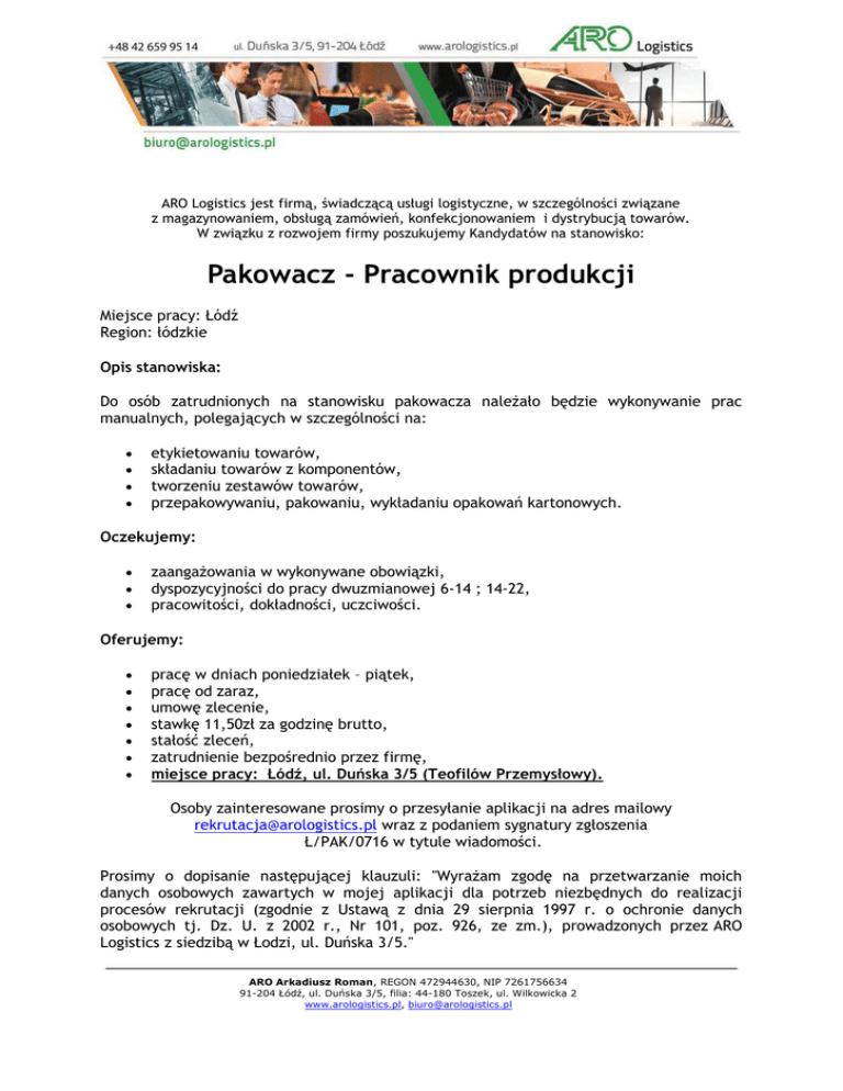 ARO Logistics jest firmą, świadczącą usługi logistyczne, w szczególności związane z magazynowaniem, obsługą zamówień, konfekcjonowaniem i dystrybucją towarów. W związku z rozwojem firmy poszukujemy Kandydatów na stanowisko: Pakowacz - Pracownik produkcji Miejsce pracy: Łódź Region: łódzkie Opis stanowiska: Do osób zatrudnionych na stanowisku pakowacza należało będzie wykonywanie prac manualnych, polegających w szczególności na: etykietowaniu towarów, składaniu towarów z komponentów, tworzeniu zestawów towarów, przepakowywaniu, pakowaniu, wykładaniu opakowań kartonowych. Oczekujemy: zaangażowania w wykonywane obowiązki, dyspozycyjności do pracy dwuzmianowej 6-14 ; 14-22, pracowitości, dokładności, uczciwości. Oferujemy: pracę w dniach poniedziałek – piątek, pracę od zaraz, umowę zlecenie, stawkę 11,50zł za godzinę brutto, stałość zleceń, zatrudnienie bezpośrednio przez firmę, miejsce pracy: Łódź, ul. Duńska 3/5 (Teofilów Przemysłowy). Osoby zainteresowane prosimy o przesyłanie aplikacji na adres mailowy [email protected] wraz z podaniem sygnatury zgłoszenia Ł/PAK/0716 w tytule wiadomości. Prosimy o dopisanie następującej klauzuli: "Wyrażam zgodę na przetwarzanie moich danych osobowych zawartych w mojej aplikacji dla potrzeb niezbędnych do realizacji procesów rekrutacji (zgodnie z Ustawą z dnia 29 sierpnia 1997 r. o ochronie danych osobowych tj. Dz. U. z 2002 r., Nr 101, poz. 926, ze zm.), prowadzonych przez ARO Logistics z siedzibą w Łodzi, ul. Duńska 3/5." ARO Arkadiusz Roman, REGON 472944630, NIP 7261756634 91-204 Łódź, ul. Duńska 3/5, filia: 44-180 Toszek, ul. Wilkowicka 2 www.arologistics.pl, [email protected]
