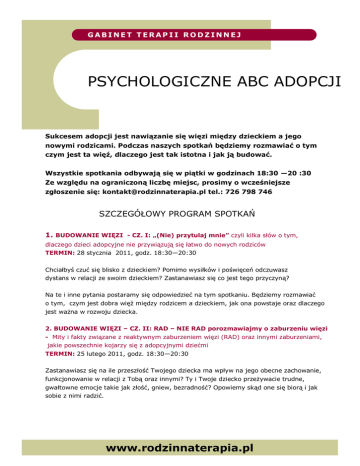 GABINET TERAPII RODZINNEJ PSYCHOLOGICZNE ABC ADOPCJI Sukcesem adopcji jest nawiązanie się więzi między dzieckiem a jego nowymi rodzicami. Podczas naszych spotkań będziemy rozmawiać o tym czym jest ta więź, dlaczego jest tak istotna i jak ją budować. Wszystkie spotkania odbywają się w piątki w godzinach 18:30 —20 :30 Ze względu na ograniczoną liczbę miejsc, prosimy o wcześniejsze zgłoszenie się: [email protected] tel.: 726 798 746 SZCZEGÓŁOWY PROGRAM SPOTKAŃ 1. BUDOWANIE WIĘZI - CZ. I: „(Nie) przytulaj mnie” czyli kilka słów o tym, dlaczego dzieci adopcyjne nie przywiązują się łatwo do nowych rodziców TERMIN: 28 stycznia 2011, godz. 18:30—20:30 Chciałbyś czuć się blisko z dzieckiem? Pomimo wysiłków i poświęceń odczuwasz dystans w relacji ze swoim dzieckiem? Zastanawiasz się co jest tego przyczyną? Na te i inne pytania postaramy się odpowiedzieć na tym spotkaniu. Będziemy rozmawiać o tym, czym jest dobra więź między rodzicem a dzieckiem, jak ona powstaje oraz dlaczego jest ważna w rozwoju dziecka. 2. BUDOWANIE WIĘZI – CZ. II: RAD – NIE RAD porozmawiajmy o zaburzeniu więzi - Mity i fakty związane z reaktywnym zaburzeniem więzi (RAD) oraz innymi zaburzeniami, jakie powszechnie kojarzy się z adopcyjnymi dziećmi TERMIN: 25 lutego 2011, godz. 18:30—20:30 Zastanawiasz się na ile przeszłość Twojego dziecka ma wpływ na jego obecne zachowanie, funkcjonowanie w relacji z Tobą oraz innymi? Ty i Twoje dziecko przeżywacie trudne, gwałtowne emocje takie jak złość, gniew, bezradność? Opowiemy skąd one się biorą i jak sobie z nimi radzić. www.rodzinnaterapia.pl GABINET TERAPII RODZINNEJ PSYCHOLOGICZNE ABC ADOPCJI 3. SAMA MIŁOŚĆ NIE WYSTARCZY — NA CO POZWOLIĆ, JAK BEZPIECZNIE ZABRONIĆ TERMIN: 25 marca, godz. 18:30 — 20:30 Zastanawiasz się na co możesz pozwolić swojemu dziecku? Trudno jest Ci stanowczo czegoś zabronić? Czasem Twoje starania okazują się być nieskuteczne? Adoptowane dziecko potrzebuje przede wszystkim bezpiecznych warunków do rozwoju— Jak to pogodzić ze stawianiem granic? „TAK” i „NIE” są tak samo ważne. O tym będziemy rozmawiać na marcowym spotkaniu 4. NIE KŁAM KOCHANIE – CZYLI KILKA SŁÓW O TYM, DLACZEGO DZIECI (ADOPCYJNE) KŁAMIĄ TERMIN: 15 kwietnia 2011, godz. 18:30—20:30 Twoje dziecko opowiada niestworzone historie? Nie mówi prawdy Tobie i innym bliskim? O tym dlaczego tak się dzieje i jaką funkcję pełni kłamstwo poświęcimy to spotkanie. Opowiemy o tym jak sobie radzić w takich sytuacjach. 5. SEKSUALNOŚĆ DZIECKA – CO TO JEST I JAK JĄ DOBRZE TRAKTOWAĆ TERMIN: 20 maja 2011, godz. 18:30—20:30 Twoje dziecko dotyka się w miejsca intymne? Mówi dużo o sferze intymnej oraz dąży do bliskich, fizycznych kontaktów z innymi dorosłymi i dziećmi? Niepokoisz się tym? Opowiemy o rozwoju seksualności dziecka, rolach jakie kontakt fizyczny pełni w rozwoju dziecka adoptowanego oraz o funkcjach jakie mogą dla niego mieć niepokojące Cie zachowania. 6. POWIEDZIEĆ / NIE POWIEDZIEĆ – CZYLI JAK ROZMAWIAĆ Z DZIECKIEM O JEGO KORZENIACH NA RÓŻNYCH ETAPACH JEGO ROZWOJU TERMIN: 17 czerwca 2011, godz. 18:30—20:30 Zastanawiasz się jak i kiedy powiedzieć dziecku o jego rodzinie biologicznej? Przeżywasz niepokój, obawiasz się odrzucenia przez dziecko? Masz obawy czy te informacje nie zranią dziecka i nie wpłyną negatywnie na Waszą relację? Nie wiesz jak dostosować przekaz do wieku dziecka? Na tym spotkaniu skupimy się jak w bezpieczny sposób dla Ciebie i dla dziecka przekazać te informacje. www.rodzinnaterapia.pl