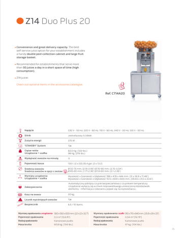 Z14 Duo Plus 20 Convenience and great delivery capacity. The best self-service juice option for your establishment includes a handy double peel-collection cabinet and large fruit storage basket. Recommended for establishments that serve more than 50 juices a day in a short space of time (high consumption). Z14 juicer. Check out optional items in the accessories catalogue. Ref. C714A20 Napięcie 230 V - 50 Hz, 220 V - 60 Hz, 110 V - 60 Hz, 240 V - 50 Hz, 120 V - 50 Hz. Silnik Jednofazowy 0.33kW. Zużycie energii 275 W. ”STANDBY” System Tak Ciężar netto Urządzenie + szafka 60,5 Kg. (133 lbs.) 98 Kg. (216 lbs.) Wydajność owoców na minutę 11 Pojemność kosza 100 l. (2 x 50) 26.4 gal. (2 x 13.2) Średnica owoców Średnica owoców w opcji z zestaw. Ø 55-75 mm. (2.16-2.95”) Ø 70-90 mm. (2.75-3.54”) Ø 45-60 mm. (1.77-2.36”) Ø 53-60 mm. (2.1-2.36”) Wymiary urządzenia Urządzenie + szafka Wysokość x Szerokość x Głębokość 788 x 478 x 444 mm. (31 x 18.8 x 17.48”) Wysokość x Szerokość x Głębokość 1515 x 800 x 600 mm. (59.65 x 31,5 x 23.6”) Zabezpieczenia Automatyczny potrójny czujnik bezpieczeństwa z czujnikiem temperatury. Urządzenie wyłączy się w chwili nieprawidłowego umiesczenia którekolwiek elementu - informacja o zdarzeniu pojawi się na wyświetlaczu. Kosz na owoce 20 kg. Licznik wyciśniętych owoców Tak Bezpiecznik 6,3 / 10 Apms. Wymiary opakowania urządzenia 560 x 560 x 830 mm. (22 x 22 x 32.7”) Wymiary opakowania szafki 910 x 710 x 840 mm. (35.8 x 28 x 33”) Pojemność opakowania 0,3 m³ (10.6 ft³) Pojemność opakowania 0,54 m³ (19.1 ft³) Rodzaj opakowania Kartonowe pudło Rodzaj opakowania Kartonowe pudło Masa brutto 60,8 kg. (134 lbs.) Masa brutto 47 kg. (104 lbs.) 15