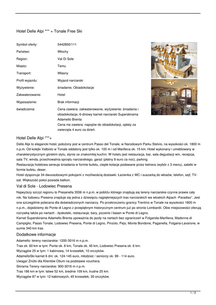 Hotel Delle Alpi *** + Tonale Free Ski Symbol oferty: 5442850/111 Państwo: Włochy Region: Val Di Sole Miasto: Temu Transport: Własny Profil wyjazdu: Wyjazd narciarski Wyżywienie: śniadanie, Obiadokolacje Zakwaterowanie: Hotel Wyposażenie: Brak informacji świadczenia: Cena zawiera: zakwaterowanie, wyżywienie: śniadania i obiadokolacje, 6-dniowy karnet narciarski Superskirama Adamello Brenta Cena nie zawiera: napojów do obiadokolacji, opłaty za zwierzęta 4 euro za dzień. Hotel Delle Alpi ***+ Delle Alpi to elegancki hotel, położony jest w centrum Passo del Tonale, w Narodowym Parku Stelvio, na wysokości ok. 1800 m n.p.m. Od kolejki Valbiolo w Tonale oddalony jest tylko ok. 100 m i od Marilleva ok. 15 km. Hotel wykonany i umeblowany w charakterystycznym górskim stylu, słynie ze znakomitej kuchni. W hotelu jest restauracja, bar, sala degustacji win, recepcja, sala TV, winda, przechowalnia sprzętu narciarskiego, garaż (płatny 8 euro za noc), parking. Restauracja hotelowa serwuje śniadania w formie bufetu, ciepłe kolacje podawane przez kelnera (wybór z 3 menu), sałatki w formie bufetu, deser. Hotel dysponuje 34 dwuosobowymi pokojami z możliwością dostawki. Łazienka z WC i suszarką do włosów, telefon, sejf, TVsat. Większość pokoi posiada balkon. Val di Sole - Lodowiec Presena Najwyższy szczyt regionu to Presanella 3556 m n.p.m. w pobliżu którego znajdują się tereny narciarskie czynne prawie cały rok. Na lodowcu Presena znajduje się jedna z dziesięciu najpiękniejszych tras narciarskich we włoskich Alpach -Paradiso”. Jest ona szczególnie polecana dla doświadczonych narciarzy. Po przekroczeniu granicy Trentino w Tonale na wysokości 1800 m n.p.m., dojedziemy do Ponte di Legno z przepięknym historycznym centrum już po stronie Lombardii. Obie miejscowości oferują rozrywkę także po nartach - dyskoteki, restauracje, bary, pizzerie i basen w Ponte di Legno. Karnet Superskirama Adamello Brenta upoważnia do jazdy na nartach bez ograniczeń w Folgarida-Marilleva, Madonna di Campiglio, Passo Tonale, Lodowiec Presena, Ponte di Legno, Pinzolo, Pejo, Monte Bondone, Paganella, Folgaria-Lavarone, w sumie 340 km tras. Dodatkowe informacje Adamello: tereny narciarskie: 1200-3016 m n.p.m. Tras ok. 60 km w tym: Ponte ok. 8 km, Tonale ok. 45 km, Lodowiec Presena ok. 6 km. Wyciągów 25 w tym: 1 kabinowa, 14 krzesełek, 10 orczyków. AdamelloSki karnet 6 dni: ok. 124-145 euro, młodzież / seniorzy ok. 99 - 114 euro. Uwaga! Zniżki dla Klientów Otium na podstawie vouchera. Skirama Tereny narciarskie: 900-3016 m n.p.m. Tras 186 km w tym: łatwe 52 km, średnie 109 km, trudne 25 km. Wyciągów 87 w tym: 12 kabinowych, 45 krzesełek, 30 orczyków. 1/2 Skirama karnet 6 dni (Tonale, Lodowiec Presena - Ponte di Lego, oraz 1 dzień Marilleva-Folgarida, 1 dzień Madonna di Campiglio, 1 dzień Pejo) ok. 146-169 euro, młodzież / seniorzy ok. 123 - 135 euro. Superskirama Adamello Brenta karnet 6 dni ok. 167-188,50 euro, młodzież/seniorzy ok. 135-151,50 euro. Uwaga! Dzieci do 8 lat gratis* sprawdź warunki. Kaucja za key card 5 euro. Potrzebne zdjęcie. Dojazd Z Cieszyna: drogą na Olomouc, E 462 na Brno, 52/E 461 na Wiedeń przez Mikulov, A1 na Linz, Salzburg, A12 na Innsbruck, A13/A22 na Bolzano przez przełęcz Brenner, na Bolzano i dalej zjazd z autostrady w miejscowości S. Michele Mezzocorona następnie Cles, Male i kierunek na Tonale. Razem ok. 1090 km. Z Kudowy: 11/E67 na Pragę, 5/E50 na Plznen, 93 na Monachium, autostradą na Innsbruck, A13/A22 na Bolzano przez przełęcz Brenner i dalej jw. Razem ok. 990 km. Lotniska: Bergamo ok. 140 km, Mediolan ok. 190 km. Uwaga Miejsca w tym obiekcie mamy na zapytanie. W celu sprawdzenia dostępności miejsc proszę o wypełnienie rezerwacji wstępnej. Na podstawie tej rezerwacji będzie wysłane zapytanie do kontrahenta o dostępności miejsc, w przypadku braku wolnych pokoi zostanie Państwu zaproponowany inny obiekt o zbliżonym standardzie i cenie. Rezerwacja wstępna jest bezkosztowa i nie zobowiązuje Państwa do zakupu TERMINY: od: 2017-11-19 do: 2017-11-26 (8 dni), miejsca: zamów cena od: 1620 PLN od: 2017-11-19 do: 2017-12-03 (15 dni), miejsca: zamów cena od: 3290 PLN od: 2017-11-26 do: 2017-12-03 (8 dni), miejsca: zamów cena od: 1670 PLN CENNIK: Długość pobytu: 15 dni 8 dni 8 dni Grupa cenowa: A A B (-) (-) (-) (-) (-) 3240 1620 1670 2.4 % 2.4 % 2.4 % 64 32 32 Pobyt w obiekcie (do wyboru) (*) Pokój dwuosobowy - duże łóżko standardowo dla osób: 2 (-) Ubezpieczenie (do wyboru) (*) ubezpieczenie NW KL Rodzaj osoby (do wyboru) (*) osoba dorosła Ubezpieczenie (opcjonalne) ubezpieczenie - od kosztów rezygnacji Dopłata do ubezpieczenia SKI Waluta: PLN Aktualne ceny z systemu S.A.R.T. (-) - cena usługi, podatku kalkulowana przy osobie lub gratis (*) - kwota wliczona w cenę standardową 2/2
