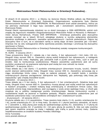 www.egoturystyka.pl Data: 2017-03-07 Mistrzostwa Polski Płetwonurków w Orientacji Podwodnej . W dniach 8-10 sierpnia 2014 r. w Olecku na Jeziorze Olecko Wielkie odbyły się Mistrzostwa Polski Płetwonurków w Orientacji Podwodnej. Organizatorem wydarzenia było Oleckie Stowarzyszenie Nurkowe (OSN) AMFIPRION. W Mistrzostwach brali udział zawodnicy, którzy po raz pierwszy startowali w tego typu zawodach, jak i utytułowani zawodnicy, wielokrotni Mistrzowie Polski. Powiat Olecki reprezentowała młodzież na co dzień trenująca w OSN AMFIPRION, wśród nich znajdą się tegoroczni medaliści Długodystansowych Mistrzostw Polski w Pływaniu w Płetwach mówi Janusz Romańczuk, Prezes OSN AMFIPRION - Orientacja podwodna jako dyscyplina zaczęła rozwijać się w latach 50-tych ubiegłego stulecia w wyniku połączenia elementów pływania szybkiego w płetwach, zawodów sprawnościowych i technik podwodnych. Piękno tej dyscypliny tkwi w tym, że w zawodach ramię w ramię staje 16-letni zawodnik jak i 63-letni. Impreza ma na celu wzbogacenie oferty sportowej powiatu oleckiego i promocję tej dyscypliny sportowej w Polsce. Mistrzostwa Polski Płetwonurków w Orientacji Podwodnej zostały rozegrane konkurencjach: - indywidualnych: M.-KURS - 9 sierpnia 2014 r. Trasa przypomina literę M i składa się z boi startu, 3 boi opływowych i linii mety (32 m). Długość trasy wynosi 590 m. Zawodnicy płyną wokół kolejnych boi opływowych, a następnie przekraczają linie mety. Najlepiej, gdy zawodnik trafi w punkt zerowy mety, czyli w sam jej środek. Jest to konkurencja szybkościowa. Miejsce zawodnika uzależnione jest od sumy punktów uzyskanych za poprawne opłynięcie pod wodą boi oraz celność na mecie. KONTAKT - 9 sierpnia 2014 r. Trasa składa się z boi startu i 5 punktów orientacyjnych (drewniane krzyże, tyczki). Ostatni punkt stanowi jednocześnie metę. Długość trasy wynosi 650 m. Zawodnicy poruszają się w ciągu określonego limitu czasu i mają za zadanie pokazać, że znaleźli każdy z punktów orientacyjnych poprzez pociągniecie/ zakręcenie boi. Najlepiej, gdy pokonają całą trasę jak najszybciej i gdy znajdą wszystkie tyczki. GWIAZDA - 10 sierpnia 2014 r. Trasa składa się z 5 boi startu, 5 boi opływowych i 5 boi orientacyjnych. Ostatnia boja jest metą. Długość trasy wynosi 600 m. Zawodnicy muszą płynąć pod wodą wokół boi opływowych w każdym przypadku i znaleźć kolejną boję orientacyjną w określonym limicie czasu. Gdy zawodnik ominie boję nieprawidłowo, jest wyciągany z wody przez sędziego trasy, w chwili gdy znajduje się w pobliżu następnego punktu orientacyjnego. Nazwa konkurencji wynika z rozstawienia bojek na jeziorze w kształcie gwiazdy. Miejsce zawodnika uzależnione jest od szybkości pokonania trasy i od prawidłowo ominiętych boi i znalezionych tyczek. - drużynowych - 10 sierpnia 2014 r. Drużyna składa się z 2-4 zawodników. Trasa zawiera boje startu (1-4), punkty orientacyjne A1 i A2, punkt orientacyjny B i 32 m linię mety. Ze startu nr 1 płynie pierwszy zawodnik, ze startu nr 2 zawodnik 2, obaj płyną pod wodą do spotkaniowego punktu A1. Zawodnicy 3 i 4 płyną do spotkaniowego punktu A2. Z punktów A1 i A2 pary płyną do punktu B. Gdy już cała czwórka jest razem wspólnie wracają na metę i najlepiej, gdy trafią w punkt zerowy mety. Zadanie współfinansowane ze środków budżetu Powiatu Oleckiego Anna Turowska www.powiat.olecko.pl 07 - 08 - 2014 Strona 1 z 2 www.egoturystyka.pl Data: 2017-03-07 Mistrzostwa Polski Płetwonurków w Orientacji Podwodnej . Administrator egoturystyka.pl Administrator Strona 2 z 2