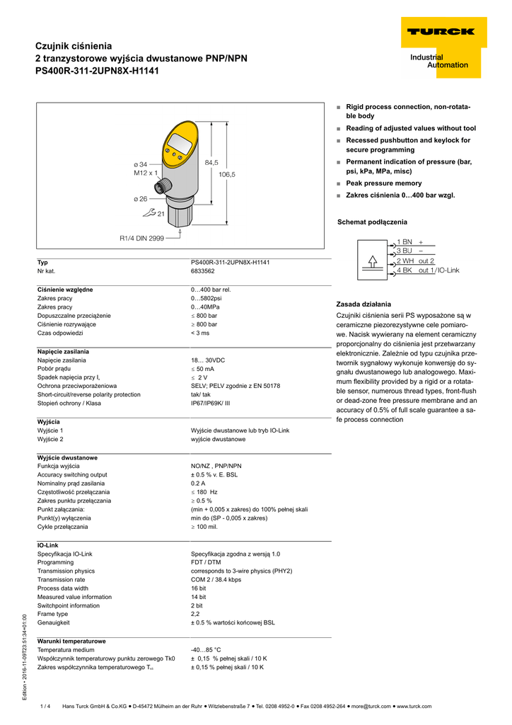 Czujnik ciśnienia 2 tranzystorowe wyjścia dwustanowe PNP/NPN PS400R-311-2UPN8X-H1141 ■ Rigid process connection, non-rotatable body ■ Reading of adjusted values without tool ■ Recessed pushbutton and keylock for secure programming ■ Permanent indication of pressure (bar, psi, kPa, MPa, misc) ■ Peak pressure memory ■ Zakres ciśnienia 0…400 bar wzgl. Edition • 2016-11-09T23:51:34+01:00 Schemat podłączenia Typ Nr kat. PS400R-311-2UPN8X-H1141 6833562 Ciśnienie względne Zakres pracy Zakres pracy Dopuszczalne przeciążenie Ciśnienie rozrywające Czas odpowiedzi 0…400 bar rel. 0…5802psi 0…40MPa ð 800 bar ï 800 bar < 3 ms Napięcie zasilania Napięcie zasilania Pobór prądu Spadek napięcia przy Ie Ochrona przeciwporażeniowa Short-circuit/reverse polarity protection Stopień ochrony / Klasa 18… 30VDC ð 50 mA ð 2V SELV; PELV zgodnie z EN 50178 tak/ tak IP67/IP69K/ III Wyjścia Wyjście 1 Wyjście 2 Wyjście dwustanowe lub tryb IO-Link wyjście dwustanowe Wyjście dwustanowe Funkcja wyjścia Accuracy switching output Nominalny prąd zasilania Częstotliwość przełączania Zakres punktu przełączania Punkt załączania: Punkt(y) wyłączenia Cykle przełączania NO/NZ , PNP/NPN ± 0.5 % v. E. BSL 0.2 A ð 180 Hz ï 0.5 % (min + 0,005 x zakres) do 100% pełnej skali min do (SP - 0,005 x zakres) ï 100 mil. IO-Link Specyfikacja IO-Link Programming Transmission physics Transmission rate Process data width Measured value information Switchpoint information Frame type Genauigkeit Specyfikacja zgodna z wersją 1.0 FDT / DTM corresponds to 3-wire physics (PHY2) COM 2 / 38.4 kbps 16 bit 14 bit 2 bit 2,2 ± 0.5 % wartości końcowej BSL Warunki temperaturowe Temperatura medium Współczynnik temperaturowy punktu zerowego Tk0 Zakres współczynnika temperaturowego TkS -40…85 °C ± 0,15 % pełnej skali / 10 K ± 0,15 % pełnej skali / 10 K 1/4 Zasada działania Czujniki ciśnienia serii PS wyposażone są w ceramiczne piezorezystywne cele pomiarowe. Nacisk wywierany na element ceramiczny proporcjonalny do ciśnienia jest przetwarzany elektronicznie. Zależnie od typu czujnika przetwornik sygnałowy wykonuje konwersję do sygnału dwustanowego lub analogowego. Maximum flexibility provided by a rigid or a rotatable sensor, numerous thread types, front-flush or dead-zone free pressure membrane and an accuracy of 0.5% of full scale guarantee a safe process connection Hans Turck GmbH & Co.KG ñ D-45472 Mülheim an der Ruhr ñ Witzlebenstraße 7 ñ Tel. 0208 4952-0 ñ Fax 0208 4952-264 ñ [email protected] ñ www.turck.com Czujnik ciśnienia 2 tranzystorowe wyjścia dwustanowe PNP/NPN PS400R-311-2UPN8X-H1141 Warunki otoczenia Temperatura pracy Temperatura składowania Odporność na wibracje Shock resistance EMC -40…80 °C -40…+80°C 20 g (9…2000 Hz), zgodnie z IEC 68-2-6 50 g (11 ms) , zgodnie z IEC 61508 EN 61000-4-2 ESD:4 kV CD / 8 kV AD EN 61000-4-3 pasmo HF: 15 V/m EN 61000-4-4 impuls: 2 kV EN 61000-4-5 udar: 1000 V, 42 Ohm EN 61000-4-6 przewód HF: 10 V Obudowa Materiał obudowy Materiał łącza procesowego Materiał przetwornika ciśnienia Materiał uszczelniający Podłączenie procesowe Wrench size pressure connection / coupling nut Połączenie elektryczne Maks. moment dokręcający nakrętki obudowy stal nierdzewna/tworzywo sztuczne, V2A (1,4305) Stal nierdzewna A2 1.4305 (AISI 303) Ceramics AI2O3 FPM spez. R¼″, gwint żeński zgodny z normą DIN 2999 21 złącze kołnierzowe, M12 x 1 35 Nm Warunki odniesienia zgodne z IEC 61298-1 temperatura Ciśnienie atmosferyczne Wilgotność Zasilanie pomocnicze 15…25 °C 860…1060 hPa bezwzgl. 45…75 % wzgl. 24 VDC Wyświetlacz Jednostka wyświetlacza 4-cyfrowy 7-segmentowy wyświetlacz, możliwość obrotu o 180°, rozłączany 2 x LED żółta Punkt załączania/wyłączania, PNP/NPN; NO/NC; histereza/tryb okna, filtr; jednostki ciśnienia; pamięć wartości szczytowej ciśnienia 5 zielonych diod LED (bar, psi, kPa, MPa, misc) MTTF 242 zgodnie z SN 29500 (Ed. 99) 40 °C Edition • 2016-11-09T23:51:34+01:00 Wskaźnik stanu przełączenia Wartość pomiarowa/programowanie 2/4 Hans Turck GmbH & Co.KG ñ D-45472 Mülheim an der Ruhr ñ Witzlebenstraße 7 ñ Tel. 0208 4952-0 ñ Fax 0208 4952-264 ñ [email protected] ñ www.turck.com Czujnik ciśnienia 2 tranzystorowe wyjścia dwustanowe PNP/NPN PS400R-311-2UPN8X-H1141 Akcesoria montażowe Typ Nr kat. PTS-Cover 6907410 Osłona ochronna Rysunek wymiarowy PTS-MB-1 6877007 Uchwyt montażowy Akcesoria - okablowanie Typ Nr kat. WKC4.4T-2/TEL 6625025 Rysunek wymiarowy Przewód podłączeniowy, złącze żeńskie M12, kątowe, 4-pinowe, długość: 2 m; materiał otuliny: PVC, czarny; certyfikat cULus; dostępne również inne długości kabli i typy otuliny, patrz www.turck.com RKC4.4T-2/TEL 6625013a Przewód podłączeniowy, żeński M12, prosty, 4-stykowy, długość przewodu: 2 m; materiał otuliny: PVC, czarny; certyfikat cULus; dostępne również inne długości kabli i typy otuliny, patrz www.turck.com RKC4.4T-2/TXL 6625503 Przewód podłączeniowy, złącze żeńskie M12, proste, 4-pinowe, długość: 2 m; materiał otuliny: PVC, czarny; certyfikat cULus; dostępne również inne długości kabli i typy otuliny, Edition • 2016-11-09T23:51:34+01:00 patrz www.turck.com 3/4 Hans Turck GmbH & Co.KG ñ D-45472 Mülheim an der Ruhr ñ Witzlebenstraße 7 ñ Tel. 0208 4952-0 ñ Fax 0208 4952-264 ñ [email protected] ñ www.turck.com Czujnik ciśnienia 2 tranzystorowe wyjścia dwustanowe PNP/NPN PS400R-311-2UPN8X-H1141 Akcesoria - okablowanie Typ Nr kat. WKC4.4T-2/TXL 6625515 Rysunek wymiarowy Przewód podłączeniowy, złącze żeńskie M12, kątowe, 4-pinowe, długość: 2 m; materiał otuliny: PVC, czarny; certyfikat cULus; dostępne również inne długości kabli i typy otuliny, patrz www.turck.com RKC4.4T-2/TEL 6625013 Przewód podłączeniowy, złącze żeńskie M12, proste, 4-pinowe, długość: 2 m; materiał otuliny: PVC, czarny; certyfikat cULus; dostę
