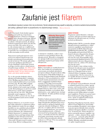 W ize r unek MIESIęCZNIK UBEZPIECZENIOWY Zaufanie jest filarem Zaniedbanie reputacji surowo mści się na biznesie. Rynek ubezpieczeniowy wpadł w zadyszkę, a mizerne zaufanie konsumentów jest jedną z głównych barier w przywróceniu mu dynamicznego rozwoju. – Mikołaj Skorupski S Słaby wizerunek i brak działań naprawczych na tym polu ma swoje konsekwencje finansowe. Dotyczy to każdego sektora, także ubezpieczeniowego. Klienci raczej nigdy nie mieli szczególnie dobrego zdania o ubezpieczeniach, ale takiego nasilenia negatywnych opinii, jak obecnie, jeszcze nie było. Nie zanosi się też na to, aby sytuacja miała się w najbliższych latach poprawić. Ubezpieczyciele stawiają na sprzedaż, bez szczególnego sentymentu dla wizerunku swoich marek. Tymczasem rynek pod naporem surowych ocen nadzoru finansowego oraz krytyki zawiedzionych konsumentów zaczął się kurczyć. W sytuacji, gdy jedną z przyczyn spadającej sprzedaży jest recesja, dotykająca wielu branż, powrót na drogę wzrostu zależy w dużej mierze od społecznego zaufania. Tym, którzy cieszą się dobrą reputacją, będzie łatwiej przywrócić prawidłowy rozwój. Tym zaś, którzy są w ogniu krytyki, grozi dalszy spadek sprzedaży. To, że oba zjawiska dotknęły sektora ubezpieczeń pokazują dane z ostatnich 10 lat. Według raportów KNF, do 2005 r. wzrost rynku kształtował się na poziomie od 10 do 15%. W roku 2006 osiągnął poziom 23,7%, a dwa lata później – aż 36,6%. Jednak to był ostatni tego rodzaju wynik. Rok później po raz pierwszy rynek skurczył się o 12,5%. Przez następne trzy lata rósł od 4 do 10%. Taki poziom dynamiki został osiągnięty w 2012 r. Danych za 2013 r. jeszcze nie ma, ale po trzech kwartałach rynek znowu zmalał o blisko 10%. Eksperci tłumaczą, że to przede wszystkim efekt załamania w segmencie polisolokat. Jednak nie wzięło się ono znikąd. Spotkały się one, podobnie jak produkty bancassurance, z falą krytyki ze strony zarówno klientów, jak i administracji. Nadzór finansowy w ostatnim czasie regularnie bierze pod lupę kolejne linie produktowe firm ubezpieczeniowych. UOKiK nakłada coraz większe kary, a Rzecznik Ubezpieczonych notuje coraz więcej skarg. Klienci szukają pomocy Mikołaj Skorupski jest właścicielem Good Message, agencji public relations, przez wiele lat kierował komunikacją firm i instytucji ubezpieczeniowych i finansowych. w internecie i mediach, a sądy w orzeczeniach są coraz bardziej surowe dla ubezpieczycieli. Wszystko to skrupulatnie opisują środki masowego przekazu, napędzając negatywną percepcję rynku ubezpieczeń. Wizerunek a biznes Wpływ wizerunku na wyniki finansowe firm, choć trudny do szczegółowego oszacowania, jest jednak zjawiskiem niezaprzeczalnym. Przeprowadzone kilka lat temu przez TNS Polska badania na zlecenie Instytutu Badawczego Rand stad, pokazały że 94% przedsiębiorców widzi związek między pozytywnym wizerunkiem a osiąganymi wynikami finansowymi (TNS; http://www.newsline. pl/praktykapublicrelations/artykuly/ art198,spojnosc-wizerunku-firmy.html). Jednak mimo to, duża część z nich, jeśli podejmuje działania, są to jedynie akcje jednorazowe, a nie zaplanowane strategie wizerunkowe. To także problem naszego rynku ubezpieczeń. Podobne badania przeprowadzono w Niemczech wśród spółek giełdowych (http://brandvalue.pl/budowania-wizerunku-spolek-w-grupach-kapitalowychcorporate-identity-holdingow/). Wykazały one, że wpływ, jaki ma wizerunek firm na wyniki finansowe, jest znaczący. W przedsiębiorstwach, w których wizerunek był profesjonalnie ukształtowany, w stosunku do firm bez dobrego wizerunku, przychody wzrosły (nawet do 40%), firmy powiększyły udziały rynkowe (z 34% do 71%) oraz podniosły zyski (średnio o 22%). 24 Zanik potrzeb Negatywne opinie klientów o ubezpieczeniach i ubezpieczycielach wpływają na skłonność do ubezpieczania się. A raczej na brak tej skłonności. Według badań CBOS-u, potrzeba zakupu ubezpieczenia jest najsilniejsza w odniesieniu do wypadków samochodowych oraz pożarów (CBOS; http://cbos.pl/ SPISKOM.POL/2013/K_087_13.PDF). W przypadku tych pierwszych 50% badanych odczuwa silną potrzebę ubezpieczania się, a kolejne 26% – odczuwa ją od czasu do czasu. W przypadku zabezpieczenia przed skutkami pożarów 28% ankietowanych odczuwa silną potrzebę ubezpieczenia się, a dalsze 33% odczuwa ją od czasu do czasu. Jeśli zaś chodzi o inne rodzaje ryzyka, skłonność do ubezpieczania się praktycznie nie istnieje. Szczególnie dotkliwie uderza to w ubezpieczenia na życie, z których Polacy rezygnują, uznając je za niepotrzebne. Nie bez znaczenia są też wpadki ubezpieczycieli na tym polu, szeroko opisywane w mediach. Agresja prawna Do opisanych wyżej problemów, doszedł w ostatnich latach jeszcze jeden: agresja prawna, czyli inaczej mówiąc, straszenie niezadowolonych klientów paragrafami. Nie jest to zresztą problem, w którym ubezpieczyciele byliby jakimś szczególnym wyjątkiem. Dotyczy on sporej części firm świadczących usługi długoterminowe, oparte na opłatach pobieranych systematycznie od klientów. Popularny blog Macieja Samcika, dziennikarza Gazety Wyborczej, przywołuje liczne przykłady. W jednym z nich opisywana jest sprawa klientki, która utraciła zdolność dźwigania składki w wysokości 3 tys. zł miesięcznie. Firma ubezpieczeniowa rozwiązała umowę i zgodnie z jej zapisami – a także, zdaniem firmy, zgodnie z prawem – potrąciła opłatę likwidacyjną w wysokości całości wpłaconych składek. Klientka zatrudniła prawnika i w sądzie wygrała sprawę. W ize r unek m a r zec 2 0 1 4 Inny klient, prowadząc samochód, zderzył się z sarną, a firma ubezpieczeniowa odmówiła wypłaty pełnego odszkodowania z uwagi na ocenę rzeczoznawcy, która zgodnie z procedurami wpływa na decyzję ubezpieczyciela. Tyle że, jak się okazało, ten nawet nie oglądał samochodu. Gdyby klient nie zawa