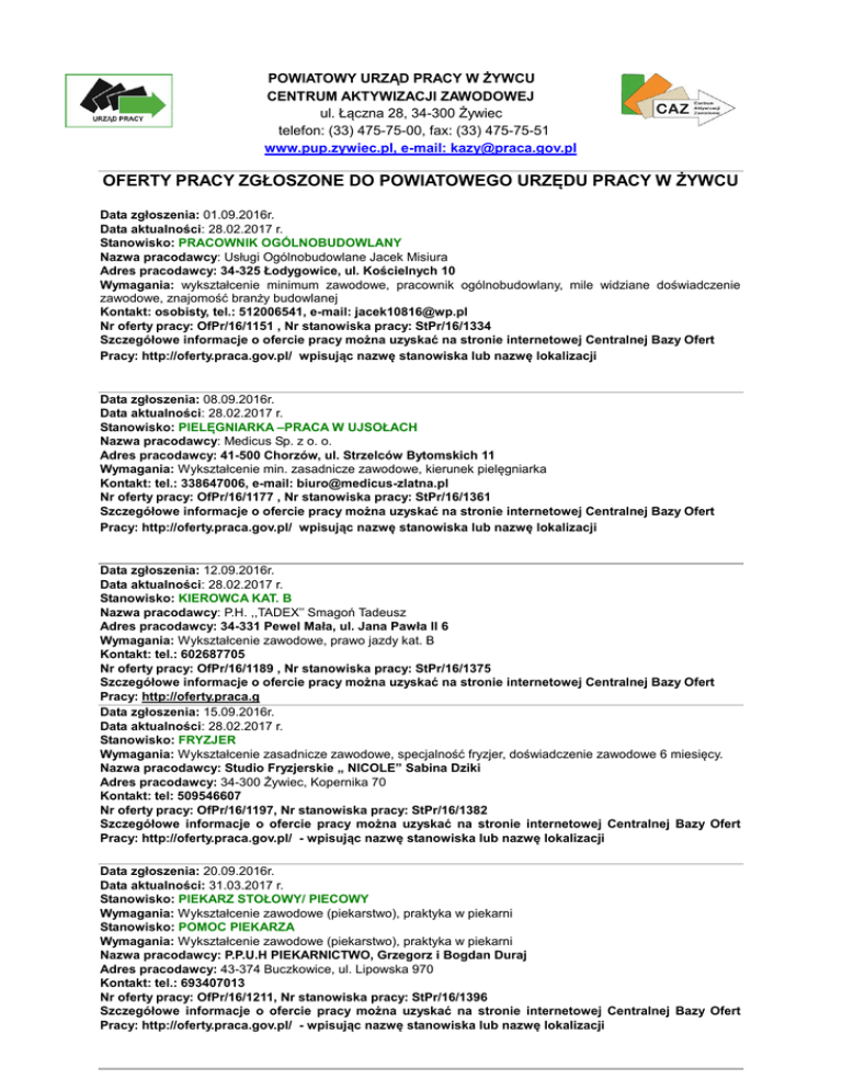 POWIATOWY URZĄD PRACY W ŻYWCU CENTRUM AKTYWIZACJI ZAWODOWEJ ul. Łączna 28, 34-300 Żywiec telefon: (33) 475-75-00, fax: (33) 475-75-51 www.pup.zywiec.pl, e-mail: [email protected] OFERTY PRACY ZGŁOSZONE DO POWIATOWEGO URZĘDU PRACY W ŻYWCU Data zgłoszenia: 01.09.2016r. Data aktualności: 28.02.2017 r. Stanowisko: PRACOWNIK OGÓLNOBUDOWLANY Nazwa pracodawcy: Usługi Ogólnobudowlane Jacek Misiura Adres pracodawcy: 34-325 Łodygowice, ul. Kościelnych 10 Wymagania: wykształcenie minimum zawodowe, pracownik ogólnobudowlany, mile widziane doświadczenie zawodowe, znajomość branży budowlanej Kontakt: osobisty, tel.: 512006541, e-mail: [email protected] Nr oferty pracy: OfPr/16/1151 , Nr stanowiska pracy: StPr/16/1334 Szczegółowe informacje o ofercie pracy można uzyskać na stronie internetowej Centralnej Bazy Ofert Pracy: http://oferty.praca.gov.pl/ wpisując nazwę stanowiska lub nazwę lokalizacji Data zgłoszenia: 08.09.2016r. Data aktualności: 28.02.2017 r. Stanowisko: PIELĘGNIARKA –PRACA W UJSOŁACH Nazwa pracodawcy: Medicus Sp. z o. o. Adres pracodawcy: 41-500 Chorzów, ul. Strzelców Bytomskich 11 Wymagania: Wykształcenie min. zasadnicze zawodowe, kierunek pielęgniarka Kontakt: tel.: 338647006, e-mail: [email protected] Nr oferty pracy: OfPr/16/1177 , Nr stanowiska pracy: StPr/16/1361 Szczegółowe informacje o ofercie pracy można uzyskać na stronie internetowej Centralnej Bazy Ofert Pracy: http://oferty.praca.gov.pl/ wpisując nazwę stanowiska lub nazwę lokalizacji Data zgłoszenia: 12.09.2016r. Data aktualności: 28.02.2017 r. Stanowisko: KIEROWCA KAT. B Nazwa pracodawcy: P.H. ,,TADEX’’ Smagoń Tadeusz Adres pracodawcy: 34-331 Pewel Mała, ul. Jana Pawła II 6 Wymagania: Wykształcenie zawodowe, prawo jazdy kat. B Kontakt: tel.: 602687705 Nr oferty pracy: OfPr/16/1189 , Nr stanowiska pracy: StPr/16/1375 Szczegółowe informacje o ofercie pracy można uzyskać na stronie internetowej Centralnej Bazy Ofert Pracy: http://oferty.praca.g Data zgłoszenia: 15.09.2016r. Data aktualności: 28.02.2017 r. Stanowisko: FRYZJER Wymagania: Wykształcenie zasadnicze zawodowe, specjalność fryzjer, doświadczenie zawodowe 6 miesięcy. Nazwa pracodawcy: Studio Fryzjerskie „ NICOLE” Sabina Dziki Adres pracodawcy: 34-300 Żywiec, Kopernika 70 Kontakt: tel: 509546607 Nr oferty pracy: OfPr/16/1197, Nr stanowiska pracy: StPr/16/1382 Szczegółowe informacje o ofercie pracy można uzyskać na stronie internetowej Centralnej Bazy Ofert Pracy: http://oferty.praca.gov.pl/ - wpisując nazwę stanowiska lub nazwę lokalizacji Data zgłoszenia: 20.09.2016r. Data aktualności: 31.03.2017 r. Stanowisko: PIEKARZ STOŁOWY/ PIECOWY Wymagania: Wykształcenie zawodowe (piekarstwo), praktyka w piekarni Stanowisko: POMOC PIEKARZA Wymagania: Wykształcenie zawodowe (piekarstwo), praktyka w piekarni Nazwa pracodawcy: P.P.U.H PIEKARNICTWO, Grzegorz i Bogdan Duraj Adres pracodawcy: 43-374 Buczkowice, ul. Lipowska 970 Kontakt: tel.: 693407013 Nr oferty pracy: OfPr/16/1211, Nr stanowiska pracy: StPr/16/1396 Szczegółowe informacje o ofercie pracy można uzyskać na stronie internetowej Centralnej Bazy Ofert Pracy: http://oferty.praca.gov.pl/ - wpisując nazwę stanowiska lub nazwę lokalizacji Data zgłoszenia: 26.09.2016r. Data aktualności: 31.01.2017 r. Stanowisko: TARTACZNIK Wymagania: Wykształcenie zawodowe. Nazwa pracodawcy: P.P.H.U. Tartak Wróbel Adres pracodawcy: 34-371 Ujsoły Kontakt: tel.: 602616076 Nr oferty pracy: OfPr/16/1228, Nr stanowiska pracy: StPr/16/1417 Szczegółowe informacje o ofercie pracy można uzyskać na stronie internetowej Centralnej Bazy Ofert Pracy: http://oferty.praca.gov.pl/ - wpisując nazwę stanowiska lub nazwę lokalizacji Data zgłoszenia: 03.10.2016r. Data aktualności: 28.02.2017 r. Stanowisko: KASJER/SPRZEDAWCA Wymagania: Mile widziane doświadczenie w branży handlowej. Nazwa pracodawcy: F.H.U. Krakoil Piotr Dańko Stacja Paliw Cisiec Adres pracodawcy: 31-710 Kraków, ul. B. Wstydliwego 14 Kontakt: tel.: 33 8642714 Nr oferty pracy: OfPr/16/1247, Nr stanowiska pracy: StPr/16/1436 Szczegółowe informacje o ofercie pracy można uzyskać na stronie internetowej Centralnej Bazy Ofert Pracy: http://oferty.praca.gov.pl/ - wpisując nazwę stanowiska lub nazwę lokalizacji. Data zgłoszenia: 03.10.2016r. Data aktualności: 28.02.2017 r. Stanowisko: PIEKARZ Wymagania: Wykształcenie zawodowe, specjalność piekarz, mile widziane doświadczenie zawodowe i świadectwo uprawniające do obsługi pieca piekarniczego. Nazwa pracodawcy: PSS „SPOŁEM „ Węgierska Górka Adres pracodawcy: 34-350 Węgierska Górka, ul. Kościuszki 32 Kontakt: tel.: 33 8641408 Nr oferty pracy: OfPr/16/1245, Nr stanowiska pracy: StPr/16/1434 Szczegółowe informacje o ofercie pracy można uzyskać na stronie internetowej Centralnej Bazy Ofert Pracy: http://oferty.praca.gov.pl/ - wpisując nazwę stanowiska lub nazwę lokalizacji Data zgłoszenia: 10.10.2016r. Data aktualności: 28.02.2017 r. Stanowisko: KASJER / SPRZEDAWCA Wymagania: Prawo jazdy kat. B Nazwa pracodawcy: Usługi Budowlane Stanisław Pinczer Adres pracodawcy: 34-340 Jeleśnia, ul. Starowiejska 16 Kontakt: tel. 602256096 Nr oferty pracy: OfPr/16/1273, Nr stanowiska pracy: StPr/16/1464 Szczegółowe informacje o ofercie pracy można uzyskać na stronie internetowej Centralnej Bazy Ofert Pracy: http://oferty.praca.gov.pl/ - wpisując nazwę stanowiska lub nazwę lokalizacji Data zgłoszenia: 11.10.2016r. Data aktualności: 28.02.2017 r. Stanowisko: STOLARZ Wymagania: wykształcenie zawodowe, o kierunku stolarz,, mile widziane doświadczenie zawodowe, mile widziane prawo jazdy kat. B. Nazwa pracodawcy: Przedsiębiorstwo Produkcyjno-Handlowo- Usługowe Krzysztof Kocierz. Adres pracodawcy: 34-300 Żywiec, ul. Wiosenna 9 Kontakt: tel. 602678255, e-mail: [email protected] Nr oferty pracy: OfPr/16/1280, Nr stanowiska pracy: StPr/16/1472 Szczegółowe informacje o ofercie pracy można uzyskać na stronie internetowej Central