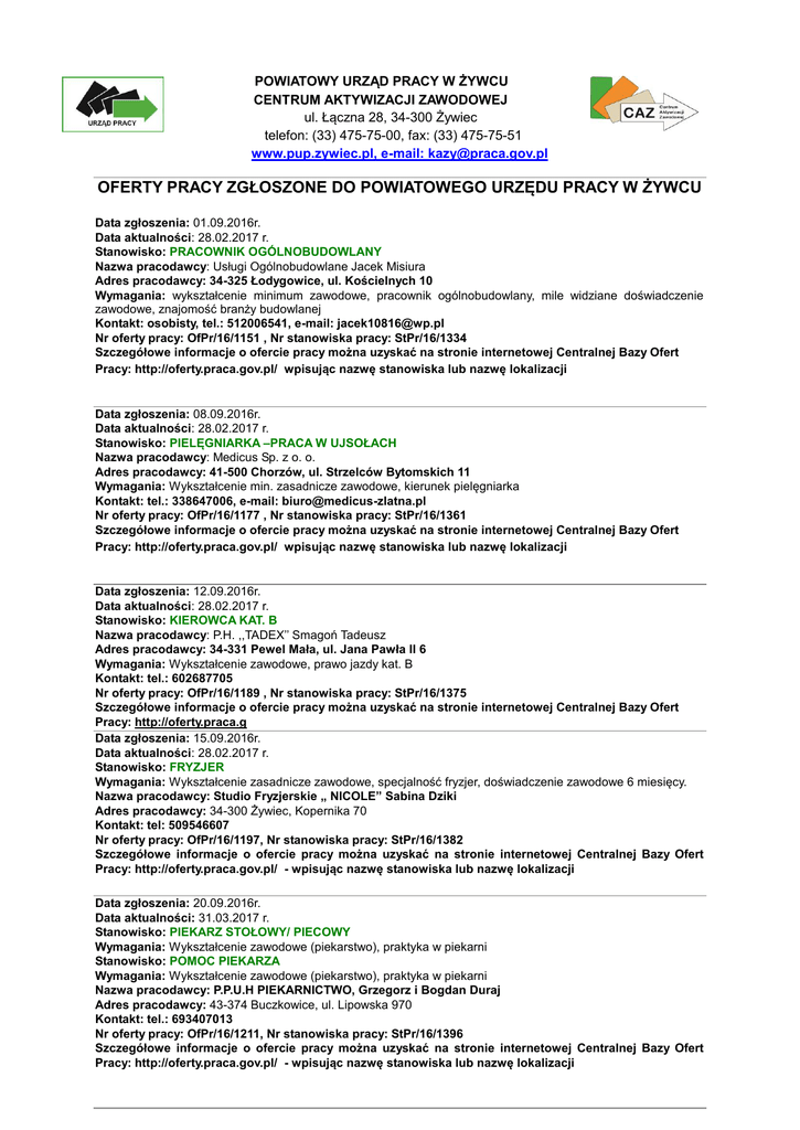 Oferty pracy zgłaszane do Powiatowego Urzędu Pracy w Żywcu