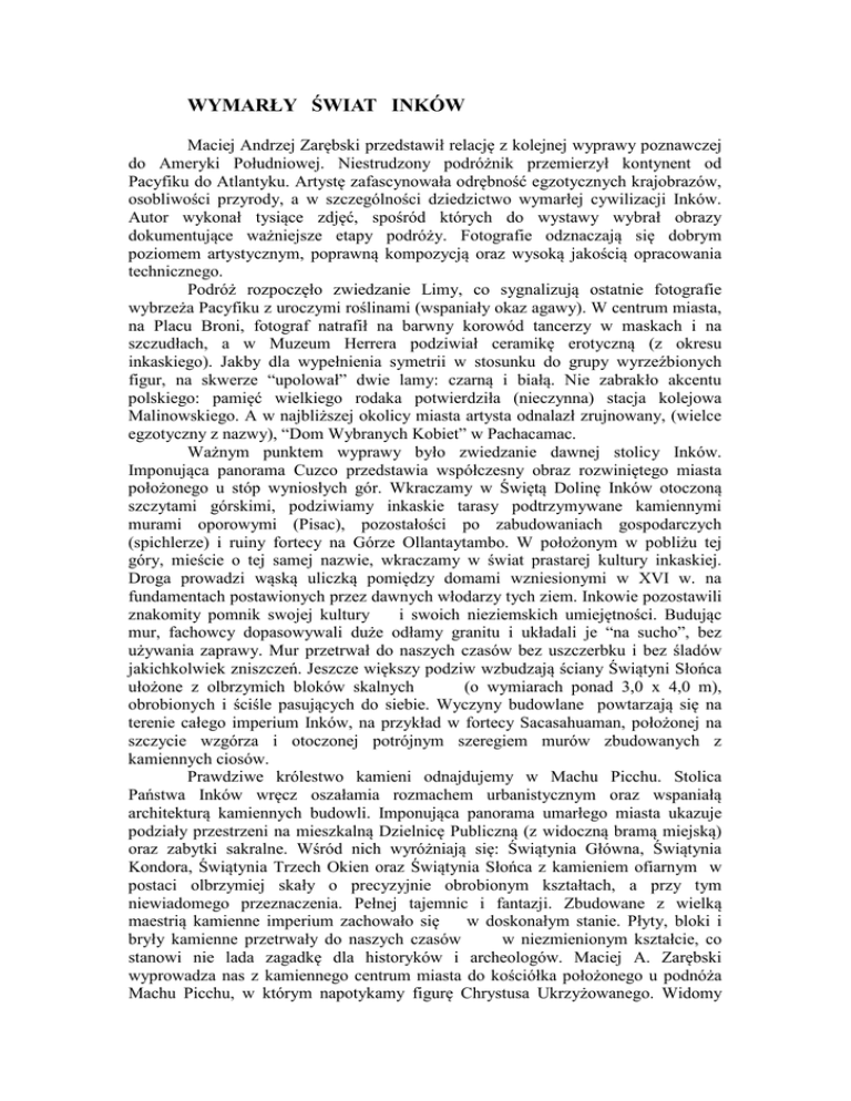 WYMARŁY ŚWIAT INKÓW Maciej Andrzej Zarębski przedstawił relację z kolejnej wyprawy poznawczej do Ameryki Południowej. Niestrudzony podróżnik przemierzył kontynent od Pacyfiku do Atlantyku. Artystę zafascynowała odrębność egzotycznych krajobrazów, osobliwości przyrody, a w szczególności dziedzictwo wymarłej cywilizacji Inków. Autor wykonał tysiące zdjęć, spośród których do wystawy wybrał obrazy dokumentujące ważniejsze etapy podróży. Fotografie odznaczają się dobrym poziomem artystycznym, poprawną kompozycją oraz wysoką jakością opracowania technicznego. Podróż rozpoczęło zwiedzanie Limy, co sygnalizują ostatnie fotografie wybrzeża Pacyfiku z uroczymi roślinami (wspaniały okaz agawy). W centrum miasta, na Placu Broni, fotograf natrafił na barwny korowód tancerzy w maskach i na szczudłach, a w Muzeum Herrera podziwiał ceramikę erotyczną (z okresu inkaskiego). Jakby dla wypełnienia symetrii w stosunku do grupy wyrzeźbionych figur, na skwerze “upolował” dwie lamy: czarną i białą. Nie zabrakło akcentu polskiego: pamięć wielkiego rodaka potwierdziła (nieczynna) stacja kolejowa Malinowskiego. A w najbliższej okolicy miasta artysta odnalazł zrujnowany, (wielce egzotyczny z nazwy), “Dom Wybranych Kobiet” w Pachacamac. Ważnym punktem wyprawy było zwiedzanie dawnej stolicy Inków. Imponująca panorama Cuzco przedstawia współczesny obraz rozwiniętego miasta położonego u stóp wyniosłych gór. Wkraczamy w Świętą Dolinę Inków otoczoną szczytami górskimi, podziwiamy inkaskie tarasy podtrzymywane kamiennymi murami oporowymi (Pisac), pozostałości po zabudowaniach gospodarczych (spichlerze) i ruiny fortecy na Górze Ollantaytambo. W położonym w pobliżu tej góry, mieście o tej samej nazwie, wkraczamy w świat prastarej kultury inkaskiej. Droga prowadzi wąską uliczką pomiędzy domami wzniesionymi w XVI w. na fundamentach postawionych przez dawnych włodarzy tych ziem. Inkowie pozostawili znakomity pomnik swojej kultury i swoich nieziemskich umiejętności. Budując mur, fachowcy dopasowywali duże odłamy granitu i układali je “na sucho”, bez używania zaprawy. Mur przetrwał do naszych czasów bez uszczerbku i bez śladów jakichkolwiek zniszczeń. Jeszcze większy podziw wzbudzają ściany Świątyni Słońca ułożone z olbrzymich bloków skalnych (o wymiarach ponad 3,0 x 4,0 m), obrobionych i ściśle pasujących do siebie. Wyczyny budowlane powtarzają się na terenie całego imperium Inków, na przykład w fortecy Sacasahuaman, położonej na szczycie wzgórza i otoczonej potrójnym szeregiem murów zbudowanych z kamiennych ciosów. Prawdziwe królestwo kamieni odnajdujemy w Machu Picchu. Stolica Państwa Inków wręcz oszałamia rozmachem urbanistycznym oraz wspaniałą architekturą kamiennych budowli. Imponująca panorama umarłego miasta ukazuje podziały przestrzeni na mieszkalną Dzielnicę Publiczną (z widoczną bramą miejską) oraz zabytki sakralne. Wśród nich wyróżniają się: Świątynia Główna, Świątynia Kondora, Świątynia Trzech Okien oraz Świątynia Słońca z kamieniem ofiarnym w postaci olbrzymiej skały o precyzyjnie obrobionym kształtach, a przy tym niewiadomego przeznaczenia. Pełnej tajemnic i fantazji. Zbudowane z wielką maestrią kamienne imperium zachowało się w doskonałym stanie. Płyty, bloki i bryły kamienne przetrwały do naszych czasów w niezmienionym kształcie, co stanowi nie lada zagadkę dla historyków i archeologów. Maciej A. Zarębski wyprowadza nas z kamiennego centrum miasta do kościółka położonego u podnóża Machu Picchu, w którym napotykamy figurę Chrystusa Ukrzyżowanego. Widomy znak przemiany społecznej i cywilizacyjnej krainy. Autor wystawy przywołał powszechnie znane obrazy świata dawno minionego, utrwalił je w formie zapisu cyfrowego i podzielił się swoimi spostrzeżeniami z widzami wystawy. Należy oczekiwać, że znany ze swojej twórczości pisarskiej artysta podzieli się z czytelnikami własnymi obserwacjami i przemyśleniami w zapowiedzianym, kolejnym tomie “Wspomnień z podróży”. Paweł Pierściński