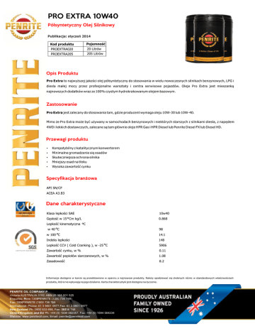 PRO EXTRA 10W40 Pó syntetyczny Olej Silnikowy Publikacja: styczeń 2014 Kod produktu Pojemność PROEXTRA020 20 Litrów PROEXTRA205 205 Litrów Opis Produktu Pro Extra to najwyższej jakości olej półsyntetyczny do stosowania w wielu nowoczesnych silnikach benzynowych, LPG i diesla małej mocy przez profesjonalne warsztaty i centra serwisowe pojazdów. Oleje Pro Extra jest mieszanką najnowszych dodatków wraz ze 100% czystym hydrokrakowanym olejem bazowym. Zastosowanie Pro Extra jest zalecany do stosowania tam, gdzie producent wymaga oleju 10W-30 lub 10W-40. Mimo że Pro Extra może być używany w samochodach benzynowych i niektórych starszych z silnikami diesla, z napędem 4WD i lekkich dostawczych, zalecane są tam głównie oleje HPR Gas i HPR Diesel lub Penrite Diesel FX lub Diesel HD. Przewagi produktu Kompatybilny z katalitycznym konwerterem Minimalne gromadzenie się osadów Skuteczniejsza ochrona silnika Mniejszy osad na tłoku Wysoka zawartość cynku Specy kacja bran owa API SN/CF ACEA A3.B3 Dane charakterystyczne Klasa lepkości SAE 10w40 Gęstość w 15 ° Cm kg/L 0.868 Lepkość kinematyczna °C w 40 °C 98 w 100 °C 14.1 Indeks lepkości 148 Lepkość CCV ( Cold Cranking ), w -25 °C 5906 Zawartość cynku, w % 0.11 Zawartość popiołów siarczanowych, w % 1.08 Zasadowość 8.2 Informacje dostępne w karcie są przedstawione w oparciu o najnowsze produkty. Należy spodziewać się drobnych różnic w standardowych właściwościach produktu, które nie wpływają na jego działanie. Karta charakterystyki jest dostępna na życzenie. TY LTD, 88 Lewis Road, Wantirna South PENRITE OIL COMPANY P Victoria AUSTRALIA 3152, ABN 25 005 001 525 Enquiries: h Pone 1300-PENRITE (1300 736 748) Fax: 1800 -PENRITE (1800 736 748 ) International: Phone: 61 3 9801 0877,Fax: 61 3 9801 0977 New Zealand Ph: 0800 533 698, Fax: 050 8 736 748 United Kingdom and EU Ph: +44 (0) 1594 562357, Fax: +44 (0) 1594 564234 Website: www.penriteoil.com, Email: [email protected]