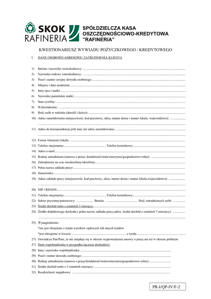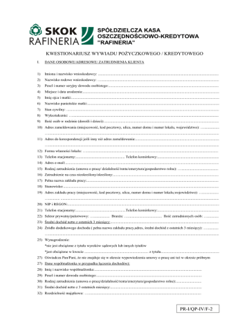 SPÓŁDZIELCZA KASA OSZCZĘDNOŚCIOWO-KREDYTOWA ”RAFINERIA” KWESTIONARIUSZ WYWIADU POŻYCZKOWEGO / KREDYTOWEGO I. DANE OSOBOWE/ADRESOWE/ ZATRUDNIENIA KLIENTA 1) Imiona i nazwisko wnioskodawcy: ................................................................................................................................ 2) Nazwisko rodowe wnioskodawcy: …............................................................................................................................. 3) Pesel i numer seryjny dowodu osobistego:..................................................................................................................... 4) Miejsce i data urodzenia:................................................................................................................................................. 5) Imię ojca i matki:............................................................................................................................................................. 6) Nazwisko panieńskie matki:............................................................................................................................................ 7) Stan cywilny: .................................................................................................................................................................. 8) Wykształcenie: …........................................................................................................................................................... 9) Ilość osób w rodzinie (dorośli i dzieci):.......................................................................................................................... 10) Adres zameldowania (miejscowość, kod pocztowy, ulica, numer domu i numer lokalu, województwo): …................ …..................................................................................................................................................................................... 11) Adres do korespondencji jeśli inny niż adres zameldowania:......................................................................................... …..................................................................................................................................................................................... 12) Forma własności lokalu: …............................................................................................................................................ 13) Telefon stacjonarny:.................................................... Telefon komórkowy:................................................................. 14) Adres e-mail:................................................................................................................................................................... 15) Rodzaj zatrudnienia (umowa o pracę/ działalność/renta/emerytura/gospodarstwo rolne): …....................................... 16) Zatrudnienie na czas nieokreślony/określony:................................................................................................................ 17) Pełna nazwa zakładu pracy:............................................................................................................................................ 18) Stanowisko:..................................................................................................................................................................... 19) Adres zakładu pracy (miejscowość, kod pocztowy, ulica, numer domu i numer lokalu,województwo): …................. …............ ........................................................................................................................................................................ 20) NIP i REGON:................................................................................................................................................................. 21) Telefon stacjonarny:.....................................................Telefon komórkowy:................................................................. 22) Sektor prywatny/państwowy: …................. Branża: ….................................... Ilość zatrudnionych osób: …............ 23) Średni dochód netto z ostatnich 3 miesięcy:................................................................................................................... 24) Źródło dodatkowego dochodu ( pełna nazwa zakładu pracy,adres, średni dochód z ostatnich 3 miesięcy): …............ …..................................................................................................................................................................................... 25) Wynagrodzenie: *nie jest obciążone z tytułu wyroków sądowych lub innych tytułów *jest obciążone w kwocie .................................................................... z tytułu.............................................................. 27) Oświadcza Pan/Pani, że nie znajduje się w okresie wypowiedzenia umowy o pracę ani też w okresie próbnym 27) Dane współmałżonka w przypadku łączenia dochodów): 28) Imię i nazwisko współmałżonka:.................................................................................................................. 29) Pesel i numer dowodu osobistego:................................................................................................................ 30) Rodzaj zatrudnienia (umowa o pracę/działalność/renta/emerytura/gospodarstwo rolne):........................... 31) Średni dochód netto z 3 ostatnich miesięcy:................................................................................................. 32) Rozdzielność majątkowa: …........................................................................................................................ PR-I/QP-IV/F-2 II. ZOBOWIĄZANIA W INYCH INST