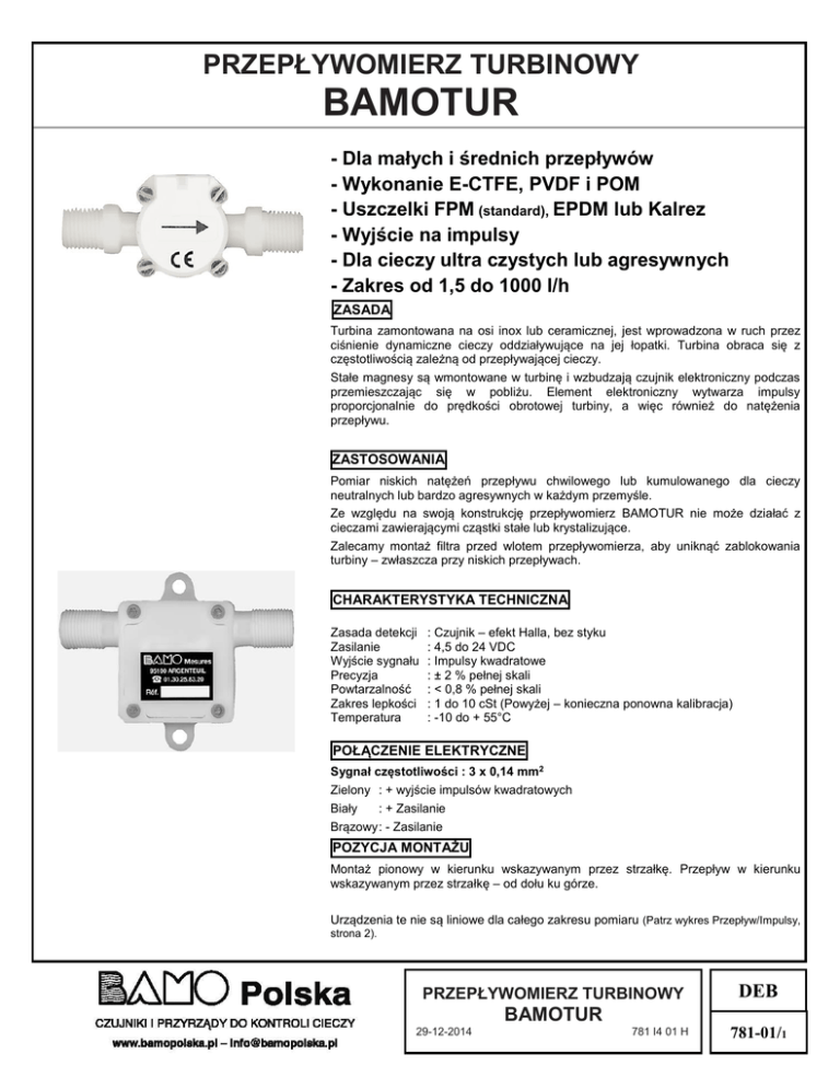 PRZEPŁYWOMIERZ TURBINOWY BAMOTUR - Dla małych i średnich przepływów - Wykonanie E-CTFE, PVDF i POM - Uszczelki FPM (standard), EPDM lub Kalrez - Wyjście na impulsy - Dla cieczy ultra czystych lub agresywnych - Zakres od 1,5 do 1000 l/h ZASADA Turbina zamontowana na osi inox lub ceramicznej, jest wprowadzona w ruch przez ciśnienie dynamiczne cieczy oddziaływujące na jej łopatki. Turbina obraca się z częstotliwością zależną od przepływającej cieczy. Stałe magnesy są wmontowane w turbinę i wzbudzają czujnik elektroniczny podczas przemieszczając się w pobliżu. Element elektroniczny wytwarza impulsy proporcjonalnie do prędkości obrotowej turbiny, a więc również do natężenia przepływu. ZASTOSOWANIA Pomiar niskich natężeń przepływu chwilowego lub kumulowanego dla cieczy neutralnych lub bardzo agresywnych w każdym przemyśle. Ze względu na swoją konstrukcję przepływomierz BAMOTUR nie może działać z cieczami zawierającymi cząstki stałe lub krystalizujące. Zalecamy montaż filtra przed wlotem przepływomierza, aby uniknąć zablokowania turbiny – zwłaszcza przy niskich przepływach. CHARAKTERYSTYKA TECHNICZNA Zasada detekcji Zasilanie Wyjście sygnału Precyzja Powtarzalność Zakres lepkości Temperatura : Czujnik – efekt Halla, bez styku : 4,5 do 24 VDC : Impulsy kwadratowe : ± 2 % pełnej skali : < 0,8 % pełnej skali : 1 do 10 cSt (Powyżej – konieczna ponowna kalibracja) : -10 do + 55°C POŁĄCZENIE ELEKTRYCZNE Sygnał częstotliwości : 3 x 0,14 mm2 Zielony : + wyjście impulsów kwadratowych Biały : + Zasilanie Brązowy : - Zasilanie POZYCJA MONTAŻU Montaż pionowy w kierunku wskazywanym przez strzałkę. Przepływ w kierunku wskazywanym przez strzałkę – od dołu ku górze. Urządzenia te nie są liniowe dla całego zakresu pomiaru (Patrz wykres Przepływ/Impulsy, strona 2). PRZEPŁYWOMIERZ TURBINOWY DEB BAMOTUR 29-12-2014 781 I4 01 H 781-01/1 Zakres przepływu [l/h] Materiał BAMOTUR Korpus Oś Uszczelki 781 106 BAMOTUR 7201 1,5 do 100 POM Inox FPM 781 109 BAMOTUR 7203 6 do 250 POM Inox 781 111 BAMOTUR 7241 1,5 do 100 POM 781 113 BAMOTUR 7243 6 do 250 781 126 BAMOTUR 7701 781 139 Kod Nr ref. Przyłącze T maks. Waga [°C] [g] Imp/litr Plan gładkie 6/8 mm 55 50 10 200 B FPM gładkie 9 mm 55 50 3 400 A Inox FPM ¼” 55 50 10 200 C POM Inox FPM ¼” 55 50 3 400 C 1,5 do 100 PVDF Inox FPM gładkie 6/8 mm 55 50 10 200 B BAMOTUR 7703 6 do 250 PVDF Inox FPM gładkie 9 mm 55 50 3 400 A 781 144 BAMOTUR 7901 1,5 do 100 E-CTFE Szafir FPM ¼” 55 100 10 200 F 781 154 BAMOTUR 7903 6 do 250 E-CTFE Szafir FPM ¼” 55 100 3 400 F 781 158 BAMOTUR 72R4 30 do 1000 POM Inox FPM ⅜” 55 100 152 D 781 165 BAMOTUR 79R4 30 do 1000 E-CTFE Ceram. FPM ⅜” 55 100 152 D Pierścień w danym kolorze na kablu pozwala ustalić rodzaj uszczelki. Pierścień zielony : Viton – czarny : EPDM – biały : Kalrez Wykres górny: Modele ...01/...41; Wykres dolny: Modele …03/…43 Modele …R4 nie przedstawione PRZEPŁYWOMIERZ TURBINOWY DEB BAMOTUR 29-12-2014 781 I4 01 H 781-01/2