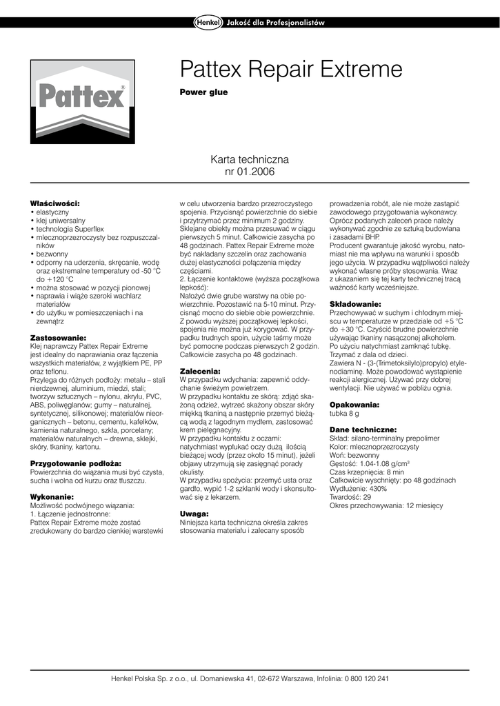 Pattex Repair Extreme Power glue Karta techniczna nr 01.2006 Właściwości: • elastyczny • klej uniwersalny • technologia Superflex • mlecznoprzezroczysty bez rozpuszczalników • bezwonny • odporny na uderzenia, skręcanie, wodę oraz ekstremalne temperatury od -50 °C do +120 °C • można stosować w pozycji pionowej • naprawia i wiąże szeroki wachlarz materiałów • do użytku w pomieszczeniach i na zewnątrz Zastosowanie: Klej naprawczy Pattex Repair Extreme jest idealny do naprawiania oraz łączenia wszystkich materiałów, z wyjątkiem PE, PP oraz teflonu. Przylega do różnych podłoży: metalu – stali nierdzewnej, aluminium, miedzi, stali; tworzyw sztucznych – nylonu, akrylu, PVC, ABS, poliwęglanów; gumy – naturalnej, syntetycznej, silikonowej; materiałów nieorganicznych – betonu, cementu, kafelków, kamienia naturalnego, szkła, porcelany; materiałów naturalnych – drewna, sklejki, skóry, tkaniny, kartonu. Przygotowanie podłoża: Powierzchnia do wiązania musi być czysta, sucha i wolna od kurzu oraz tłuszczu. Wykonanie: Możliwość podwójnego wiązania: 1. Łączenie jednostronne: Pattex Repair Extreme może zostać zredukowany do bardzo cienkiej warstewki w celu utworzenia bardzo przezroczystego spojenia. Przycisnąć powierzchnie do siebie i przytrzymać przez minimum 2 godziny. Sklejane obiekty można przesuwać w ciągu pierwszych 5 minut. Całkowicie zasycha po 48 godzinach. Pattex Repair Extreme może być nakładany szczelin oraz zachowania dużej elastyczności połączenia między częściami. 2. Łączenie kontaktowe (wyższa początkowa lepkość): Nałożyć dwie grube warstwy na obie powierzchnie. Pozostawić na 5-10 minut. Przycisnąć mocno do siebie obie powierzchnie. Z powodu wyższej początkowej lepkości, spojenia nie można już korygować. W przypadku trudnych spoin, użycie taśmy może być pomocne podczas pierwszych 2 godzin. Całkowicie zasycha po 48 godzinach. Zalecenia: W przypadku wdychania: zapewnić oddychanie świeżym powietrzem. W przypadku kontaktu ze skórą: zdjąć skażoną odzież, wytrzeć skażony obszar skóry miękką tkaniną a następnie przemyć bieżącą wodą z łagodnym mydłem, zastosować krem pielęgnacyjny. W przypadku kontaktu z oczami: natychmiast wypłukać oczy dużą ilością bieżącej wody (przez około 15 minut), jeżeli objawy utrzymują się zasięgnąć porady okulisty. W przypadku spożycia: przemyć usta oraz gardło, wypić 1-2 szklanki wody i skonsultować się z lekarzem. Uwaga: Niniejsza karta techniczna określa zakres stosowania materiału i zalecany sposób prowadzenia robót, ale nie może zastąpić zawodowego przygotowania wykonawcy. Oprócz podanych zaleceń prace należy wykonywać zgodnie ze sztuką budowlana i zasadami BHP. Producent gwarantuje jakość wyrobu, natomiast nie ma wpływu na warunki i sposób jego użycia. W przypadku wątpliwości należy wykonać własne próby stosowania. Wraz z ukazaniem się tej karty technicznej tracą ważność karty wcześniejsze. Składowanie: Przechowywać w suchym i chłodnym miejscu w temperaturze w przedziale od +5 °C do +30 °C. Czyścić brudne powierzchnie używając tkaniny nasączonej alkoholem. Po użyciu natychmiast zamknąć tubkę. Trzymać z dala od dzieci. Zawiera N - (3-(Trimetoksilylo)propylo) etylenodiaminę. Może powodować wystąpienie reakcji alergicznej. Używać przy dobrej wentylacji. Nie używać w pobliżu ognia. Opakowania: tubka 8 g Dane techniczne: Skład: silano-terminalny prepolimer Kolor: mlecznoprzezroczysty Woń: bezwonny Gęstość: 1.04-1.08 g/cm3 Czas krzepnięcia: 8 min Całkowicie wyschnięty: po 48 godzinach Wydłużenie: 430% Twardość: 29 Okres przechowywania: 12 miesięcy Henkel Polska Sp. z o.o., ul. Domaniewska 41, 02-672 Warszawa, Infolinia: 0 800 120 241