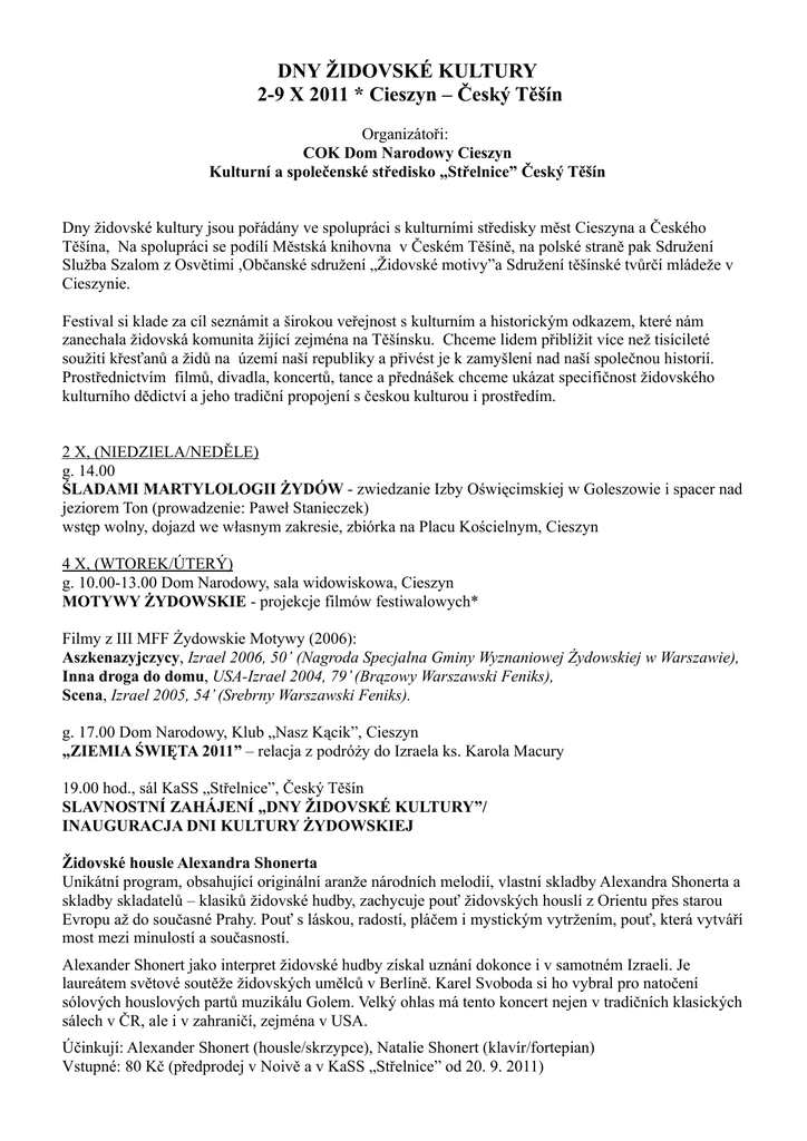DNY ŽIDOVSKÉ KULTURY 2-9 X 2011 * Cieszyn – Český Těšín