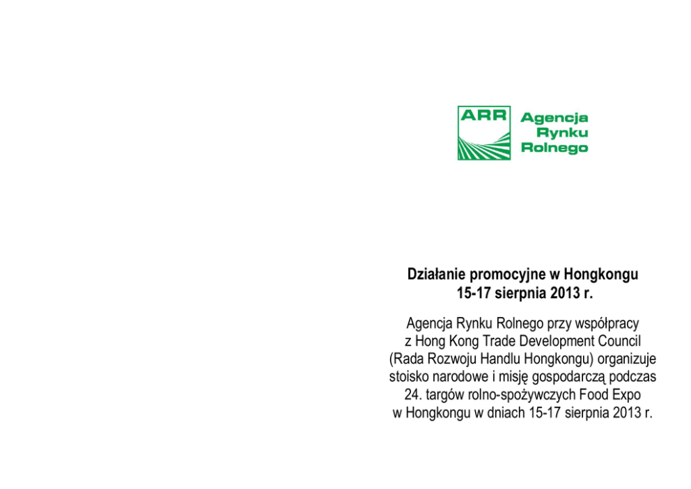 Dzia anie promocyjne w Hongkongu 15-17 sierpnia 2013 r. Agencja Rynku Rolnego przy wspó pracy z Hong Kong Trade Development Council (Rada Rozwoju Handlu Hongkongu) organizuje stoisko narodowe i misj gospodarcz podczas 24. targów rolno-spo ywczych Food Expo w Hongkongu w dniach 15-17 sierpnia 2013 r. Hongkong: Atrakcyjna alternatywa wej cia na rynek chi ski, „brama do Chin” dla rynku spo ywczego i alkoholowego, ok. 7 mln ludno ci i du e centrum reeksportu ywno ci w Azji, od lat 1 miejsce we Wska niku Wolno ci Gospodarczej (Index of Economic Freedom), najbardziej liberalna gospodarka wiata, jedno ze wiatowych centrów handlu i finansów oraz logistycznoprze adunkowe, miejsce z najwy szymi na wiecie warto ciami eksportu i importu na mieszka ca, stabilna, po czona z dolarem ameryka skim waluta, niskie podatki, marginalny udzia rolnictwa w gospodarce regionu i zapotrzebowanie na importowane artyku y rolno-spo ywcze. Food Expo to jedna z najwi kszych imprez targowych sektora spo ywczego w Azji. Udzia w targach spo ywczych Food Expo b dzie okazj dla polskich przedsi biorców, aby nawi za kontakty handlowe w Hongkongu a poprzez Hongkong z Chinami i innymi rynkami azjatyckimi. Targi podzielone s na strefy: Public Hall, Gourmet Zone i Trade Hall. W Food Expo 2012 wzi o udzia 1.110 wystawców z 26 krajów i regionów. Ubieg oroczn edycj odwiedzi o 16.627 przedsi biorców z 51 krajów i regionów oraz 390.000 osób prywatnych (wst p tylko do Public Hall i Gourmet Zone). Do udzia u w targach Food Expo zaproszeni s producenci i eksporterzy produktów spo ywczych, produktów i us ug pokrewnych: pieczywo, herbatniki, przek ski, wyroby cukiernicze, s odycze, napoje alkoholowe i bezalkoholowe, mro onki, produkty suszone, w puszkach i o przed onej trwa ci, dania instant i do szybkiego przyrz dzenia, sosy i polewy, ry , kluski i makarony, produkty mleczarskie, owoce i warzywa, produkty zdrowotne i ekologiczne, mi so i drób, opakowania, etykiety, przetwarzanie ywno ci: produkty, sprz t i us ugi. 24. edycja targów odb dzie si w dniach 15-19 sierpnia 2013 r. Szczegó owe informacje na temat targów Food Expo znajduj si na stronie internetowej: http://hkfoodexpo.hktdc.com Dzia anie promocyjne realizowane przez ARR dotyczy targów odbywaj cych si w strefie specjalistycznej Trade Hall w dniach 15-17 sierpnia 2013 r. Planowany termin misji handlowej: wylot z Polski – 13 sierpnia 2013 r. wylot z Hongkongu– 18 sierpnia 2013 r. W ramach dzia promocyjnych w Hongkongu ARR zorganizuje: 1) narodowe stoisko informacyjno – promocyjne na targach Food Expo, na którym polscy przedsi biorcy b mogli prezentowa i promowa swoj ofert , 2) sesje spotka B2B z przedsi biorcami z Hongkongu i Chin, 3) spotkanie z ekspertami HKTDC (Rady Rozwoju Handlu Hongkongu). oraz innych wspólnych spotka organizowanych przez ARR i HKTDC. Uwaga – mo liwo uzyskania dofinansowania! Uprzejmie informujemy, e istnieje mo liwo uzyskania dofinansowania ze rodków pomocy de minimis Ministerstwa Gospodarki dla polskich przedsi biorców z bran y rolnospo ywczej. Oferta ARR: Mo liwo skorzystania z oferty prezentacji Pa stwa firmy na powierzchni wykupionej w ramach stoiska narodowego na targach Food Expo ( czna powierzchnia 54 m²) w Trade Hall, mo liwo bezp atnego udzia u w us udze typu business matching z udzia em firm z Hongkongu i Chin zainteresowanymi nawi zaniem wspó pracy handlowej z polskimi przedsi biorcami, mo liwo skorzystania ze zorganizowanej przez ARR spedycji na targi do 10 kg materia ów informacyjnych i promocyjnych oraz próbek produktów (towar b dzie przewo ony w warunkach ch odniczych powy ej 0°C oraz w warunkach temperatury pokojowej – zale nie od potrzeb; wysy ane b tylko produkty, które mog pomy lnie przej odpraw celn ; (transport powrotny nie jest przewidziany), bezp atna rezerwacja przez ARR i HKTDC noclegów w South Pacific Hotel w cenie ok. 1.080 HK$ za nocleg za osob w pokoju dwuosobowym do pojedynczego wykorzystania (cena niadania: dodatkowo ok. 60 HK$ za 1 posi ek), zapewniony bezp atny transport lokalny na miejscu dla uczestników misji, którzy zdecyduj si na hotel i po czenie lotnicze wskazane przez ARR, zapewniona bezp atna obs uga na stoisku przynajmniej 2 umaczy z j zyka angielskiego, równie podczas spotka B2B Warunkiem jest z enie przez Agencj Rynku Rolnego (koordynatora projektu bran owego) zbiorczego wniosku o dofinansowanie w Ministerstwie Gospodarki. ARR wyst pi z wnioskiem do MG wy cznie w przypadku zebrania grupy co najmniej 5 przedsi biorców z sektora rolno-spo ywczego. Wielko dofinansowania nie mo e przekroczy 50% kosztów netto kwalifikuj cych si do obj cia pomoc , jednak nie wi cej ni 8.000 z na jednego przedsi biorc . Kosztami kwalifikuj cymi si do obj cia pomoc s m.in.: transport i zakwaterowanie 1 przedstawiciela przedsi biorcy uczestnicz cego w projekcie, wynajem powierzchni wystawienniczej, zabudowa powierzchni wystawienniczej, transport eksponatów, ich ubezpieczenie, odprawa celna i spedycja, przygotowanie i wydruk zaprosze , materia ów informacyjnych i reklamowych. Szczegó owe warunki uzyskania dofinansowania znajd Pa stwo w: rozporz dzeniu Rady Ministrów z dnia 31 pa dz. 2007 r. w sprawie udzielania pomocy de minimis na realizacj bran owych projektów promocyjnych w zakresie eksportu lub sprzeda y na Jednolitym Rynku Europejskim (Dz. U. 2007 Nr 211, poz. 1542 z pó n. zm.). Szacunkowy koszt udzia u w misji: Tytu Koszt w PLN 1) Bilet lotniczy 2) Hotel Wynajem powierzchni wystawienniczej wraz z podstawow zabudow 3 (modu 4,5 m2) 4) Wy ywienie 5) Spedycja Rozmowy B2B Obs uga t umaczeniowa Transport lokalny Razem 1) 2) 3) 4) 5) 4.000,00 1.900,00 5.400,00 Koszt z pomoc de minimis w PLN 2.000,00 950,00 2.700,00 900,00 900,00 800,00 400,00 zapewnione przez ARR zapewnione przez ARR zapewnione przez ARR 13.000,00 6.950,00 Koszt biletu lotniczego – cena biletu mo e si nieco ró ni w zale no ci od linii lotniczej i terminu rezerwacji oraz wykupu biletu, Koszt hotelu w Hongkongu – 1.080 