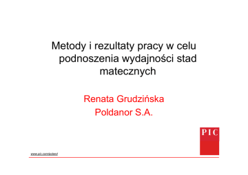Metody i rezultaty pracy w celu podnoszenia wydajności stad matecznych Renata Grudzińska Poldanor S.A. www.pic.com/poland • Prowadzenie ewidencji przebiegu produkcji pozwala na dogłębną analizę wyników. • Posiadanie informacji całej produkcji pozwala na: – przewidywanie efektów – zapobieganie występowania sytuacji kryzysowych oraz – planowanie długofalowego rozwóju. www.pic.com/poland • Na fermie prowadzona jest szczegółowa rejestracja zdarzeń produkcyjnych: – – – – – – – – wiek loszek występowanie rui szczepienia profilaktyczne dzień inseminacji identyfikacja nasienia termin badania prośności oraz wynik zmiany żywienia data porodu: • • • • – – – – – godzina rozpoczęcia i zakończenia porodu temperatura ciała maciory przez 2 doby po porodzie ewentualne interwencje podczas porodu ilość prosiąt żywo, martwo urodzonych, mumifikantów, prosiąt słabych problemy zdrowotne maciory, prosiąt standaryzacja miotów maciory mamki zabiegi zootechniczne data odsadzenia, ilość prosiąt odsadzonych www.pic.com/poland Bezpośredni wpływ na zwiększenie wydajności w stadzie miały następujące zmiany: 1 Loszki wprowadzane do rozrodu: • wiek nie mniej niż 240 dni • waga 150-160kg • dojrzałość – minimum po 2 rui 2 3 Zmiana długości laktacji z 21 na 28 dni Wprowadzenie systemu „3+2” www.pic.com/poland 1 Loszki wprowadzane do rozrodu: Aby uzyskać faktycznie lepsze rezultaty , należy pamiętać o istniejących zagrożeniach. Konieczne jest przestrzeganie ściśle określonych zasad produkcyjnych. • Trafienie do rozrodu loszek o większej wadze niż założona może powodować trudności z: – wystąpieniem, z wykryciem rui, – w późniejszym etapie cyklu wystąpić mogą w związku z dużą masą ciała samic, problemy z kończynami. – mioty będą liczne, ale prosięta o niskiej wadze urodzeniowej, utrudni to odchów tych sztuk. – u zatuczonych loszek zwiększa się odsetek martwo urodzonych prosiąt. www.pic.com/poland Zmiana długości laktacji z 21 na 28 dni 2 • • Wydłużenie laktacji pozornie powinno zmniejszyć ilość odsadzonych prosiąt. Wartość wskaźnika „ilość miotów na rok od lochy” faktycznie zmienił a się na mniejszą z 2.48 na 2,37. Wyniki produkcyjne w wyniku zastosowania wydłużonej laktacji uległy poprawie. – Odchowuje się więcej prosiąt od maciory – związane jest to ze zwiększeniem urodzonych prosiąt w miocie. – Poprawa stymulacji samicy powoduje zwiększenie liczby prosiąt w kolejnych miotach. • • Przy dłuższym karmieniu maciory narażone są na większą stratę masy ciała. Ważne jest przestrzeganie dobrych praktyk żywienia macior, w celu uniknięcia problemów w rozrodzie: – – – – braku występowania rui u macior w słabej kondycji długiego jałowienie, zwiększenia podatności na zachorowania, a nawet skrócenia użytkowości takiej sztuki www.pic.com/poland 3 • • • • • • • Wprowadzenie systemu „3+2” System „3+2” – dotyczy pierwiastek. Jest to proces mający na celu uzyskanie zdecydowanie więcej prosiąt w miocie już od 2 wyproszenia. Pierwiastkom w pierwszej laktacji ustawiamy prosięta duże, w dobrej kondycji, zdrowe, wyrównane. Po 3 tygodniach odsadzamy te prosięta, a na ich miejsce dajemy również silne, zdrowe, ale młodsze o kilkanaście dni. W wieku 10 12 dni. ”Zaburzenie” laktacji spowodowane zamianą prosiąt skutkuje tym, że w następnych cyklach uzyskamy więcej prosiąt od lochy. Jednak i tu możemy poprzez błędy uzyskać niepożądane skutki Dlatego ściśle przestrzegać zasad systemu, nieustannie kontrolować kondycję samic, aby nie traciły na wadze – efektem czego będą problemy w następnych cyklach produkcyjnych. www.pic.com/poland • W uzyskaniu lepszej, efektywniejszej produkcji wykorzystujemy nowe metody, ale zawsze przestrzegamy zasad, mówiących o wykonaniu tych metod. • Uzyskanie lepszych efektów gwałtownie nastąpiło od 2005 r. Lata poprzednie miały nieistotne różnice – średnio odsadzano od maciory w ciągu roku 24,5 prosiaka. • Rok 2005 – produkcja wzrosła o ponad 1 szt. / maciorę / rok: z 24,5 do 25,6szt. • Rok 2006 – stwierdzono, że odsadzono 26,6 szt prosiąt na maciorę w roku. • • Ferma 3,400 macior wyprodukowała 3,400 x 2.1 = 7,140 więcej prosiąt. Licząc po 120 PLN = 856,800 PLN podniesionego przychodu. www.pic.com/poland