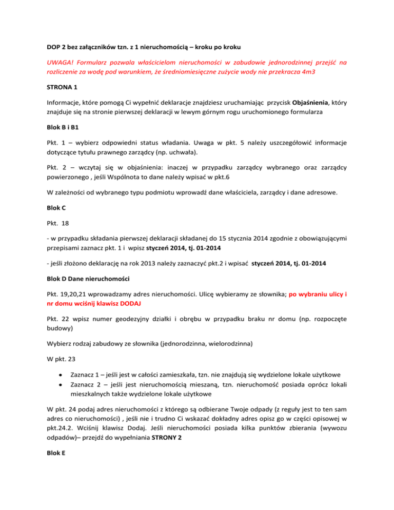 DOP 2 bez załączników tzn. z 1 nieruchomością – kroku po kroku UWAGA! Formularz pozwala właścicielom nieruchomości w zabudowie jednorodzinnej przejść na rozliczenie za wodę pod warunkiem, że średniomiesięczne zużycie wody nie przekracza 4m3 STRONA 1 Informacje, które pomogą Ci wypełnić deklaracje znajdziesz uruchamiając przycisk Objaśnienia, który znajduje się na stronie pierwszej deklaracji w lewym górnym rogu uruchomionego formularza Blok B i B1 Pkt. 1 – wybierz odpowiedni status władania. Uwaga w pkt. 5 należy uszczegółowić informacje dotyczące tytułu prawnego zarządcy (np. uchwała). Pkt. 2 – wczytaj się w objaśnienia: inaczej w przypadku zarządcy wybranego oraz zarządcy powierzonego , jeśli Wspólnota to dane należy wpisać w pkt.6 W zależności od wybranego typu podmiotu wprowadź dane właściciela, zarządcy i dane adresowe. Blok C Pkt. 18 - w przypadku składania pierwszej deklaracji składanej do 15 stycznia 2014 zgodnie z obowiązującymi przepisami zaznacz pkt. 1 i wpisz styczeń 2014, tj. 01-2014 - jeśli złożono deklarację na rok 2013 należy zaznaczyć pkt.2 i wpisać styczeń 2014, tj. 01-2014 Blok D Dane nieruchomości Pkt. 19,20,21 wprowadzamy adres nieruchomości. Ulicę wybieramy ze słownika; po wybraniu ulicy i nr domu wciśnij klawisz DODAJ Pkt. 22 wpisz numer geodezyjny działki i obrębu w przypadku braku nr domu (np. rozpoczęte budowy) Wybierz rodzaj zabudowy ze słownika (jednorodzinna, wielorodzinna) W pkt. 23 Zaznacz 1 – jeśli jest w całości zamieszkała, tzn. nie znajdują się wydzielone lokale użytkowe Zaznacz 2 – jeśli jest nieruchomością mieszaną, tzn. nieruchomość posiada oprócz lokali mieszkalnych także wydzielone lokale użytkowe W pkt. 24 podaj adres nieruchomości z którego są odbierane Twoje odpady (z reguły jest to ten sam adres co nieruchomości) , jeśli nie i trudno Ci wskazać dokładny adres opisz go w części opisowej w pkt.24.2. Wciśnij klawisz Dodaj. Jeśli nieruchomości posiada kilka punktów zbierania (wywozu odpadów)– przejdź do wypełniania STRONY 2 Blok E W pkt. 25 wprowadź zgodnie z objaśnieniami zużycie wody i podaj okres na podstawie, którego dotyczy to zużycie W pkt. 26 podaj liczę lokali mieszkalnych a w pkt. 27 liczbę lokali niemieszkalnych, jeśli nieruchomość ma charakter mieszany W pkt. 28 zaznacz 1 - jeśli deklarujesz selektywną zbiórkę odpadów zaznacz 2 – jeśli deklarujesz nieselektywną zbiórkę odpadów zaznacz 3 – jeśli deklarujesz że nie będziesz zbierał odpadów (deklaracja zerowa) Blok F.1 Pkt. 29 wpisz średnie miesięczne zużycie wody jeśli zadeklarowałeś selektywną zbiórkę odpadów Jeśli zadeklarowałeś nieselektywną zbiórkę odpadów to średnie zużycie wody wpisz w pkt. 32. Jeśli zadeklarowałeś, że jest nieruchomością mieszaną podaj w bloku F.2 w zależności od zadeklarowanego sposobu zbierania odpadów odpowiednią ilość pojemników, liczbę wywozów w tygodniu. Blok F.2 jeśli wybrałeś/łaś zbiórkę odpadów selektywną i zaznaczyłeś/łaś nieruchomość mieszaną w pkt. 22.2 wypełnij tabelę po lewej stronie podając ilość pojemników , liczbę wywozów w tygodniu – kwota opłaty wyliczy się automatycznie jeśli wybrałeś/łaś zbiórkę odpadów nieselektywną i zaznaczyłeś/łaś nieruchomość mieszaną w pkt. 22.2 wypełnij tabelę po prawej stronie podając ilość pojemników , liczbę wywozów w tygodniu – kwota opłaty wyliczy się automatycznie Następnie przejdź do STRONY 3 Blok G Wyliczany automatycznie Blok H w pkt. 98 zaznacz Tak jeśli dołączasz kopię swojej ostatniej umowy na wywóz odpadów (jesteś do tego zobowiązany jeśli składasz deklarację po raz pierwszy) w pkt. 99 zaznacz Tak jeśli dołączasz kopię faktury za zużycie wody (jeśli przechodzisz z ryczałtu na rozliczenie za wodę) w pkt. 100 zaznacz Tak jeśli nie posiadasz wodomierza do wyliczenia zużycia wody i dołącz oświadczenie (jeśli przechodzisz z ryczałtu na rozliczenie za wodę) Możesz dołączyć także inne dokumenty np. pełnomocnictwo, uchwałę Wspólnoty o zarządzie. W celu ich dołączenia przyciśnij przycisk Dodaj w polu Inne. Dołącz teraz dokumenty, które masz zapisane w swoich zasobach. Nie zapomnij wypełnić Bloku I – Podpis osoby składającej deklarację/osoby reprezentującej Jeśli wypełniłeś już całą deklarację to należy ją teraz Zatwierdzić - przycisk ZATWIERDŹ Po Zatwierdzeniu należy wykonać operację PRZEKAŻ BEZ PODPISU– jeśli nie posiadasz podpisu kwalifikowanego. Operacja ta kończy cykl wprowadzania deklaracji poprzez nadanie jej numeru oraz przekazanie danych na serwer urzędu. Należy pamiętać, że musimy deklarację wydrukować podpisać i dostarczyć do urzędu. WYŚLIJ Z PODPISEM – kończy cykl wprowadzania deklaracji poprzez nadanie jej numeru, podpisanie deklaracji za pomocą ważnego kwalifikowanego certyfikatu oraz wysłanie deklaracji na serwer urzędu Funkcję tę wybierają osoby, które posiadają ważny kwalifikowany certyfikat . W tym wypadku nie dostarczamy już do urzędu papierowej deklaracji. Należy pamiętać aby wybrać właściwy certyfikat. UWAGA! Jeśli posiadasz profil zaufany Epuap możesz wybrać certyfikat : Epuap. System „przekieruje się” automatycznie na stronę logowania do Epuap, gdzie należy się zalogować i dokonać procedury podpisu . Po użyciu profilu nastąpi powrót do edeklaracji. Po wykonaniu jednej z wyżej wymienionych operacji można wydrukować deklarację. W tym celu należy najpierw zapisać wydruk deklaracji w PDF-ie w swoich zasobach. Uruchamiamy przycisk DRUKUJ DO PLIKU. Zapisz wydruk wskazujemy gdzie chcemy go zapisać. Po zapisaniu będziemy mogli wydrukować deklaracje – tak jak każdy inny dokument zapisany w swoim komputerze. Uwaga – poczekaj na komunikat, że dokument poprawnie wyeksportowany do PDF-a. Po przekazaniu/wysłaniu danych można pobrać potwierdzeni