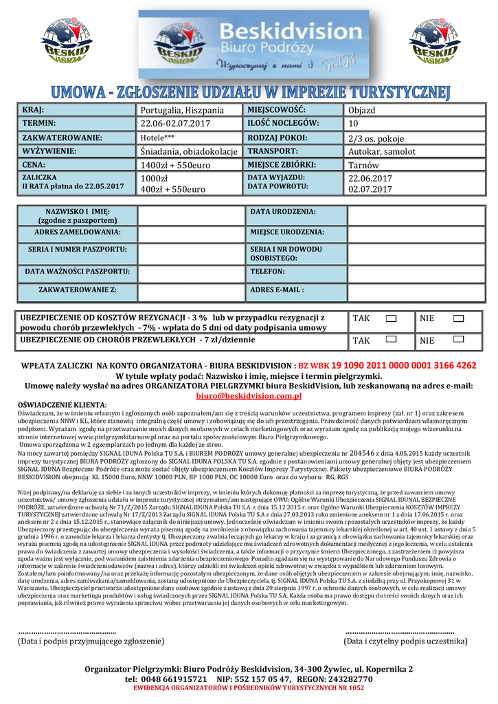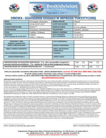 . KRAJ: MIEJSCOWOŚĆ: TERMIN: Portugalia, Hiszpania 22.06-02.07.2017 ZAKWATEROWANIE: Hotele*** RODZAJ POKOI: WYŻYWIENIE: Śniadania, obiadokolacje 1400zł + 550euro 1000zł 400zł + 550euro TRANSPORT: CENA: ZALICZKA II RATA płatna do 22.05.2017 NAZWISKO I IMIĘ: (zgodne z paszportem) ILOŚĆ NOCLEGÓW: MIEJSCE ZBIÓRKI: DATA WYJAZDU: DATA POWROTU: Objazd 10 2/3 os. pokoje Autokar, samolot Tarnów 22.06.2017 02.07.2017 DATA URODZENIA: ADRES ZAMELDOWANIA: MIEJSCE URODZENIA: SERIA I NUMER PASZPORTU: SERIA I NR DOWODU OSOBISTEGO: DATA WAŻNOŚCI PASZPORTU: TELEFON: ZAKWATEROWANIE Z: ADRES E-MAIL : UBEZPIECZENIE OD KOSZTÓW REZYGNACJI - 3 % lub w przypadku rezygnacji z powodu chorób przewlekłych - 7% - wpłata do 5 dni od daty podpisania umowy UBEZPIECZENIE OD CHORÓB PRZEWLEKŁYCH - 7 zł/dziennie TAK NIE TAK NIE WPŁATA ZALICZKI NA KONTO ORGANIZATORA - BIURA BESKIDVISION : BZ WBK 19 1090 2011 0000 0001 3166 4262 W tytule wpłaty podać: Nazwisko i imię, miejsce i termin pielgrzymki. Umowę należy wysłać na adres ORGANIZATORA PIELGRZYMKI biura BeskidVision, lub zeskanowaną na adres e-mail: [email protected] OŚWIADCZENIE KLIENTA: Oświadczam, że w imieniu własnym i zgłoszonych osób zapoznałem/am się z treścią warunków uczestnictwa, programem imprezy (zał. nr 1) oraz zakresem ubezpieczenia NNW i KL, które stanowią integralną część umowy i zobowiązuję się do ich przestrzegania. Prawdziwość danych potwierdzam własnoręcznym podpisem. Wyrażam zgodę na przetwarzanie moich danych osobowych w celach marketingowych oraz wyrażam zgodę na publikację mojego wizerunku na stronie internetowej www.pielgrzymkitarnow.pl oraz na portalu społecznościowym Biura Pielgrzymkowego. Umowa sporządzona w 2 egzemplarzach po jednym dla każdej ze stron. Na mocy zawartej pomiędzy SIGNAL IDUNA Polska TU S.A. i BIUREM PODRÓŻY umowy generalnej ubezpieczenia nr 204546 z dnia 4.05.2015 każdy uczestnik imprezy turystycznej BIURA PODRÓŻY zgłoszony do SIGNAL IDUNA POLSKA TU S.A. zgodnie z postanowieniami umowy generalnej objęty jest ubezpieczeniem SIGNAL IDUNA Bezpieczne Podróże oraz może zostać objęty ubezpieczeniem Kosztów Imprezy Turystycznej. Pakiety ubezpieczeniowe BIURA PODRÓŻY BESKIDVISION obejmują: KL 15000 Euro, NNW 10000 PLN, BP 1000 PLN, OC 10000 Euro oraz do wyboru: RG, RGS Niżej podpisany/na deklaruję za siebie i za innych uczestników imprezy, w imieniu których dokonuję płatności za imprezę turystyczną, że przed zawarciem umowy uczestnictwa/ umowy zgłoszenia udziału w imprezie turystycznej otrzymałem/am następujące OWU: Ogólne Warunki Ubezpieczenia SIGNAL IDUNAL BEZPIECZNE PODRÓŻE, zatwierdzone uchwałą Nr 71/Z/2015 Zarządu SIGNAL IDUNA Polska TU S.A. z dnia 15.12.2015 r. oraz Ogólne Warunki Ubezpieczenia KOSZTÓW IMPREZY TURYSTYCZNEJ zatwierdzone uchwałą Nr 17/Z/2013 Zarządu SIGNAL IDUNA Polska TU S.A z dnia 27.03.2013 roku zmienione aneksem nr 1 z dnia 17.06.2015 r. oraz aneksem nr 2 z dnia 15.12.2015 r., stanowiące załącznik do niniejszej umowy. Jednocześnie oświadczam w imieniu swoim i pozostałych uczestników imprezy, że każdy Ubezpieczony przestępując do ubezpieczenia wyraża pisemną zgodę na zwolnienie z obowiązku zachowania tajemnicy lekarskiej określonej w art. 40 ust. 1 ustawy z dnia 5 grudnia 1996 r. o zawodzie lekarza i lekarza dentysty tj. Ubezpieczony zwalnia leczących go lekarzy w kraju i za granicą z obowiązku zachowania tajemnicy lekarskiej oraz wyraża pisemną zgodę na udostępnienie SIGNAL IDUNA przez podmioty udzielające mu świadczeń zdrowotnych dokumentacji medycznej z jego leczenia, w celu ustalenia prawa do świadczenia z zawartej umowy ubezpieczenia i wysokości świadczenia, a także informacji o przyczynie śmierci Ubezpieczonego, z zastrzeżeniem iż powyższa zgoda ważna jest wyłącznie, pod warunkiem zaistnienia zdarzenia ubezpieczeniowego. Ponadto zgadzam się na występowanie do Narodowego Funduszu Zdrowia o informacje w zakresie świadczeniodawców (nazwa i adres), którzy udzielili mi świadczeń opieki zdrowotnej w związku z wypadkiem lub zdarzeniem losowym. Zostałem/łam poinformowany/na oraz przekażę informację pozostałym ubezpieczonym, że dane osób objętych ubezpieczeniem w zakresie obejmującym: imię, nazwisko, datę urodzenia, adres zamieszkania/zameldowania, zostaną udostępnione do Ubezpieczyciela, tj. SIGNAL IDUNA Polska TU S.A. z siedzibą przy ul. Przyokopowej 31 w Warszawie. Ubezpieczyciel przetwarza udostępnione dane osobowe zgodnie z ustawą z dnia 29 sierpnia 1997 r. o ochronie danych osobowych, w celu realizacji umowy ubezpieczenia oraz marketingu produktów i usług świadczonych przez SIGNAL IDUNA Polska TU S.A. Każda osoba ma prawo dostępu do treści swoich danych oraz ich poprawiania, jak również prawo wyrażenia sprzeciwu wobec przetwarzania jej danych osobowych w celu marketingowym. …………………………………….... (Data i podpis przyjmującego zgłoszenie) ……………………...........……............ (Data i czytelny podpis uczestnika) Organizator Pielgrzymki: Biuro Podróży Beskidvision, 34-300 Żywiec, ul. Kopernika 2 tel: 0048 661915721 NIP: 552 157 05 47, REGON: 243282770 EWIDENCJA ORGANIZATORÓW I POŚREDNIKÓW TURYSTYCZNYCH NR 1052 OGÓLNE WARUNKI UCZESTNICTWA BIURA PODRÓŻY BESKIDVISION I. 1. 2. II. 1. 2. 3. 4. 5. ZASADY OGÓLNE Niniejsze ogólne warunki stanowią integralną część umowy zawieranej między Klientem a Biurem Podróży „BESKIDVISION”, zwane w dalszym ciągu Organizatorem zobowiązuje się do świadczenia usług zgodnie z zasadami określonymi w Ogólnych Warunkach Uczestnictwa, jak również w sposób zgodny z warunkami określonymi w programie imprezy. Uczestnikiem imprezy jest osoba podpisująca Umowę - Zgłoszenie oraz inne osoby nią objęte. ZAWARCIE UMOWY I WARUNKI PŁATNOŚCI Zawarcie umowy następuje przez podpisanie druku „ZGŁOSZENIE – UMOWA” zwanego dalej Umową. Od osó