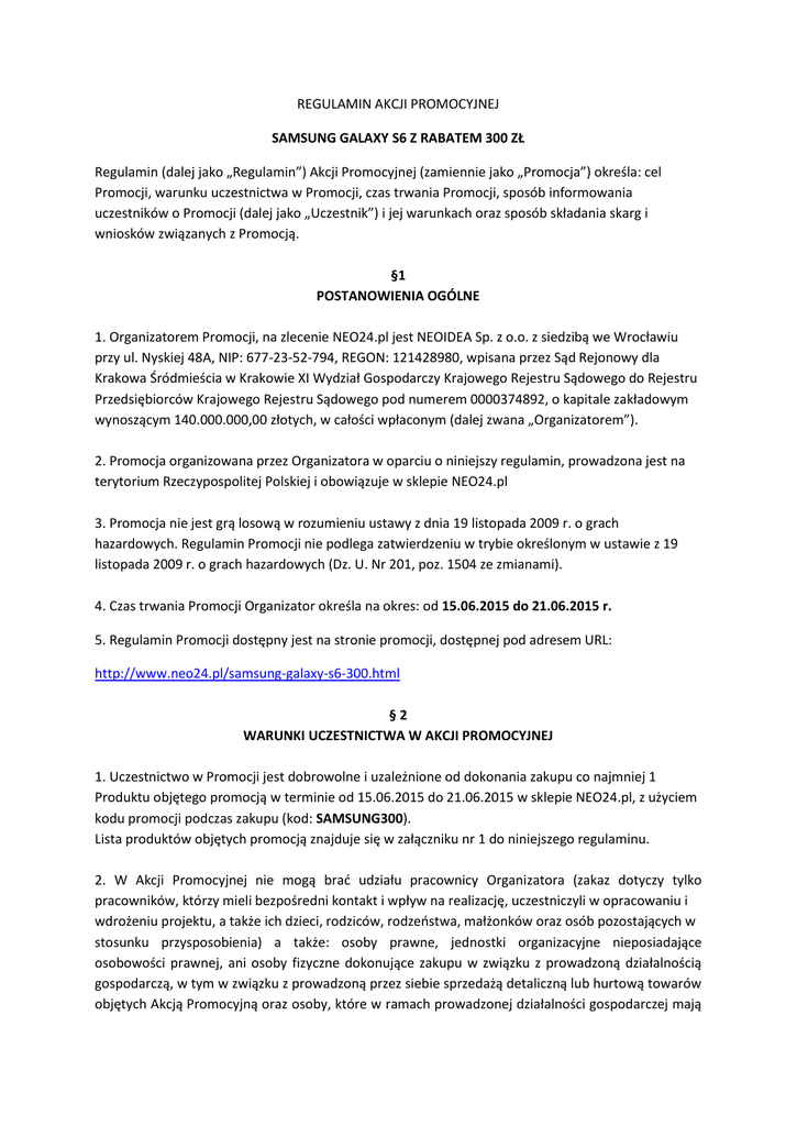 REGULAMIN AKCJI PROMOCYJNEJ SAMSUNG GALAXY S6 Z RABATEM 300 ZŁ Regulamin (dalej jako „Regulamin”) Akcji Promocyjnej (zamiennie jako „Promocja”) określa: cel Promocji, warunku uczestnictwa w Promocji, czas trwania Promocji, sposób informowania uczestników o Promocji (dalej jako „Uczestnik”) i jej warunkach oraz sposób składania skarg i wniosków związanych z Promocją. §1 POSTANOWIENIA OGÓLNE 1. Organizatorem Promocji, na zlecenie NEO24.pl jest NEOIDEA Sp. z o.o. z siedzibą we Wrocławiu przy ul. Nyskiej 48A, NIP: 677-23-52-794, REGON: 121428980, wpisana przez Sąd Rejonowy dla Krakowa Śródmieścia w Krakowie XI Wydział Gospodarczy Krajowego Rejestru Sądowego do Rejestru Przedsiębiorców Krajowego Rejestru Sądowego pod numerem 0000374892, o kapitale zakładowym wynoszącym 140.000.000,00 złotych, w całości wpłaconym (dalej zwana „Organizatorem”). 2. Promocja organizowana przez Organizatora w oparciu o niniejszy regulamin, prowadzona jest na terytorium Rzeczypospolitej Polskiej i obowiązuje w sklepie NEO24.pl 3. Promocja nie jest grą losową w rozumieniu ustawy z dnia 19 listopada 2009 r. o grach hazardowych. Regulamin Promocji nie podlega zatwierdzeniu w trybie określonym w ustawie z 19 listopada 2009 r. o grach hazardowych (Dz. U. Nr 201, poz. 1504 ze zmianami). 4. Czas trwania Promocji Organizator określa na okres: od 15.06.2015 do 21.06.2015 r. 5. Regulamin Promocji dostępny jest na stronie promocji, dostępnej pod adresem URL: http://www.neo24.pl/samsung-galaxy-s6-300.html §2 WARUNKI UCZESTNICTWA W AKCJI PROMOCYJNEJ 1. Uczestnictwo w Promocji jest dobrowolne i uzależnione od dokonania zakupu co najmniej 1 Produktu objętego promocją w terminie od 15.06.2015 do 21.06.2015 w sklepie NEO24.pl, z użyciem kodu promocji podczas zakupu (kod: SAMSUNG300). Lista produktów objętych promocją znajduje się w załączniku nr 1 do niniejszego regulaminu. 2. W Akcji Promocyjnej nie mogą brać udziału pracownicy Organizatora (zakaz dotyczy tylko pracowników, którzy mieli bezpośredni kontakt i wpływ na realizację, uczestniczyli w opracowaniu i wdrożeniu projektu, a także ich dzieci, rodziców, rodzeństwa, małżonków oraz osób pozostających w stosunku przysposobienia) a także: osoby prawne, jednostki organizacyjne nieposiadające osobowości prawnej, ani osoby fizyczne dokonujące zakupu w związku z prowadzoną działalnością gospodarczą, w tym w związku z prowadzoną przez siebie sprzedażą detaliczną lub hurtową towarów objętych Akcją Promocyjną oraz osoby, które w ramach prowadzonej działalności gospodarczej mają zawarte z Organizatorem umowy dystrybucyjne lub inne umowy, których przedmiotem jest dostawa towarów objętych Akcją Promocyjną. 3. Uczestnikiem Akcji Promocyjnej (dalej: „Uczestnik”) może być osoba fizyczna, posiadająca pełną zdolność do czynności prawnych (ukończyła 18 lat i nie jest częściowo lub całkowicie ubezwłasnowolniona w rozumieniu Kodeksu Cywilnego), osoba prawna oraz jednostka organizacyjna nie posiadająca osobowości prawnej. Osoby nie posiadające pełnej zdolności do czynności prawnych mogą brać udział w akcji promocyjnej jedynie przy współudziale swojego przedstawiciela ustawowego/opiekuna prawnego, który zapoznał się z treścią niniejszego Regulaminu i zaakceptował jego postanowienia. 4. Każdy Uczestnik, biorący udział w akcji promocyjnej potwierdza, że zapoznał się z niniejszym Regulaminem i w pełni go akceptuje. §3 ZASADY AKCJI PROMOCYJNEJ 1. Uczestnik przystępujący do akcji promocyjnej poprzez zakup conajmniej 1 produktu objętego promocją w terminie określonym w § 1 pkt. 4 i potwierdzenie zamówienia kodem promocji SAMSUNG300 otrzyma od Organizatora Promocji rabat w wysokości 300 zł na produkt objęty promocją. Rabat naliczy się w koszyku po wpisaniu kodu w miejscu MAM KOD RABATOWY. 2. Promocją objęte są wybrane produkty z kategorii GSM. Pełna lista produktów objętych promocją znajduje się w załączniku nr 1 niniejszego regulaminu. 3. Warunkiem koniecznym skorzystania z promocji na stronie sklepu NEO24.pl poza zakupem co najmniej 1 produktu objętego promocją w okresie trwania promocji, jest dokonanie zgłoszenia do promocji, przez wprowadzenie podczas składania zamówienia na stronie kodu o treści: SAMSUNG300 w polu Kod rabatowy w koszyku i potwierdzenie go przyciskiem OK”: 4. Warunkiem udziału w Promocji podczas składania zamówienia, spełniającego jej warunki, za pośrednictwem infolinii DOK sklepu NEO24.pl, jest poinformowanie Operatora o udziale w Promocji. §4 OGRANICZENIA AKCJI PROMOCYJNEJ 1. Promocja nie obejmuje zakupionych towarów, które zostały zwrócone w ciągu 14 dni od dnia otrzymania (lub w ciągu 30 dni w przypadku towarów zakupionych wraz z Pakietem BeztroskimPremium), z powodu rezygnacji, ani zamówień, które zostały złożone, lecz nieopłacone lub zostały anulowane przez operatorów DOK z jakichkolwiek powodów. 2. Promocja obowiązuje do 21.06.2015 lub do odwołania. Po tym terminie promocję uznaje się za zakończoną. 3. Rabat zostanie naliczony za każdy zakup spełniający warunki promocji. 4. Zamówienia sprzętu bez wprowadzonego i zatwierdzonego kodu SAMSUNG300 w koszyku nie będą kwalifikowane do udziału w promocji i nie zostaną za nienaliczone bony na kolejne zakupy. Zakupy dokonane przez serwis CENEO poprzez opcję KUP TERAZ CENEO nie uprawniają do otrzymania rabatu. 5. Promocja nie łączy się z pozostałymi promocjami na produkty z kategorii GSM podczas jej obowiązywania. Promocja nie łączy się też innymi promocjami, wymagającymi użycia kodu rabatowego w koszyku sklepu NEO24.PL. Podczas 1(słownie: jednej) transakcji dokonywanej w sklepie, Uczestnik Promocji może wykorzystać tylko 1 (słownie: jeden) kod rabatowy, aktualnie obowiązującej promocji. 6. Uczestnik promocji może zakupić maksymalnie po 1 sztuce tego samego sprzętu objętego promocją. 7. Promocja nie o