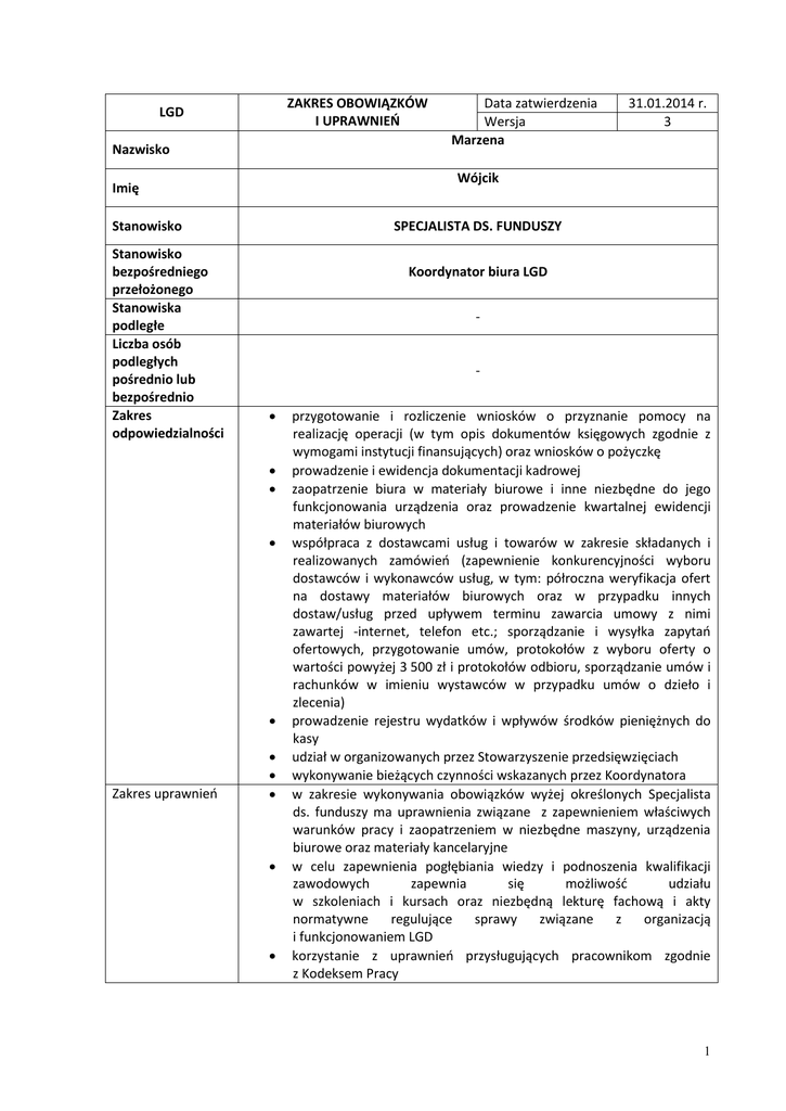ZAKRES OBOWIĄZKÓW I UPRAWNIEŃ LGD Nazwisko Stanowisko SPECJALISTA DS. FUNDUSZY Koordynator biura LGD - Zakres uprawnień 31.01.2014 r. 3 Wójcik Imię Stanowisko bezpośredniego przełożonego Stanowiska podległe Liczba osób podległych pośrednio lub bezpośrednio Zakres odpowiedzialności Data zatwierdzenia Wersja Marzena przygotowanie i rozliczenie wniosków o przyznanie pomocy na realizację operacji (w tym opis dokumentów księgowych zgodnie z wymogami instytucji finansujących) oraz wniosków o pożyczkę prowadzenie i ewidencja dokumentacji kadrowej zaopatrzenie biura w materiały biurowe i inne niezbędne do jego funkcjonowania urządzenia oraz prowadzenie kwartalnej ewidencji materiałów biurowych współpraca z dostawcami usług i towarów w zakresie składanych i realizowanych zamówień (zapewnienie konkurencyjności wyboru dostawców i wykonawców usług, w tym: półroczna weryfikacja ofert na dostawy materiałów biurowych oraz w przypadku innych dostaw/usług przed upływem terminu zawarcia umowy z nimi zawartej -internet, telefon etc.; sporządzanie i wysyłka zapytań ofertowych, przygotowanie umów, protokołów z wyboru oferty o wartości powyżej 3 500 zł i protokołów odbioru, sporządzanie umów i rachunków w imieniu wystawców w przypadku umów o dzieło i zlecenia) prowadzenie rejestru wydatków i wpływów środków pieniężnych do kasy udział w organizowanych przez Stowarzyszenie przedsięwzięciach wykonywanie bieżących czynności wskazanych przez Koordynatora w zakresie wykonywania obowiązków wyżej określonych Specjalista ds. funduszy ma uprawnienia związane z zapewnieniem właściwych warunków pracy i zaopatrzeniem w niezbędne maszyny, urządzenia biurowe oraz materiały kancelaryjne w celu zapewnienia pogłębiania wiedzy i podnoszenia kwalifikacji zawodowych zapewnia się możliwość udziału w szkoleniach i kursach oraz niezbędną lekturę fachową i akty normatywne regulujące sprawy związane z organizacją i funkcjonowaniem LGD korzystanie z uprawnień przysługujących pracownikom zgodnie z Kodeksem Pracy 1 Udzielone stałe pełnomocnictwa Współpraca i kontakty Wykształcenie Wymagania konieczne Wymagania pożądane Umiejętności: 1. znajomość języka obcego 2. znajomość obsługi komputera 3. kluczowe kompetencje Pełnomocnictwa udzielone na podstawie odrębnych uchwał Zarządu Stowarzyszenia Z członkami LGD, innymi lokalnymi grupami działania, społecznością lokalną, instytucjami - finansującymi i wdrażającymi PROW, Bankami. WYMAGANE KWALIFIKACJE Wyższe (preferowane ekonomiczne – kierunek finanse, bankowość i rachunkowość). Doświadczenie w pracy biurowej o podobnym charakterze; Kursy lub szkolenia z zakresu programów pomocowych. Doświadczenie w zakresie świadczenia usług doradczych nt. wypełniania i rozliczania wniosków o dofinansowanie. Odbyte kursy lub szkolenia z zakresu realizacji Osi IV Leader PROW. Mieszkaniec obszaru działania lub siedziby LGD. Mile widziana znajomość w stopniu komunikatywnym języka angielskiego lub języka francuskiego. Dobra obsługa komputera (środowisko Windows, MS Office). Komunikatywność, sumienność, rzetelność, umiejętności interpersonalne, samodzielność, organizacja pracy, odpowiedzialność, kreatywność, dyspozycyjność, wysoki poziom kultury osobistej. Umiejętności analityczne. 4. dodatkowe kompetencje 5. inne Kierowanie pojazdem (prawo kat. B). umiejętności Obsługa urządzeń biurowych. Wymiar czasu 3/4 etatu pracy Powierzony sprzęt: Komputer stacjonarny wraz monitorem i drukarką atramentową HP, niszczarka, router, telefon stacjonarny oraz urządzenia stanowiące wyposażenie stowarzyszenia – kuchenka mikrofalowa, czajnik bezprzewodowy lodówka MPM, młynek do kawy. …………………………………..…… data i podpis pracownika ………………………………..……………… data i podpis przełożonego …………..……………………………………… data i podpis osoby uprawnionej do reprezentacji Stowarzyszenia „Turkowska Unia Rozwoju” 2