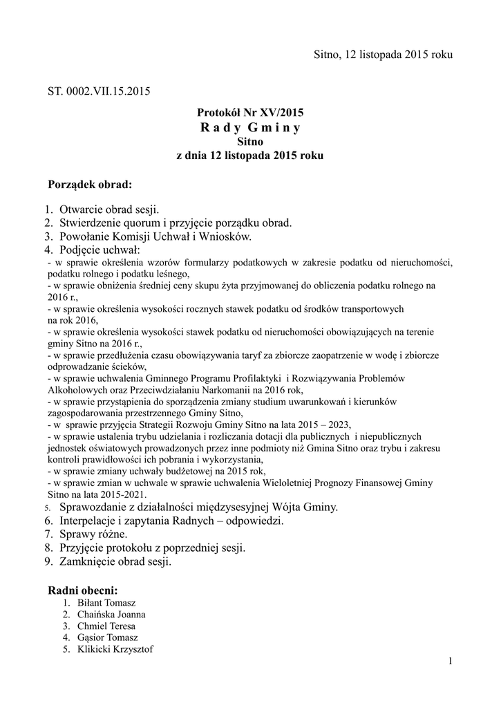 Sitno, 12 listopada 2015 roku ST. 0002.VII.15.2015 Protokół Nr XV/2015 Rady Gminy Sitno z dnia 12 listopada 2015 roku Porządek obrad: 1. 2. 3. 4. Otwarcie obrad sesji. Stwierdzenie quorum i przyjęcie porządku obrad. Powołanie Komisji Uchwał i Wniosków. Podjęcie uchwał: - w sprawie określenia wzorów formularzy podatkowych w zakresie podatku od nieruchomości, podatku rolnego i podatku leśnego, - w sprawie obniżenia średniej ceny skupu żyta przyjmowanej do obliczenia podatku rolnego na 2016 r., - w sprawie określenia wysokości rocznych stawek podatku od środków transportowych na rok 2016, - w sprawie określenia wysokości stawek podatku od nieruchomości obowiązujących na terenie gminy Sitno na 2016 r., - w sprawie przedłużenia czasu obowiązywania taryf za zbiorcze zaopatrzenie w wodę i zbiorcze odprowadzanie ścieków, - w sprawie uchwalenia Gminnego Programu Profilaktyki i Rozwiązywania Problemów Alkoholowych oraz Przeciwdziałaniu Narkomanii na 2016 rok, - w sprawie przystąpienia do sporządzenia zmiany studium uwarunkowań i kierunków zagospodarowania przestrzennego Gminy Sitno, - w sprawie przyjęcia Strategii Rozwoju Gminy Sitno na lata 2015 – 2023, - w sprawie ustalenia trybu udzielania i rozliczania dotacji dla publicznych i niepublicznych jednostek oświatowych prowadzonych przez inne podmioty niż Gmina Sitno oraz trybu i zakresu kontroli prawidłowości ich pobrania i wykorzystania, - w sprawie zmiany uchwały budżetowej na 2015 rok, - w sprawie zmian w uchwale w sprawie uchwalenia Wieloletniej Prognozy Finansowej Gminy Sitno na lata 2015-2021. 5. 6. 7. 8. 9. Sprawozdanie z działalności międzysesyjnej Wójta Gminy. Interpelacje i zapytania Radnych – odpowiedzi. Sprawy różne. Przyjęcie protokołu z poprzedniej sesji. Zamknięcie obrad sesji. Radni obecni: 1. 2. 3. 4. 5. Biłant Tomasz Chaińska Joanna Chmiel Teresa Gąsior Tomasz Klikicki Krzysztof 1 6. Kozak Leszek 7. Łazorczyk Tomasz 8. Mazurek Janusz 9. Polski Robert 10. Ryszczuk Jan 11. Szawarski Ryszard 12. Tokarz Kazimierz 13. Torba Janusz 14. Wydmański Władysław Radni nieobecni: 1. Sokołowski Dariusz Ad. 1 Otwarcie obrad sesji Otwarcia obrad XV Sesji Rady Gminy w bieżącej kadencji dokonał Przewodniczący Rady Gminy Pan Krzysztof Klikicki. Przewodniczący powitał Radnych, a także gości zaproszonych: Wójta Gminy Pana Mariana Bernata oraz Skarbnika Gminy Panią Jolantę Hryciuk, jak również pozostałych gości: Panią Agnieszkę Grzesiuk Dyrektor Centrum Kultury z Biblioteką w Sitnie, Panią Barbarę Tor kierownik GOPS oraz mieszkańca Bożego Daru Pana Piotra Palikota. Obrady rozpoczęły się o godz. 1200 i trwały do godz. 1600. Ad.2 Stwierdzenie quorum i przyjęcie porządku obrad Przewodniczący Rady Gminy na podstawie listy obecności stwierdził, że w obradach uczestniczy 14 Radnych, co stanowi niezbędne quorum potrzebne do podejmowania prawomocnych uchwał. Następnie Przewodniczący zapytał, czy są jakieś uwagi do porządku obrad. Pan Wójt powiedział, że w związku z tym, iż pracowaliśmy nad budżetem Pan Piotr nie miał kiedy zrobić protokołu, a w związku z tym jest prośba, aby przyjęcie tego protokołu przenieść na następną sesję. Dalej Pan Wójt poinformował, że nie będzie też w dniu dzisiejszym uchwał budżetowych, natomiast będzie dodatkowa uchwał o nabyciu działki na poszerzenie boiska w Sitnie przy Szkole. Pan Przewodniczący dodał, że będzie jeszcze przedstawienie projektu budżetu na 2016 rok. Ponadto Pan Wójt zaproponował, aby wszystkie komisje spotkały się po sesji i omówiły wspólnie budżet na rok 2016. 2 Kolejno Pan Wójt powiedział, że Panu Przewodniczącemu przekażemy prowizorium budżetowe na rok 2016, ponieważ jest to nasz obowiązek. Państwo Radni przyjęli proponowany porządek obrad wraz z ww. zmianami jednogłośnie. Pan Przewodniczący oddał, głos Panu Palikotowi. Pan Palikot powiedział, że pozwolił sobie przyjść na sesję w związku z pretensjami Pana Tokarza, co do przegłosowania przez społeczeństwo Bożego Daru przeznaczenia całego funduszu sołeckiego na remont łazienki w domu ludowym. Dalej Pan Palikot powiedział: „(…)Panie Tokarz nie wiedziałem, że ma taką moc, że całe społeczeństwo jestem. W głosowaniu jawnym, jak w każdej miejscowości głosuje się większością głosów i przegłosowuje się fundusz sołecki. Panie Tokarz, Pan nie zabrał głosu na tym głosowaniu w ogóle, więc proszę nie zarzucać mi. Przeszła moja propozycja, jestem wdzięczny, bo za 12 tys. zł jest zrobienie łazienki i doprowadzenie wody do domu ludowego. To pierwszy temat. Drugi temat to podkłady, które niby to zostały zniszczone według Pana przeze mnie. Czy Pan uważa, że ja te podkłady zabrałem?” Pan Tokarz: „Pojechałeś swoim sprzętem, własne paliwo, czas i ty te podkłady wyrzuciłeś z pola, gdzie się podziały?” Pan Palikot: „ Panie Piotrze proszę, aby to było zapisane protokole, że Pan Tokarz powiedział, że ja zabrałem podkłady.” Pan Tokarz: „ Nie zabrałeś, wyrzuciłeś, gdzie się podziały te podkłady?” Pan Palikot: „Podkłady rozbierałem 1-2 maj na prośbę właściciela nieruchomości. Podkłady zabrali: Pan Wszoła, Pan Zastąpiło, Pan Wieczorek, Pan Kość i Pan Mazur. Ja kupiłem tą działkę dnia 25 listopada tych podkładów już nie było, czyli akt własności ziemi na tą działkę, tej drogi nie było w planach”. Pan Tokarz: „ Co tu mają do rzeczy plany. Podkłady były własnością gminy i wsi, więc jak to tak można sobie zabrać. Gmina wyłożyła pieniądze w latach 70-tych, czy tam 80-tych budując, ja dałem własny ciągnik od początku do końca na ułożenie tych podkładów i co”. Pan Palikot: „Tą sprawę będziemy załatwiali inaczej, wszystko jest w protokole Pan mnie osądził. Druga sprawa podkładów nie było 500 m tak jak Pan Tokarz mówił, tylko 283 m tej drogi, ale jeśli ktoś nie potrafi bud