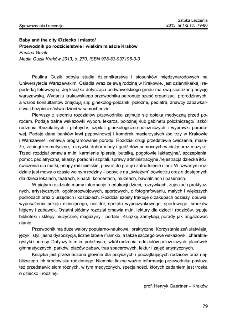 Sprawozdania i recenzje Sztuka Leczenia 2013, nr 1-2 str. 79-80 Baby and the city /Dziecko i miasto/ Przewodnik po rodzicielstwie i wielkim mieście Kraków Paulina Guzik Media Guzik Kraków 2013, s. 270, ISBN 978-83-937196-0-0 Paulina Guzik odbyła studia dziennikarstwa i stosunków międzynarodowych na Uniwersytecie Warszawskim. Osiadła wraz ze swą rodziną w Krakowie. jest dziennikarką i reporterką telewizyjną. Jej książka dotycząca podwawelskiego grodu ma swą siostrzaną edycję warszawską. Wydaniu krakowskiego przewodnika patronuje sześć organizacji prorodzinnych, a wśród konsultantów znajdują się: ginekolog-położnik, położne, pediatra, znawcy zabawkarstwa i bezpieczeństwa dzieci w samochodzie. Pierwszy z siedmiu rozdziałów przewodnika zajmuje się opieką medyczną przed porodem. Podaje trafne wskazówki wyboru lekarza, położnej /lub gabinetu położniczego/, szkół rodzenia /bezpłatnych i płatnych/, szpitali ginekologiczno-położniczych i wyprawki porodowej. Podaje dane banków krwi pępowinowej i komórek macierzystych /po trzy w Krakowie i Warszawie/ i omawia programowanie porodu. Rozdział drugi przedstawia ćwiczenia, masaże, zabiegi kosmetyczne, rozrywki, dobór mody i gadżetów pomocnych w ciąży oraz muzykę. Trzeci rozdział omawia m.in. karmienie /piersią, butelką, pogotowie laktacyjne/, szczepienia, pomoc pediatryczną lekarzy, poradni i szpitali, sprawy administracyjne /rejestracja dziecka itd./, ćwiczenia dla matki, urlopy rodzicielskie, powrót do pracy i zatrudnienie niani. W czwartym rozdziale jest mowa o czasie wolnym rodziny – pobycie na „świeżym” powietrzu oraz o dostępnych dla dzieci lokalach, teatrach, kinach, koncertach, muzeach, bawialniach i basenach. W piątym rozdziale mamy informacje o edukacji dzieci, rozrywkach, zajęciach praktycznych, artystycznych, ogólnorozwojowych, sportowych, o fotografowaniu, małych i większych podróżach oraz o urzędach i kościołach. Rozdział szósty traktuje o zakupach odzieży, obuwia, wyposażenia pokoju dziecięcego, nosideł, sprzętu wypoczynkowego, sportowego, środków higieny i zabawek. Ostatni siódmy rozdział omawia m.in. lektury dla dzieci i rodziców, typuje biblioteki i sklepy muzyczne, magazyny i portale. Książkę zamykają porady jak angażować nianię. Przewodnik ma duże walory popularno-naukowe i praktyczne. Korzystanie zeń ułatwiają: język i styl, jasna dyspozycja, liczne tabele /”ramki:/, a także szczegółowe wskazówki, charakterystyki i adresy. Dotyczy to m.in. położnych, szkół rodzenia, oddziałów położniczych, placówek gimnastycznych, parków, placów zabaw, tras spacerowych, lektur i zajęć artystycznych. Książka jest przeznaczona głównie dla przyszłych i początkujących rodziców oraz najbliższego ich środowiska rodzinnego. Niemniej liczne ważne informacje przewodnika posłużą też przedstawicielom różnych, w tym medycznych, specjalności, których zadaniem jest troska o dziecko i rodzinę. prof. Henryk Gaertner – Kraków 79 Sprawozdania i recenzje 80
