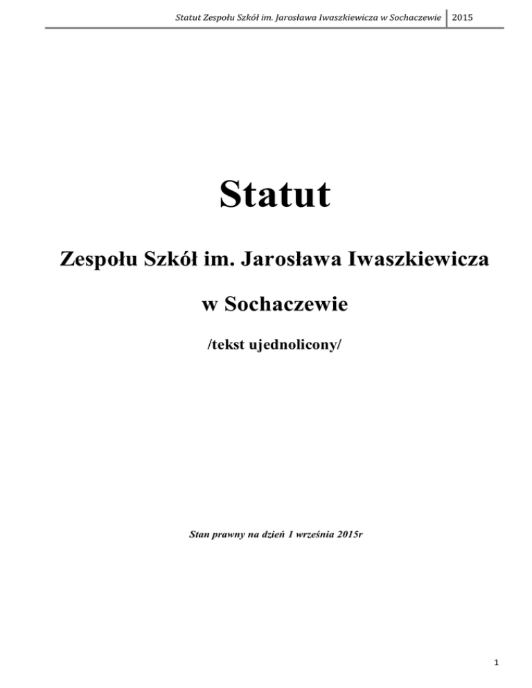 Statut Zespołu Szkół im. Jarosława Iwaszkiewicza w Sochaczewie 2015 Statut Zespołu Szkół im. Jarosława Iwaszkiewicza w Sochaczewie /tekst ujednolicony/ Stan prawny na dzień 1 września 2015r 1 Statut Zespołu Szkół im. Jarosława Iwaszkiewicza w Sochaczewie 2015 SPIS TREŚCI NAZWA ZESPOŁU SZKÓŁ, SIEDZIBA I SKŁAD ORAZ INNE INFORMACJE O ZESPOLE ...... 3 CELE I ZADANIA ZESPOŁU SZKÓŁ .......................................................................................................... 3 ORGANY ZESPOŁU SZKÓŁ ......................................................................................................................... 4 ORGANIZACJA ZESPOŁU SZKÓŁ.............................................................................................................. 5 NAUCZYCIELE I INNI PRACOWNICY ZESPOŁU SZKÓŁ ...................................................................... 5 UCZNIOWIE .................................................................................................................................................... 6 POSTANOWIENIA KOŃCOWE .................................................................................................................... 6 2 Statut Zespołu Szkół im. Jarosława Iwaszkiewicza w Sochaczewie 2015 Rozdział I NAZWA ZESPOŁU SZKÓŁ, SIEDZIBA I SKŁAD ORAZ INNE INFORMACJE O ZESPOLE §1 Zespół Szkół, którego dotyczy niniejszy statut, używa nazwy – Zespół Szkół im. Jarosława Iwaszkiewicza w Sochaczewie, w dalszej części statutu zwany Zespołem Szkół. §2 1. Siedziba Zespołu Szkół znajduje się w Sochaczewie przy ul. Chopina 99 a. 2. Zespół Szkół prowadzi działalność przy: 1) ul. Chopina 99 a – budynek dydaktyczny (sale lekcyjne, pomieszczenia administracyjne i gospodarcze, szatnie), 2) ul. Chodakowskiej 16 – budynek dydaktyczny I (sale lekcyjne, szatnie, pomieszczenia administracyjno – gospodarcze), budynek dydaktyczny II (sale lekcyjne) 3) pasażu Wacława Duplickiego – budynek dydaktyczny (sala gimnastyczna, siłownia, pracownia gastronomiczna, pracownia obsługi konsumenta, sale lekcyjne, szatnie i pomieszczenia administracyjnogospodarcze) §3 1. Zespół Szkół im. Jarosława Iwaszkiewicza w Sochaczewie jest zespołem szkół publicznych, w którego skład wchodzą: 1) 2) 3) 4) Liceum Ogólnokształcące Technikum /uchylony/ Zasadnicza Szkoła Zawodowa §4 Szczegółowe informacje o szkołach wchodzących w skład Zespołu Szkół zawierają statuty szkół wymienionych w§3 Rozdział II CELE I ZADANIA ZESPOŁU SZKÓŁ §5 Zespół Szkół jest oświatową jednostką organizacyjną prowadzoną przez Powiat Sochaczewski, który sprawuje nadzór nad jego działalnością w zakresie spraw finansowych i administracyjnych. §6 Czas trwania kształcenia w szkołach wchodzących w skład Zespołu Szkół oraz zawody, w których kształci szkoła, określają statuty szkół wchodzących w skład Zespołu Szkół. §7 W Zespole Szkół realizuje się cele i zadania określone w ustawie o systemie oświaty oraz przepisach wydanych na jej podstawie. §8 Szczegółowy wykaz celów i zadań dydaktyczno- wychowawczych realizowanych przez szkoły wchodzące w skład Zespołu Szkół, a zwłaszcza zakres i sposób wykonywania zadań opiekuńczo-wychowawczych odpowiednich do wieku uczniów i potrzeb środowiskowych oraz formy i sposoby sprawowania indywidualnej opieki nad uczniami określają statuty szkół wchodzących w skład Zespołu Szkół. 3 Statut Zespołu Szkół im. Jarosława Iwaszkiewicza w Sochaczewie 2015 Rozdział III ORGANY ZESPOŁU SZKÓŁ §9 1. Organami Zespołu Szkół są: 1) dyrektor Zespołu Szkół 2) rada pedagogiczna Zespołu Szkół 3) rada rodziców Zespołu Szkół 4) samorządy uczniowskie szkół wchodzących w skład Zespołu Szkół 3. Ze względów organizacyjnych rady pedagogiczne, rady rodziców szkół wchodzących w skład Zespołu Szkół połączyły się. 4. Ze względów organizacyjnych samorządy uczniowskie szkół wchodzących w skład Zespołu Szkół mogą się łączyć 5. Kompetencje rady szkół przejęła rada pedagogiczna Zespołu Szkół. § 10 1. Kompetencje dyrektora Zespołu Szkół: 1) powołuje i odwołuje zastępców dyrektora po zasięgnięciu opinii organu prowadzącego i rady pedagogicznej 2) kieruje całokształtem działalności dydaktycznej, wychowawczej, opiekuńczej oraz gospodarczej Zespołu Szkół we współdziałaniu z zastępcami dyrektora, 3) dysponuje środkami określonymi w planie finansowym Zespołu Szkół i ponosi odpowiedzialność za ich prawidłowe wykorzystanie, 4) reprezentuje Zespół Szkół na zewnątrz, 5) jest służbowym przełożonym dla nauczycieli i pracowników ekonomiczno- administracyjnych, 6) kieruje pracą rady pedagogicznej jako jej przewodniczący, 7) realizuje uchwały rady pedagogicznej zgodnie z obowiązującymi w tym zakresie przepisami prawa, 8) występuje z wnioskami o odznaczenia, nagrody i inne wyróżnienia dla pracowników Zespołu Szkół, 9) sprawuje nadzór pedagogiczny, 10) dokonuje oceny pracy nauczycieli, 11) wydaje decyzje o skreśleniu ucznia z listy uczniów na podstawie uchwały rady pedagogicznej, 12) opracowuje arkusz organizacyjny Zespołu Szkół oraz ustala podział zadań dla kadry kierowniczej, nauczycieli i innych pracowników szkoły, 13) organizuje administracyjną, finansową i gospodarczą obsługę szkół wchodzących w skład Zespołu Szkół, 14) współdziała w realizacji swoich zadań z radą pedagogiczną Zespołu Szkół, 15) wykonuje inne zadania wynikające z przepisów szczegółowych. § 11 1. Statuty szkół wchodzących w skład Zespołu Szkół określają szczegółowo: 1) cele i zadania szkół wynikające z przepisów prawa oraz uwzględniają program wychowawczy i program profilaktyki, o których mowa w odrębnych przepisach, 2) sposób wykonywania zadań szkół, z uwzględnieniem wspomagania wszechstronnego rozwoju uczniów i tworzenia p