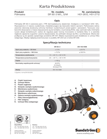 Karta Produktowa Produkt Półmaska Nr. modelu SR 90-3 M/L, S/M Nr. zamówienia H01-2612, H01-2712 Opis Półmaska SR 90-3 wykonana jest z TPE (termoplastyczny elastomer). Dostępna w rozmiarach S/M i M/L. Wyposażona w 2 zawory wydechowe, charakteryzujące się niezwykle niskimi oporami. Perforowane osłony zaworów stanowią skuteczną ochronę membran wydechowych przed pyłami i aerozolami. Tworzywo oraz barwniki stosowane w masce dopuszczone są do kontaktu z żywnością (FDA), więc zachodzi tylko minimalne ryzyko alergii kontaktowych. Łatwe do regulacji paski tworzą mocowanie w kształcie litery V, a szerokie nagłowie zapewnia wygodne i pewne dopasowanie. Do półmaski stosuje się filtry i pochłaniacze. Można też podłączyć ją do aparatu sprężonego powietrza SR 307. Maska wyposażona jest dodatkowo w uchwyt filtra wstępnego. Maskę najlepiej przechowywać w pudełku SR 230 lub w torbie SR 339. Specyfikacja techniczna SR 90-3 EN 140:1998 Opór przy wdechu – 30 l/min ≈ 3 Pa ≤ 50 Pa Opór przy wydechu – 160 l/min ≈ 70 Pa ≤ 300 Pa Temperatura użytkowania -10 – +55 °C, < 90 % RH - Temperatura przechowywania -20 – +40 °C, < 90 % RH - ≈ 160 g - Nominalny współczynnik ochrony 48 (P3) 50 (GasX) 48 (GasX P3) - Atesty EN 140:1998 Ciężar 1 1) Zgodnie z normą EN 529:2005. A. Część twarzowa B. Uchwyt filtrów C. Pasek nagłowia D. Gniazdo wentyla wydechowego E. Membrana wydechowa F. Gniazdo wentyla wdechowego G. Membrana wdechowa H. Osłona wentyla wydechowego I. Filtry (nieuwzględnione) J. Filtr wstępny K. Uchwyt filtra wstępnego A I K F G B J C D P01H-2623 Rev 05 20140826 E H Head Office Factory Tel: +46-(0)8-562 370 00 Fax: +46-(0)8-562 370 20 Tel: +46-(0)8-562 370 00 Fax: +46-(0)8-562 370 60 Visiting address: Stockholmsvägen 33 SE-181 33 Lidingö Visiting address: Västergatan 4 SE-341 50 Lagan www.srsafety.com