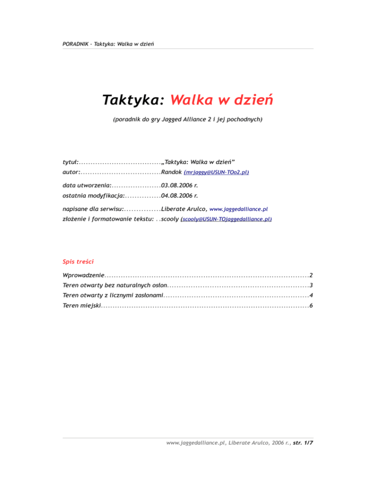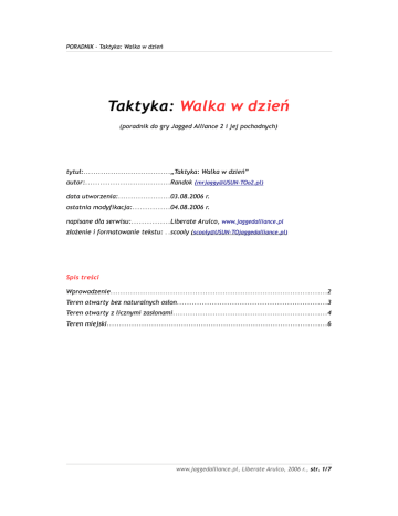 PORADNIK - Taktyka: Walka w dzień Taktyka: Walka w dzień (poradnik do gry Jagged Alliance 2 i jej pochodnych) tytuł:...................................„Taktyka: Walka w dzień” autor:..................................Randok ([email protected]) data utworzenia:.....................03.08.2006 r. ostatnia modyfikacja:...............04.08.2006 r. napisane dla serwisu:...............Liberate Arulco, www.jaggedalliance.pl złożenie i formatowanie tekstu: . .scooly ([email protected]) Spis treści Wprowadzenie.......................................................................................2 Teren otwarty bez naturalnych osłon............................................................3 Teren otwarty z licznymi zasłonami..............................................................4 Teren miejski.........................................................................................6 www.jaggedalliance.pl, Liberate Arulco, 2006 r., str. 1/7 PORADNIK - Taktyka: Walka w dzień Wprowadzenie Od początku mojej przygody z JA1 prawie zawsze walczyłem w dzień. Walka w dzień charakteryzuje się tym, że widzi się cały sektor (można nacieszyć oczy grafiką), można spokojnie planować no i nie męczy się oczu wytrzeszczaniem ich w czarny ekran. Ma ona jednak jeden minus, który może dać się we znaki początkującym. Jest trudniejsza niż w nocy. Uważam, że wszelkie początkowe problemy z tą porą dnia zmaleją i w końcu znikną z każdym kolejnym zdobytym sektorem. Żeby walka przebiegała sprawnie i przyjemnie trzeba być przygotowanym przed wejściem do sektora. Wszyscy najemnicy powinni być zdrowi i wyspani. Sprzęt naprawiony i uzupełniony (pełne magazynki w broni i w plecaku - wszelkie uzupełnienia i łączenia do 100%, zamiany robimy będąc w ekranie z inwentarzem po zdobyciu sektora i po otworzeniu wszystkich szafek i skrzyń). Do walki w dzień najlepsze będą przede wszystkim: broń strzelająca seriami o zasięgu ok. 40-50, karabiny snajperskie. Wyposażyć broń (w miarę znajdowania) w celownik snajperski, laserowy, dwójnóg, pręt+sprężyna lub dołączany granatnik. Najemnicy powinni mieć założone okulary i słuchawki a ten który idzie jako pierwszy dobrze żeby miał dodatkowo nożyce i wykrywacz min. Reszta wyposażenia według uznania i umiejętności najemników. Jak już wszystko gotowe, to do boju. 1 Jagged Alliance www.jaggedalliance.pl, Liberate Arulco, 2006 r., str. 2/7 PORADNIK - Taktyka: Walka w dzień Teren otwarty bez naturalnych osłon W takich sektorach nie ma kamieni, grubych drzew, skał czy innych obiektów, za którymi możemy się schować lub są one rozmieszczone w taki sposób (pojedynczo), że nie stanowią osłony dla najemników przed nieprzyjacielskim ogniem. To tereny piaszczyste, bagienne, z rzadką trawą, cienkimi drzewkami. W takich sektorach ważne jest posiadanie przez każdego najemnika broni o długim zasięgu i to z kompletem dodatków (celownik laserowy, celownik snajperski, dwójnóg, pręt+sprężyna). Dobrze też jest mieć granatniki. Do sektora wchodzimy w narożnik. Ustawiamy najemników w linię lub ciasną tyralierę, a jeśli mamy ich więcej to zaraz za pierwszym szeregiem robimy drugi. Wszyscy leżą. Najlepszego najemnika tzn. posiadającego najwyższe umiejętności celność i doświadczenie możemy wysunąć o jedno pole przed linię najemników. Dobrze jest kiedy ma on kamuflaż (najlepiej na 100%). Jeżeli spodziewamy się zmasowanego ataku to możemy z tyłu za linią przygotować najemnika z moździeżem (już w pozycji kucznej gotowy do strzału) i użyć go do likwidacji dużej grupy enemiaków. Jeszcze tylko save i szybki save (alt+s). www.jaggedalliance.pl, Liberate Arulco, 2006 r., str. 3/7 PORADNIK - Taktyka: Walka w dzień Teren otwarty z licznymi zasłonami W takich sektorach są np: kamienie, grube drzewa, worki z piaskiem, ruiny domów, gęste krzaki, wysoka trawa. W każdym terenie stanowią bardzo dobrą zasłonę przed ostrzałem (poza krzakami i wysoką trawą, które przede wszystkim dają zasłonę przed dostrzeżeniem przez enemiaka). Po wejściu do sektora (najlepiej do narożnika) ustawiamy najemników w pozycji kucznej za kamieniami, workami z piaskiem czy ruinami. Upewniamy się czy mogą od razu z pozycji kucznej położyć się (zabiera 2PA2), gdyż czasem nie można tego wykonać od razu i trzeba najpierw najemnika obrócić a potem dopiero położyć (2PA + 2PA). A czasem brak tych 2PA może wpędzić w kłopoty. Za grubymi drzewami, krzakami, w wysokiej trawie najemników raczej dajemy w pozycji leżącej. Dobrze jest też się usmarować (kamuflaż). Jak już się przygotujemy to jeszcze save i alt+s i robimy pif. Jak już się pojawią to strzelamy zza kamieni czy worków z piaskiem metodą strzel, padnij, powstań, strzel, padnij itd. Oczywiście to padanie możemy sobie darować kiedy enemiaki pudłują. W końcu to 2PA na padnięcie i 2PA na powstanie. No i trochę emocji kiedy świstają kulki. Można też się pośmiać z enemiaka, że spudłował. Najemnicy za grubymi drzewami są osłonięci ale nie tak do końca jak za kamieniem czy workiem. Czasem i oni mogą oberwać dlatego trzeba uważać. Natomiast krzaki chronią najemnika przed dostrzeżeniem a nie przed postrzeleniem. W związku z tym za krzakiem najemnik powinien kucać (w tej pozycji "taniej" się obracać- mniej PA) i ewentualnie dalej można się wycofać. Może też leżeć (mniej widoczny) ale wszelkie manewry po wykryciu zabierają masę PA. Dlatego kucający jest dobry do likwidacji pojedynczo pojawiających się enemiaków (chyba że ma kumpli do pomocy to można walczyć z grupką ). Leżący za krzakiem nalepszy jest do wskazywania celu kumplom. Kumple strzelają a enemiaki ogłupiałe nie wiedzą co robić bo nie mają pojęcia skąd obrywają. 2 skrót PA oznacza Punkty Akcji www.jaggedalliance.pl, Liberate Arulco, 2006 r., str. 4/7 PORADNIK - Taktyka: Walka w dzień Wysoka trawa też 