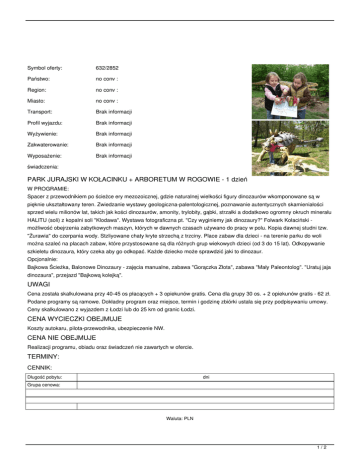 Symbol oferty: 632/2852 Państwo: no conv : Region: no conv : Miasto: no conv : Transport: Brak informacji Profil wyjazdu: Brak informacji Wyżywienie: Brak informacji Zakwaterowanie: Brak informacji Wyposażenie: Brak informacji świadczenia: PARK JURAJSKI W KOŁACINKU + ARBORETUM W ROGOWIE - 1 dzień W PROGRAMIE: Spacer z przewodnikiem po ścieżce ery mezozoicznej, gdzie naturalnej wielkości figury dinozaurów wkomponowane są w pięknie ukształtowany teren. Zwiedzanie wystawy geologiczna-palentologicznej, poznawanie autentycznych skamieniałości sprzed wielu milionów lat, takich jak kości dinozaurów, amonity, trylobity, gąbki, strzałki a dodatkowo ogromny okruch minerału HALITU (soli) z kopalni soli "Klodawa". Wystawa fotograficzna pt. "Czy wyginiemy jak dinozaury?" Folwark Kołaciński - możliwość obejrzenia zabytkowych maszyn, których w dawnych czasach używano do pracy w polu. Kopia dawnej studni tzw. "Żurawia" do czerpania wody. Stzliyowane chaty kryte strzechą z trzciny. Place zabaw dla dzieci - na terenie parku do woli można szaleć na placach zabaw, które przystosowane są dla różnych grup wiekowych dzieci (od 3 do 15 lat). Odkopywanie szkieletu dinozaura, który czeka aby go odkopać. Każde dziecko może sprawdzić jaki to dinozaur. Opcjonalnie: Bajkowa Ścieżka, Balonowe Dinozaury - zajęcia manualne, zabawa "Gorączka Złota", zabawa "Mały Paleontolog". "Uratuj jaja dinozaura", przejazd "Bajkową kolejką". UWAGI Cena została skalkulowana przy 40-45 os płacących + 3 opiekunów gratis. Cena dla grupy 30 os. + 2 opiekunów gratis - 62 zł. Podane programy są ramowe. Dokładny program oraz miejsce, termin i godzinę zbiórki ustala się przy podpisywaniu umowy. Ceny skalkulowano z wyjazdem z Łodzi lub do 25 km od granic Łodzi. CENA WYCIECZKI OBEJMUJE Koszty autokaru, pilota-przewodnika, ubezpieczenie NW. CENA NIE OBEJMUJE Realizacji programu, obiadu oraz świadczeń nie zawartych w ofercie. TERMINY: CENNIK: Długość pobytu: dni Grupa cenowa: Waluta: PLN 1/2 Aktualne ceny z systemu S.A.R.T. (-) - cena usługi, podatku kalkulowana przy osobie lub gratis (*) - kwota wliczona w cenę standardową 2/2