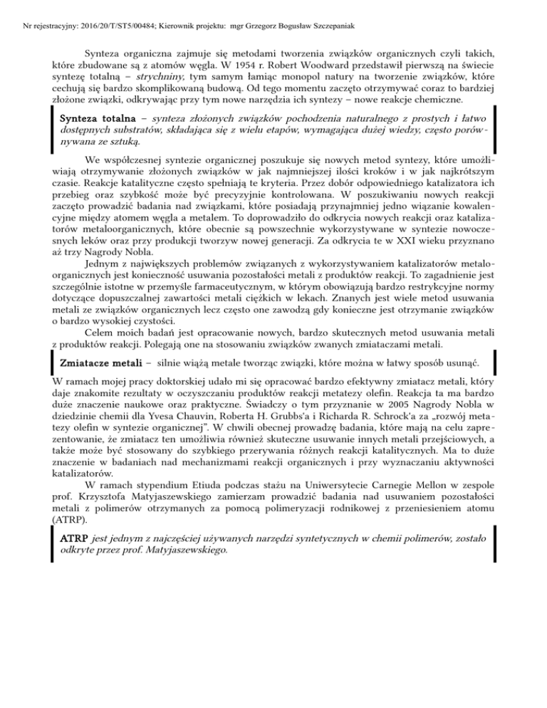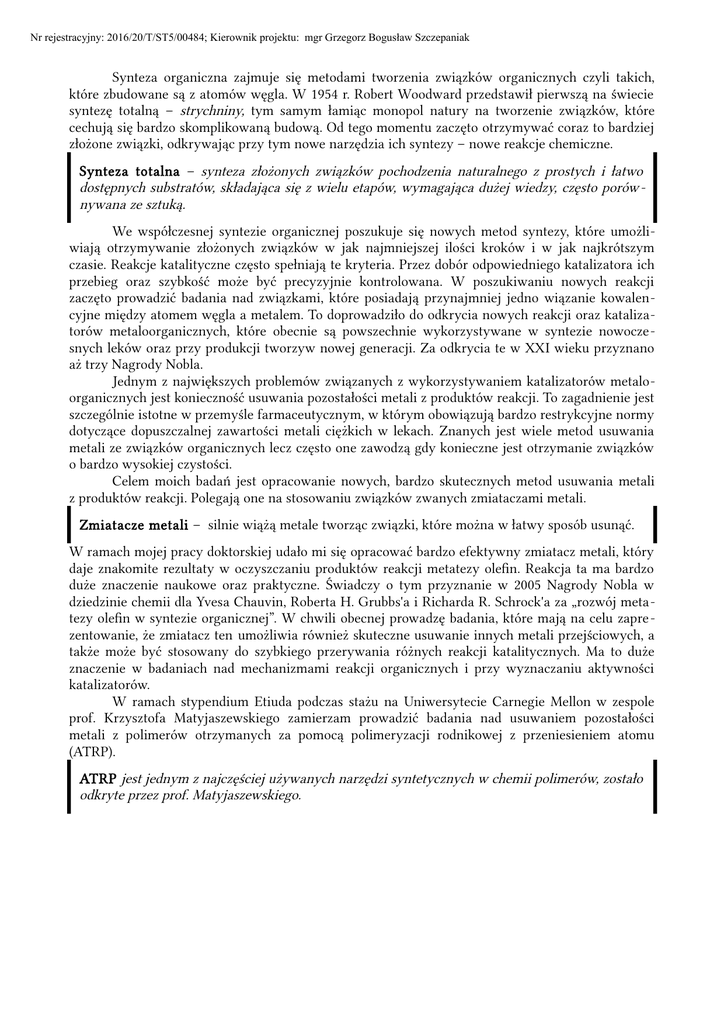 Nr rejestracyjny: 2016/20/T/ST5/00484; Kierownik projektu: mgr Grzegorz Bogusław Szczepaniak Synteza organiczna zajmuje się metodami tworzenia związków organicznych czyli takich, które zbudowane są z atomów węgla. W 1954 r. Robert Woodward przedstawił pierwszą na świecie syntezę totalną – strychniny, tym samym łamiąc monopol natury na tworzenie związków, które cechują się bardzo skomplikowaną budową. Od tego momentu zaczęto otrzymywać coraz to bardziej złożone związki, odkrywając przy tym nowe narzędzia ich syntezy – nowe reakcje chemiczne. Synteza totalna – synteza złożonych związków pochodzenia naturalnego z prostych i łatwo dostępnych substratów, składająca się z wielu etapów, wymagająca dużej wiedzy, często porównywana ze sztuką. We współczesnej syntezie organicznej poszukuje się nowych metod syntezy, które umożliwiają otrzymywanie złożonych związków w jak najmniejszej ilości kroków i w jak najkrótszym czasie. Reakcje katalityczne często spełniają te kryteria. Przez dobór odpowiedniego katalizatora ich przebieg oraz szybkość może być precyzyjnie kontrolowana. W poszukiwaniu nowych reakcji zaczęto prowadzić badania nad związkami, które posiadają przynajmniej jedno wiązanie kowalencyjne między atomem węgla a metalem. To doprowadziło do odkrycia nowych reakcji oraz katalizatorów metaloorganicznych, które obecnie są powszechnie wykorzystywane w syntezie nowoczesnych leków oraz przy produkcji tworzyw nowej generacji. Za odkrycia te w XXI wieku przyznano aż trzy Nagrody Nobla. Jednym z największych problemów związanych z wykorzystywaniem katalizatorów metaloorganicznych jest konieczność usuwania pozostałości metali z produktów reakcji. To zagadnienie jest szczególnie istotne w przemyśle farmaceutycznym, w którym obowiązują bardzo restrykcyjne normy dotyczące dopuszczalnej zawartości metali ciężkich w lekach. Znanych jest wiele metod usuwania metali ze związków organicznych lecz często one zawodzą gdy konieczne jest otrzymanie związków o bardzo wysokiej czystości. Celem moich badań jest opracowanie nowych, bardzo skutecznych metod usuwania metali z produktów reakcji. Polegają one na stosowaniu związków zwanych zmiataczami metali. Zmiatacze metali – silnie wiążą metale tworząc związki, które można w łatwy sposób usunąć. W ramach mojej pracy doktorskiej udało mi się opracować bardzo efektywny zmiatacz metali, który daje znakomite rezultaty w oczyszczaniu produktów reakcji metatezy olefin. Reakcja ta ma bardzo duże znaczenie naukowe oraz praktyczne. Świadczy o tym przyznanie w 2005 Nagrody Nobla w dziedzinie chemii dla Yvesa Chauvin, Roberta H. Grubbs'a i Richarda R. Schrock'a za „rozwój metatezy olefin w syntezie organicznej”. W chwili obecnej prowadzę badania, które mają na celu zapre zentowanie, że zmiatacz ten umożliwia również skuteczne usuwanie innych metali przejściowych, a także może być stosowany do szybkiego przerywania różnych reakcji katalitycznych. Ma to duże znaczenie w badaniach nad mechanizmami reakcji organicznych i przy wyznaczaniu aktywności katalizatorów. W ramach stypendium Etiuda podczas stażu na Uniwersytecie Carnegie Mellon w zespole prof. Krzysztofa Matyjaszewskiego zamierzam prowadzić badania nad usuwaniem pozostałości metali z polimerów otrzymanych za pomocą polimeryzacji rodnikowej z przeniesieniem atomu (ATRP). ATRP jest jednym z najczęściej używanych narzędzi syntetycznych w chemii polimerów, zostało odkryte przez prof. Matyjaszewskiego.