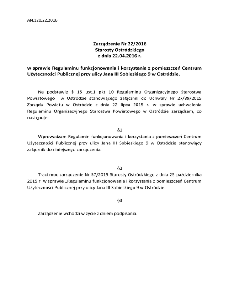 AN.120.22.2016 Zarządzenie Nr 22/2016 Starosty Ostródzkiego z dnia 22.04.2016 r. w sprawie Regulaminu funkcjonowania i korzystania z pomieszczeń Centrum Użyteczności Publicznej przy ulicy Jana III Sobieskiego 9 w Ostródzie. Na podstawie § 15 ust.1 pkt 10 Regulaminu Organizacyjnego Starostwa Powiatowego w Ostródzie stanowiącego załącznik do Uchwały Nr 27/89/2015 Zarządu Powiatu w Ostródzie z dnia 22 lipca 2015 r. w sprawie uchwalenia Regulaminu Organizacyjnego Starostwa Powiatowego w Ostródzie zarządzam, co następuje: §1 Wprowadzam Regulamin funkcjonowania i korzystania z pomieszczeń Centrum Użyteczności Publicznej przy ulicy Jana III Sobieskiego 9 w Ostródzie stanowiący załącznik do niniejszego zarządzenia. §2 Traci moc zarządzenie Nr 57/2015 Starosty Ostródzkiego z dnia 25 października 2015 r. w sprawie „Regulaminu funkcjonowania i korzystania z pomieszczeń Centrum Użyteczności Publicznej przy ulicy Jana III Sobieskiego 9 w Ostródzie. §3 Zarządzenie wchodzi w życie z dniem podpisania. Załącznik do Zarządzenia Nr 22/2016 Starosty Ostródzkiego z dnia 22.04.2016 Regulamin funkcjonowania i korzystania z pomieszczeń Centrum Użyteczności Publicznej, Starostwa Powiatowego w Ostródzie przy ulicy Jana III Sobieskiego 9 w Ostródzie Regulamin funkcjonowania i korzystania z pomieszczeń Starostwa Powiatowego w budynku Centrum Użyteczności Publicznej zwany dalej Regulaminem, określa zasady korzystania z pomieszczeń Centrum Użyteczności Publicznej mieszczącego się przy ul. Jana III Sobieskiego 9 w Ostródzie, zwanego dalej CUP. § 1. Zasady ogólne 1. Za należyte funkcjonowanie budynku CUP odpowiada Wydział Rozwoju Lokalnego, zwany dalej Wydziałem. 2. Nadzór nad sprawnym funkcjonowaniem obiektu sprawuje Naczelnik Wydziału, zwany dalej Naczelnikiem. 3. Koordynatorem ds. współpracy z sektorem pozarządowym jest pracownik Wydziału, zwany dalej Koordynatorem. 4. Organizacje prowadzące działalność pożytku publicznego, zwane dalej organizacjami uzyskują prawo do korzystania z zasobów CUP, w celu prowadzenia działalności statutowej po zapoznaniu się z niniejszym regulaminem i podpisaniu stosownych umów, których integralną częścią jest niniejszy Regulamin. 5. Decyzję o użyczeniu pomieszczeń CUP podejmuje Zarząd Powiatu w Ostródzie. 6.Karta oceny wniosku zawierająca kryteria oceny stanowi załącznik nr 1 c do Regulaminu. 7.. Nabór wniosków ogłaszany jest w przypadku dostępności wolnych pomieszczeń CUP. § 2. Zasady korzystania z sal konferencyjnych i pomieszczeń organizacji w CUP 1.Pomieszczenia CUP oraz sale konferencyjne (110, 112 114 – pracownia komputerowa) udostępniane są organizacjom od poniedziałku do piątku w godzinach od 7.00 do 20.00 zgodnie z ustalonym harmonogramem sporządzonym przez Koordynatora/Pracownika Wydziału. W przypadku konieczności korzystania poza ustalonymi powyżej godzinami, organizacja jest zobowiązana do wcześniejszego powiadomienia Koordynatora/Pracownika Wydziału. 2.W soboty, niedziele i święta istnieje możliwość korzystania z sal konferencyjnych i pomieszczeń CUP, po wcześniejszym powiadomieniu Koordynatora/Pracownika Wydziału. 3.Organizacje ubiegające się o udostępnienie zasobów CUP zobowiązane są do złożenia wniosku do Wydziału, według odpowiedniego dla danego świadczenia wzoru stanowiącego załączniki nr 1a, 2a do Regulaminu. 4. Istnieje możliwość korzystania z pomieszczenia CUP przez więcej niż 1 organizację. W tym przypadku należy umieścić stosowną informację w pkt. II f wniosku stanowiącego załącznik nr 1 b do Regulaminu. 5.W przypadku wyrażenia zgody przez UŻYCZAJĄCEGO organizacja zobowiązana jest do podpisania stosownej umowy użyczenia według odpowiedniego wzoru stanowiącego załączniki nr 1, 2 do Regulaminu. 6.Harmonogram korzystania z sal konferencyjnych prowadzony jest przez Koordynatora/Pracownika Wydziału. 7.Wykonywanie przedsięwzięć niezgodnych z celami statutowymi organizacji na terenie CUP jest niedopuszczalne i stanowi podstawę do rozwiązania umowy o użyczenie pomieszczeń bądź sal konferencyjnych. 8.Zakazane jest prowadzenie na terenie CUP działań politycznych. 9.Zabrania się wynoszenia sprzętu i przedmiotów będących własnością CUP poza teren obiektu. 10.Zabrania się odstępowania użyczonego pomieszczenia i sprzętu innym osobom lub podmiotom. 11.Organizacje zobowiązane są do przestrzegania przepisów BHP i przeciwpożarowych obowiązujących w budynku. 12.W pomieszczeniach, jak i w całym budynku obowiązuje zakaz palenia tytoniu, spożywania napojów alkoholowych i środków odurzających. Zabrania się również wstępu i przebywania osobom będącym w stanie wskazującym na spożycie alkoholu i innych środków odurzających. 13.Osoba upoważniona przez organizację do korzystania z pomieszczeń zobowiązana jest do przestrzegania ustalonych godzin spotkań oraz pozostawienia porządku w pomieszczeniach w takim stanie, w jakim zostały przekazane. 14.Upoważniona przez organizację osoba odpowiada za pomieszczenia udostępnione do eksploatacji. 15.Dostęp do pomieszczeń osobie upoważnionej zapewnia pracownik Starostwa / ochrony budynku. 16.Użyczający nie odpowiada za rzeczy pozostawione w salach konferencyjnych oraz szatni. 17.Zwrot użyczonej sali konferencyjnej, sprzętu i kluczy powinien zostać dokonany niezwłocznie po zakończeniu wydarzenia. 18.Odpowiedzialność materialną za użyczaną salę konferencyjną i znajdujące się w niej wyposażenie ponosi organizacja. 19.Pomieszczenia mogą być używane wyłącznie w celu załatwiania spraw związanych ze statutową działalnością organizacji. Korzystanie z udostępnionych zasobów CUP do celów prywatnych i działalności gospodarczej jest niedozwolone. 20.W przypadku nieprawidłowego używania zasobów CUP i nieprzestrzegania Regulaminu lub zawartych umów, Zarząd Powiatu ma prawo do rozwiązania zawartej umowy. § 3. Zasa