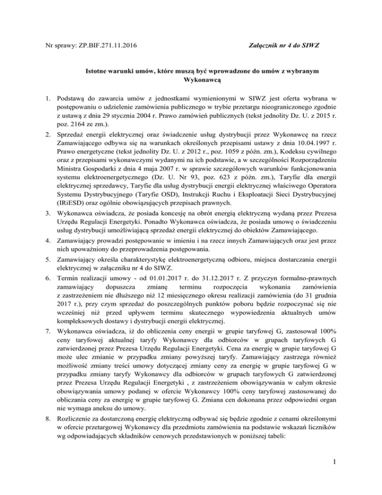 Nr sprawy: ZP.BIF.271.11.2016 Załącznik nr 4 do SIWZ Istotne warunki umów, które muszą być wprowadzone do umów z wybranym Wykonawcą 1. Podstawą do zawarcia umów z jednostkami wymienionymi w SIWZ jest oferta wybrana w postępowaniu o udzielenie zamówienia publicznego w trybie przetargu nieograniczonego zgodnie z ustawą z dnia 29 stycznia 2004 r. Prawo zamówień publicznych (tekst jednolity Dz. U. z 2015 r. poz. 2164 ze zm.). 2. Sprzedaż energii elektrycznej oraz świadczenie usług dystrybucji przez Wykonawcę na rzecz Zamawiającego odbywa się na warunkach określonych przepisami ustawy z dnia 10.04.1997 r. Prawo energetyczne (tekst jednolity Dz. U. z 2012 r., poz. 1059 z późn. zm.), Kodeksu cywilnego oraz z przepisami wykonawczymi wydanymi na ich podstawie, a w szczególności Rozporządzeniu Ministra Gospodarki z dnia 4 maja 2007 r. w sprawie szczegółowych warunków funkcjonowania systemu elektroenergetycznego (Dz. U. Nr 93, poz. 623 z późn. zm.), Taryfie dla energii elektrycznej sprzedawcy, Taryfie dla usług dystrybucji energii elektrycznej właściwego Operatora Systemu Dystrybucyjnego (Taryfie OSD), Instrukcji Ruchu i Eksploatacji Sieci Dystrybucyjnej (IRiESD) oraz ogólnie obowiązujących przepisach prawnych. 3. Wykonawca oświadcza, że posiada koncesję na obrót energią elektryczną wydaną przez Prezesa Urzędu Regulacji Energetyki. Ponadto Wykonawca oświadcza, że posiada umowę o świadczeniu usług dystrybucji umożliwiającą sprzedaż energii elektrycznej do obiektów Zamawiającego. 4. Zamawiający prowadzi postępowanie w imieniu i na rzecz innych Zamawiających oraz jest przez nich upoważniony do przeprowadzenia postępowania. 5. Zamawiający określa charakterystykę elektroenergetyczną odbioru, miejsca dostarczania energii elektrycznej w załączniku nr 4 do SIWZ. 6. Termin realizacji umowy - od 01.01.2017 r. do 31.12.2017 r. Z przyczyn formalno-prawnych zamawiający dopuszcza zmianę terminu rozpoczęcia wykonania zamówienia z zastrzeżeniem nie dłuższego niż 12 miesięcznego okresu realizacji zamówienia (do 31 grudnia 2017 r.), przy czym sprzedaż do poszczególnych punktów poboru będzie rozpoczynać się nie wcześniej niż przed upływem terminu skutecznego wypowiedzenia aktualnych umów kompleksowych dostawy i dystrybucji energii elektrycznej. 7. Wykonawca oświadcza, iż do obliczenia ceny energii w grupie taryfowej G, zastosował 100% ceny taryfowej aktualnej taryfy Wykonawcy dla odbiorców w grupach taryfowych G zatwierdzonej przez Prezesa Urzędu Regulacji Energetyki. Cena za energię w grupie taryfowej G może ulec zmianie w przypadku zmiany powyższej taryfy. Zamawiający zastrzega również możliwość zmiany treści umowy dotyczącej zmiany ceny za energię w grupie taryfowej G w przypadku zmiany taryfy Wykonawcy dla odbiorców w grupach taryfowych G zatwierdzonej przez Prezesa Urzędu Regulacji Energetyki , z zastrzeżeniem obowiązywania w całym okresie obowiązywania umowy podanej w ofercie Wykonawcy 100% ceny taryfowej zastosowanej do obliczania ceny za energię w grupie taryfowej G. Zmiana cen dokonana przez odpowiedni organ nie wymaga aneksu do umowy. 8. Rozliczenie za dostarczoną energię elektryczną odbywać się będzie zgodnie z cenami określonymi w ofercie przetargowej Wykonawcy dla przedmiotu zamówienia na podstawie wskazań liczników wg odpowiadających składników cenowych przedstawionych w poniższej tabeli: 1 Grupa taryfowa Symbol Cena energii elektrycznej Cena obowiązująca od 01.01.2017 r. do 31.12.2017 roku Strefa I Strefa II [zł/MWh] Strefa III Jednostkowa opłata handlowa [zł] 9. Wykonawca zobowiązany jest do bilansowania handlowego, poprzez rozliczanie niezbilansowania powstałego pomiędzy zgłoszonym wolumenem energii w ramach Umowy, a rzeczywiście zakupioną energią elektryczną w okresach rozliczeniowych, w ramach ustalonej ceny za sprzedaną energię elektryczną Zamawiającego. 10. Wykonawca oświadcza, iż do obliczenia ceny przesyłu energii zastosował 100 % ceny taryfowej aktualnej taryfy dystrybucji Operatora Systemu Dystrybucyjnego zatwierdzonej przez Prezesa Urzędu Regulacji Energetyki, który będzie obowiązywał w całym okresie obowiązywania Umowy. Cena za dystrybucję może ulec zmianie w przypadku zmiany powyższej taryfy dystrybucji od daty jej wejścia w życie bez konieczności sporządzania aneksu do umowy. Możliwość dokonania takiej zmiany została przewidziana w ogłoszeniu o zamówieniu i w treści SIWZ. 11. Rozliczenie za sprzedaną energię elektryczną i usługę dystrybucji odbywać się będzie na podstawie faktycznego zużycia energii wg wskazań układu pomiarowo-rozliczeniowego w okresie rozliczeniowym. 12. Po upływie okresu rozliczeniowego realizacji przedmiotu zamówienia, Wykonawca wystawi faktury za poprzedni okres z tytułu kompleksowej usługi dostawy energii elektrycznej i świadczenia usług dystrybucji, które będą zawierać m.in. wyszczególnienie wszystkich pozycji kosztowych. Faktury płatne będą w terminie 14 dni od ich otrzymania. 13. Zamawiający otrzyma upusty i bonifikaty z tytułu niedotrzymania parametrów jakościowych energii elektrycznej i standardów jakości obsługi odbiorców, zgodnie z taryfą Operatora systemu Dystrybucyjnego i Taryfą obowiązującą dla przedmiotu zamówienia Wykonawcy. 14. Okres rozliczeniowy jest zgodny z taryfą Operatora Systemu Dystrybucyjnego. Aktualnie stosowany jest dwumiesięczny okres rozliczeniowy. 15. Faktury za energię elektryczną w okresach rozliczeniowych należy wystawić na: a) Gmina Majdan Królewski, ul. Rynek 1a, 36-110 Majdan Królewski; NIP: 814-15-87-980 jako nabywca i Gmina Majdan Królewski, ul. Rynek 1a, 36-110 Majdan Królewski jako odbiorca. b) Gmina Majdan Królewski, ul. Rynek 1a, 36-110 Majdan Królewski; NIP: 814-15-87-980 jako nabywca i Gminny Zakład Wodociągów Kanalizacji i Oczyszczania, ul. Rynek 1a, 36110 Majdan Królewski jako odbiorca. c) Gmina Majdan Kr
