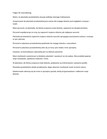 Frågor för översättning Wiem, że placówka przedszkolna stosuje politykę równego traktowania. Uczęszczanie do placówki przedszkolnej jest ważne dla mojego dziecka pod względem rozwoju i nauki. Mam poczucie, że placówka, do której uczęszcza moje dziecko, zapewnia mu bezpieczeostwo. Personel współpracuje ze mną, by zapewnid mojemu dziecku jak najlepsze warunki. Placówka przedszkolna zapewnia mojemu dziecku warunki sprzyjające poznawaniu kultury i rozwoju w tym zakresie. Personel w placówce przedszkolnej podchodzi do mojego dziecka z szacunkiem. Personel w placówce przedszkolnej wita się ze mną i jest wobec mnie uprzejmy. Uważam, że komunikacja z placówką jest na dobrym poziomie. Mam możliwośd uczestniczyd w działaniu placówki i wywierad na nie wpływ. (Na przykład poprzez sesje rozwojowe, spotkania rodziców i inne). W placówce, do której uczęszcza moje dziecko, podawane są zróżnicowane i pożywne posiłki. Placówka przedszkolna działa proaktywnie, dając dzieciom możliwośd nauki na łonie natury. Opiekunowie odnoszą się do mnie w uprzejmy sposób, kiedy przyprowadzam i odbieram moje dziecko.
