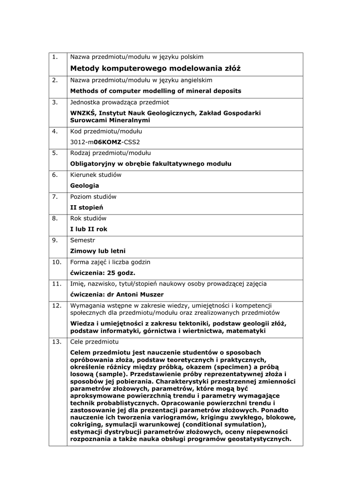 1. Nazwa przedmiotu/modułu w języku polskim Metody komputerowego modelowania złóż 2. Nazwa przedmiotu/modułu w języku angielskim Methods of computer modelling of mineral deposits 3. Jednostka prowadząca przedmiot WNZKŚ, Instytut Nauk Geologicznych, Zakład Gospodarki Surowcami Mineralnymi 4. Kod przedmiotu/modułu 3012-m06KOMZ-CSS2 5. Rodzaj przedmiotu/modułu Obligatoryjny w obrębie fakultatywnego modułu 6. Kierunek studiów Geologia 7. Poziom studiów II stopień 8. Rok studiów I lub II rok 9. Semestr Zimowy lub letni 10. Forma zajęć i liczba godzin ćwiczenia: 25 godz. 11. Imię, nazwisko, tytuł/stopień naukowy osoby prowadzącej zajęcia ćwiczenia: dr Antoni Muszer 12. Wymagania wstępne w zakresie wiedzy, umiejętności i kompetencji społecznych dla przedmiotu/modułu oraz zrealizowanych przedmiotów Wiedza i umiejętności z zakresu tektoniki, podstaw geologii złóż, podstaw informatyki, górnictwa i wiertnictwa, matematyki 13. Cele przedmiotu Celem przedmiotu jest nauczenie studentów o sposobach opróbowania złoża, podstaw teoretycznych i praktycznych, określenie różnicy między próbką, okazem (specimen) a próbą losową (sample). Przedstawienie próby reprezentatywnej złoża i sposobów jej pobierania. Charakterystyki przestrzennej zmienności parametrów złożowych, parametrów, które mogą być aproksymowane powierzchnią trendu i parametry wymagające technik probablistycznych. Opracowanie powierzchni trendu i zastosowanie jej dla prezentacji parametrów złożowych. Ponadto nauczenie ich tworzenia variogramów, krigingu zwykłego, blokowe, cokriging, symulacji warunkowej (conditional symulation), estymacji dystrybucji parametrów złożowych, oceny niepewności rozpoznania a także nauka obsługi programów geostatystycznych. 14. Zakładane efekty kształcenia (W_1) zna podstawową terminologię z zakresu modelowania złóż (W_2) zna sposoby doboru parametrów złożowych, potrafi odróżniać zmienne losowe złoża od ściśle określonych (W_3) zna podstawowe techniki aproksymacji powierzchni trendu (W_4) posiada wiedzę z zakresu modelowania geostatystycznego parametrów złożowych (U_1) potrafi zaplanować symulacje parametrów złożowych Symbole kierunkowych efektów kształcenia K2_W02, K2_W05 K2_W02, K2_W05 K2_W02, K2_W05 K2_W02, K2_W05 K2_W02, K2_W05 K2_U01, K2_U05 (U_2) umie ocenić symulacje złożowe (U_3) potrafi określić niepewność rozpoznania na podstawie modelowania geostatystycznego (U_4) Potrafi sporządzić mapy rozkładu parametrów złożowych na podstawie wykonanych variogramów . 15. K2_U01, K2_U05 K2_U01, K2_U05 K2_U01, K2_U05 Treści programowe Informacje wstępne. Metodyka opróbowania złoża, podstawy teoretyczne. Próbki – teoria, różnica między próbką, okazem (specimen) a próbą losową (sample). Próba reprezentatywna złoża i sposoby jej pobierania. Parametry złożowe, wybór metody obliczenia parametrów i przygotowania danych do obliczeń. Zmienne losowe złoża. Złoża o parametrach silnie skośnych. Charakterystyka przestrzennej zmienności parametrów złożowych. Powierzchnie zmienności, aproksymowanie powierzchni trendu i parametry wymagające technik probablistycznych. Modelowanie złożowe. Powierzchnie trendu i ich zastosowanie dla prezentacji parametrów złożowych. Modelowanie geostatystyczne. Variogramy, semivariogramy, kriging zwykły, blokowy, cokriging. Symulacje złożowe. Symulacja warunkowa (conditional symulation). Ocena symulacji złożowych. Estymacja dystrybucji parametrów złożowych, ocena niepewności rozpoznania. Modelowanie złożowe. Programy geostatystyczne – praktyczne zastosowanie 16. Zalecana literatura (podręczniki) Literatura podstawowa: Bakirow A.A. (1973). Poszukiwanie i rozpoznawanie złóż ropy naftowej i gazu ziemnego. Wyd. Geol. Gałkiewicz T (1976): Poszukiwanie i rozpoznawanie złóż kopalin stałych. Wyd. Geol. Gruszczyk H. (1982): Metodyka poszukiwań złóż kopalin stałych. Wyd. Geol. Komisja Zasobów Kopalin. Wytyczne dokumentowania złóż kopalin stałych w kategorii D1-do A. MOŚZNiL. KZK. Warszawa 1991. Nieć M. (1982): Geologia kopalniana. Wyd. Geol. Rozporządzenie Ministra OŚZNiL z dnia 18.08.1994 w sprawie projektu prac geologicznych. Przeg. Geol. v.42.nr 12,1994. Rozporządzenie Ministra OŚZNiL z dnia 23.08.1994 w sprawie dokumentacji geologicznej złóż kopalin. Przeg. Geol. v.42.nr 12,1994. Trembecki A.S. (1974): Szacowanie zasobów złóż surowców mineralnych. Wyd. Geol. Ustawa: Prawo Geologiczno-górnicze z dnia 4 lutego 1994. Dz.U. nr 27. Literatura uzupełniająca: Czasopisma: Nafta, Technika poszukiwań, Górnictwo odkrywkowe 17. Bolewski A., Gruszczyk H. (1989) - Geologia gospodarcza. Wyd. Geol. Warszawa. Forma zaliczenia poszczególnych komponentów przedmiotu/modułu, sposób sprawdzenia osiągnięcia zamierzonych efektów kształcenia: zaliczenie przedmiotu na podstawie wykonanych projektów modelowania złóż na ocenę 18. Język wykładowy polski 19. Obciążenie pracą studenta: Forma aktywności studenta Godziny zajęć (wg planu studiów) z nauczycielem:. Średnia liczba godzin na zrealizowanie aktywności 25 godz. - ćwiczenia prowadzone w laboratorium: 25 godz. Praca własna studenta np.: 30 godz. - przygotowanie do zajęć: 10 godz. - opracowanie wyników: 10 godz. - czytanie wskazanej literatury: 10 godz. Suma godzin Liczba punktów ECTS 55 godz. 3 ECTS
