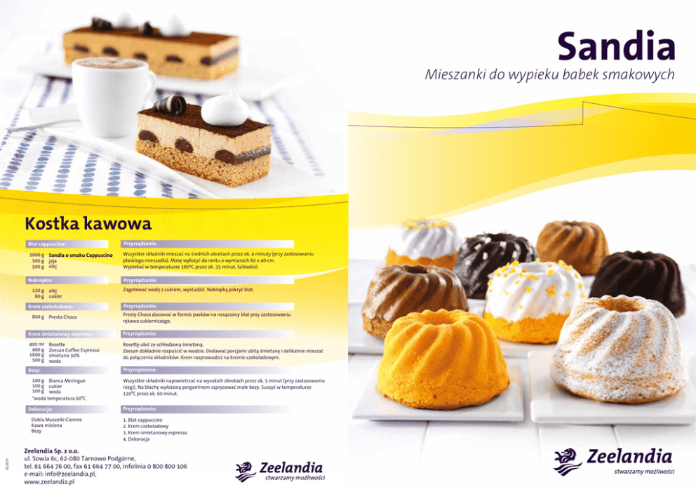 Sandia Mieszanki do wypieku babek smakowych Kostka kawowa Blat cappuccino: Przyrządzanie: 1000 g Sandia o smaku Cappuccino 500 g jaja 500 g olej Wszystkie składniki mieszać na średnich obrotach przez ok. 4 minuty (przy zastosowaniu płaskiego mieszadła). Masę wyłożyć do rantu o wymiarach 60 x 40 cm. Wypiekać w temperaturze 180ºC przez ok. 35 minut. Schłodzić. Nakropka: Przyrządzanie: 120 g olej 80 g cukier Krem czekoladowy: 800 g Presta Choco Przyrządzanie: Prestę Choco dozować w formie pasków na nasączony blat przy zastosowaniu rękawa cukierniczego. Krem śmietanowy espresso: Przyrządzanie: 400 ml 400 g 1600 g 500 g Rosettę ubić ze schłodzoną śmietaną. Zeesan dokładnie rozpuścić w wodzie. Dodawać porcjami ubitą śmietanę i delikatnie mieszać do połączenia składników. Krem rozprowadzić na kremie czekoladowym. Rosette Zeesan Coffee Espresso śmietana 30% woda Bezy: 100 g Bianca Meringue 100 g cukier 100 g woda *woda temperatura 600C Dekoracja: Dobla Muszelki Ciemne Kawa mielona Bezy 02.2015 Zagotować wodę z cukrem, wystudzić. Nakropką pokryć blat. Przyrządzanie: Wszystkie składniki napowietrzać na wysokich obrotach przez ok. 5 minut (przy zastosowaniu rózgi). Na blachę wyłożoną pergaminem szprycować małe bezy. Suszyć w temperaturze 1200C przez ok. 60 minut. Przyrządzanie: 1. Blat cappuccino 2. Krem czekoladowy 3. Krem śmietanowy espresso 4. Dekoracja Zeelandia Sp. z o.o. ul. Sowia 6c, 62-080 Tarnowo Podgórne, tel. 61 664 76 00, fax 61 664 77 00, infolinia 0 800 800 106 e-mail: [email protected], www.zeelandia.pl Zalety: szybkość przygotowania łatwość przygotowania delikatna struktura ciasta dłuższe zachowanie świeżości babek i ciast stała jakość wypieków Linia mieszanek do wypieku babek smakowych, która uzupełnia naszą ofertę ciast biszkoptowo-tłuszczowych. Mieszanki z linii Sandia są proste i szybkie w użyciu, dzięki czemu umożliwiają urozmaicenie asortymentu produkowanych ciast wygodnie, bezpiecznie i w atrakcyjnej cenie. W skład linii Sandia wchodzi pieć produktów: Sandia, Sandia o smaku Pomarańczowym, Sandia o smaku Cytrynowym, Sandia o smaku Czekoladowym oraz nowość: Sandia o smaku Cappuccino. Sandia Miks do wypieku babek o delikatnym maślanym smaku Sandia o smaku Czekoladowym Mieszanka do wypieku babek o smaku czekoladowym, charakteryzuje się intensywną ciemną barwą i prawdziwie czekoladowym smakiem. Babka o smaku czekoladowym Ciasto: Przyrządzanie: 1000 g Sandia o smaku Czekoladowym • wszystkie składniki mieszać na średnich obrotach przez około 5 minut przy zastosowaniu 500 g olej płaskiego mieszadła • masę nakładać do natłuszczonych foremek • wypiekać w temp. 500 g jaja około 180 ºC przez około 50 minut (w zależności od naważki ciasta). Babka klasyczna Przyrządzanie: Ciasto: 1000 g Sandia 460 g jaja 460 g olej / margaryna • Wszystkie składniki mieszać na średnich obrotach przez około 5 minut przy zastosowaniu płaskiego mieszadła • masę nakładać do natłuszczonych foremek • wypiekać w temp. około 180ºC przez około 50 minut (w zależności od naważki ciasta). Sandia o smaku Pomarańczowym Mieszanka do wypieku babek o orzeźwiającym pomarańczowym smaku i przyjemnej pomarańczowej barwie. Babka o smaku pomarańczowym NOWOŚĆ! Sandia o smaku Cappuccino Sandia o smaku Cappuccino to mieszanka do wyrobu babek o delikatnej nucie kawy z mlekiem. Stanowi ona doskonałe uzupełnienie linii Sandia. Sandia o smaku Cappuccino charakteryzuje się przyjemną brązową barwą, wspaniałym aromatem i wyrazistym smakiem. Doskonale sprawdzi się jako samodzielna babka, oraz w formie blatów do ciast deserowych. Babka o smaku Cappuccino Ciasto: Przyrządzanie: 1000 g Sandia o smaku Cappuccino 500 g olej 500 g jaja • wszystkie składniki mieszać na średnich obrotach przez około 4 minuty przy zastosowaniu płaskiego mieszadła • masę nakładać do natłuszczonych foremek • wypiekać w temp. około 180 ºC przez około 50 minut (w zależności od naważki ciasta). Ciasto: Przyrządzanie: 1000 g Sandia o smaku Pomarańczowym 460g olej 460g jaja • wszystkie składniki mieszać na średnich obrotach przez około 5 minut przy zastosowaniu płaskiego mieszadła • masę nakładać do natłuszczonych foremek • wypiekać w temp. około 180 ºC przez około 50 minut (w zależności od naważki ciasta). Sandia o smaku Cytrynowym Mieszanka do wypieku babek o przyjemnej cytrynowej nucie oraz słoneczno – żółtej barwie. Babka o smaku cytrynowym Ciasto: Przyrządzanie: 1000 g Sandia o smaku Cytrynowym 460g olej 460g jaja • wszystkie składniki mieszać na średnich obrotach przez około 5 minut przy zastosowaniu płaskiego mieszadła • masę nakładać do natłuszczonych foremek • wypiekać w temp. około 180 ºC przez około 50 minut (w zależności od naważki ciasta).