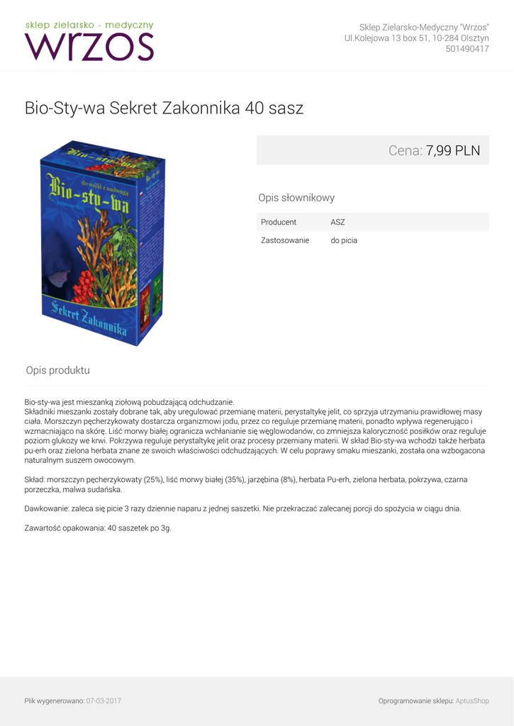 Sklep Zielarsko-Medyczny "Wrzos" Ul.Kolejowa 13 box 51, 10-284 Olsztyn 501490417 Bio-Sty-wa Sekret Zakonnika 40 sasz Cena: 7,99 PLN Opis słownikowy Producent ASZ Zastosowanie do picia Opis produktu Bio-sty-wa jest mieszanką ziołową pobudzającą odchudzanie. Składniki mieszanki zostały dobrane tak, aby uregulować przemianę materii, perystaltykę jelit, co sprzyja utrzymaniu prawidłowej masy ciała. Morszczyn pęcherzykowaty dostarcza organizmowi jodu, przez co reguluje przemianę materii, ponadto wpływa regenerująco i wzmacniająco na skórę. Liść morwy białej ogranicza wchłanianie się węglowodanów, co zmniejsza kaloryczność posiłków oraz reguluje poziom glukozy we krwi. Pokrzywa reguluje perystaltykę jelit oraz procesy przemiany materii. W skład Bio-sty-wa wchodzi także herbata pu-erh oraz zielona herbata znane ze swoich właściwości odchudzających. W celu poprawy smaku mieszanki, została ona wzbogacona naturalnym suszem owocowym. Skład: morszczyn pęcherzykowaty (25%), liść morwy białej (35%), jarzębina (8%), herbata Pu-erh, zielona herbata, pokrzywa, czarna porzeczka, malwa sudańska. Dawkowanie: zaleca się picie 3 razy dziennie naparu z jednej saszetki. Nie przekraczać zalecanej porcji do spożycia w ciągu dnia. Zawartość opakowania: 40 saszetek po 3g. Plik wygenerowano: 07-03-2017 Powered by TCPDF (www.tcpdf.org) Oprogramowanie sklepu: AptusShop