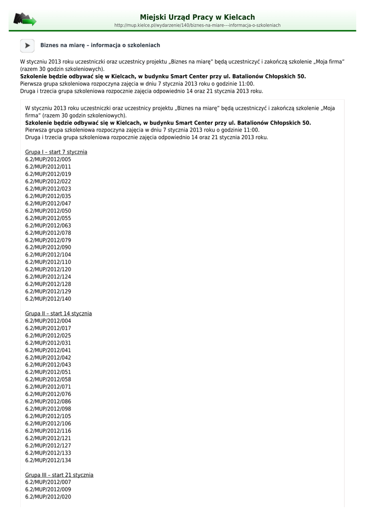 Miejski Urząd Pracy w Kielcach http://mup.kielce.pl/wydarzenie/140/biznes-na-miare-–-informacja-o-szkoleniach Biznes na miarę – informacja o szkoleniach W styczniu 2013 roku uczestniczki oraz uczestnicy projektu „Biznes na miarę” będą uczestniczyć i zakończą szkolenie „Moja firma” (razem 30 godzin szkoleniowych). Szkolenie będzie odbywać się w Kielcach, w budynku Smart Center przy ul. Batalionów Chłopskich 50. Pierwsza grupa szkoleniowa rozpoczyna zajęcia w dniu 7 stycznia 2013 roku o godzinie 11:00. Druga i trzecia grupa szkoleniowa rozpocznie zajęcia odpowiednio 14 oraz 21 stycznia 2013 roku. W styczniu 2013 roku uczestniczki oraz uczestnicy projektu „Biznes na miarę” będą uczestniczyć i zakończą szkolenie „Moja firma” (razem 30 godzin szkoleniowych). Szkolenie będzie odbywać się w Kielcach, w budynku Smart Center przy ul. Batalionów Chłopskich 50. Pierwsza grupa szkoleniowa rozpoczyna zajęcia w dniu 7 stycznia 2013 roku o godzinie 11:00. Druga i trzecia grupa szkoleniowa rozpocznie zajęcia odpowiednio 14 oraz 21 stycznia 2013 roku. Grupa I – start 7 stycznia 6.2/MUP/2012/005 6.2/MUP/2012/011 6.2/MUP/2012/019 6.2/MUP/2012/022 6.2/MUP/2012/023 6.2/MUP/2012/035 6.2/MUP/2012/047 6.2/MUP/2012/050 6.2/MUP/2012/055 6.2/MUP/2012/063 6.2/MUP/2012/078 6.2/MUP/2012/079 6.2/MUP/2012/090 6.2/MUP/2012/104 6.2/MUP/2012/110 6.2/MUP/2012/120 6.2/MUP/2012/124 6.2/MUP/2012/128 6.2/MUP/2012/129 6.2/MUP/2012/140 Grupa II – start 14 stycznia 6.2/MUP/2012/004 6.2/MUP/2012/017 6.2/MUP/2012/025 6.2/MUP/2012/031 6.2/MUP/2012/041 6.2/MUP/2012/042 6.2/MUP/2012/043 6.2/MUP/2012/051 6.2/MUP/2012/058 6.2/MUP/2012/071 6.2/MUP/2012/076 6.2/MUP/2012/086 6.2/MUP/2012/098 6.2/MUP/2012/105 6.2/MUP/2012/106 6.2/MUP/2012/116 6.2/MUP/2012/121 6.2/MUP/2012/127 6.2/MUP/2012/133 6.2/MUP/2012/134 Grupa III – start 21 stycznia 6.2/MUP/2012/007 6.2/MUP/2012/009 6.2/MUP/2012/020 6.2/MUP/2012/027 6.2/MUP/2012/034 6.2/MUP/2012/038 6.2/MUP/2012/049 6.2/MUP/2012/053 6.2/MUP/2012/054 6.2/MUP/2012/056 6.2/MUP/2012/069 6.2/MUP/2012/070 6.2/MUP/2012/081 6.2/MUP/2012/095 6.2/MUP/2012/097 6.2/MUP/2012/099 6.2/MUP/2012/114 6.2/MUP/2012/119 6.2/MUP/2012/135 6.2/MUP/2012/141