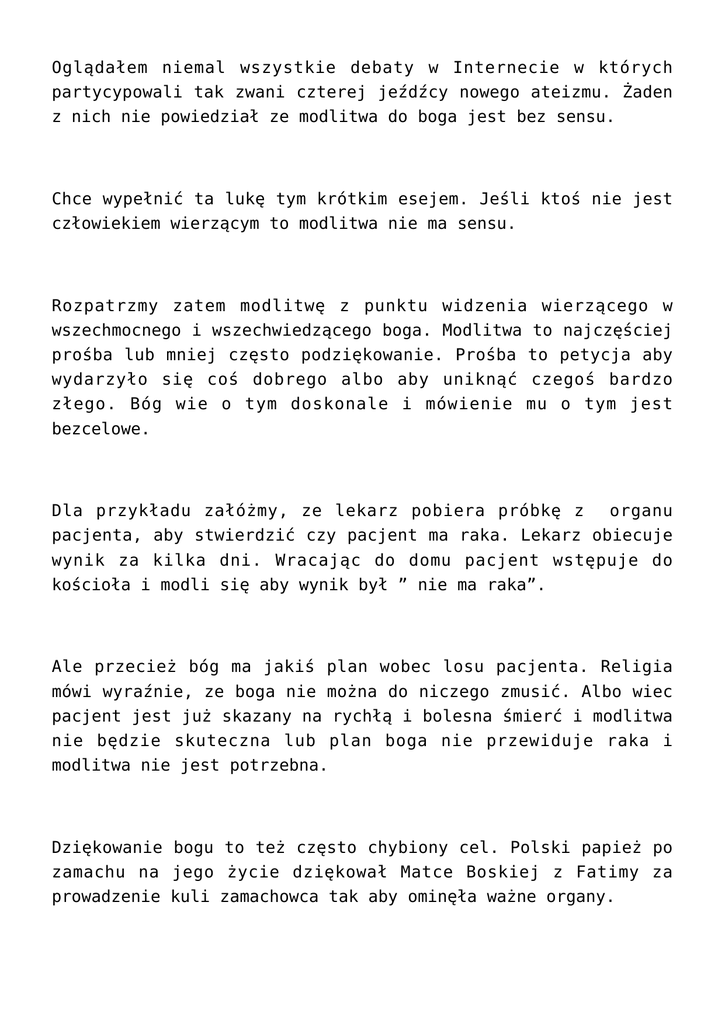 Oglądałem niemal wszystkie debaty w Internecie w których partycypowali tak zwani czterej jeźdźcy nowego ateizmu. Żaden z nich nie powiedział ze modlitwa do boga jest bez sensu. Chce wypełnić ta lukę tym krótkim esejem. Jeśli ktoś nie jest człowiekiem wierzącym to modlitwa nie ma sensu. Rozpatrzmy zatem modlitwę z punktu widzenia wierzącego w wszechmocnego i wszechwiedzącego boga. Modlitwa to najczęściej prośba lub mniej często podziękowanie. Prośba to petycja aby wydarzyło się coś dobrego albo aby uniknąć czegoś bardzo złego. Bóg wie o tym doskonale i mówienie mu o tym jest bezcelowe. Dla przykładu załóżmy, ze lekarz pobiera próbkę z organu pacjenta, aby stwierdzić czy pacjent ma raka. Lekarz obiecuje wynik za kilka dni. Wracając do domu pacjent wstępuje do kościoła i modli się aby wynik był ” nie ma raka”. Ale przecież bóg ma jakiś plan wobec losu pacjenta. Religia mówi wyraźnie, ze boga nie można do niczego zmusić. Albo wiec pacjent jest już skazany na rychłą i bolesna śmierć i modlitwa nie będzie skuteczna lub plan boga nie przewiduje raka i modlitwa nie jest potrzebna. Dziękowanie bogu to też często chybiony cel. Polski papież po zamachu na jego życie dziękował Matce Boskiej z Fatimy za prowadzenie kuli zamachowca tak aby ominęła ważne organy. Uratowali go kompetentni włoscy lekarze, a kula nie była cudownie prowadzona, bo cudowna ręka skierowałaby pocisk poza ciało ofiary, a nie tylko kilka centymetrów od kręgosłupa. Można też zapytać w jaki sposób papież wiedział ze była za tym cudem ręka MB z Fatimy a nie z Ostrej Bramy.