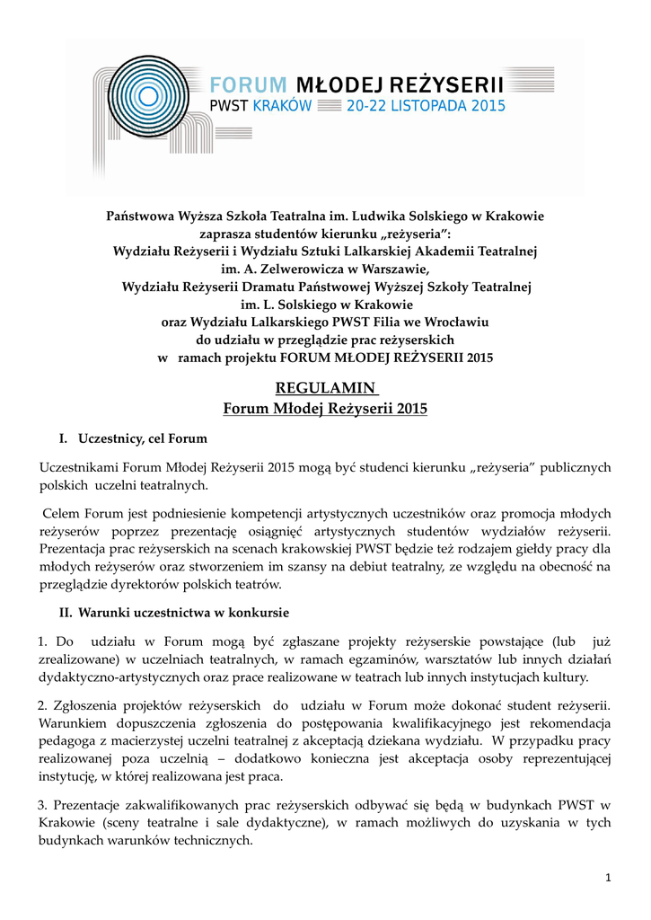 REGULAMIN Forum Młodej Reżyserii 2015 - Kraków