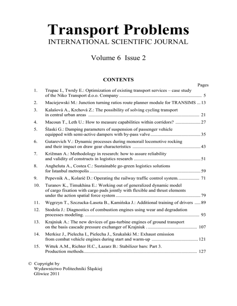 Transport Problems INTERNATIONAL SCIENTIFIC JOURNAL Volume 6 Issue 2 CONTENTS Pages 1. Trupac I., Twrdy E.: Optimization of existing transport services – case study of the Niko Transport d.o.o. Company ..................................................................... 5 2. Maciejewski M.: Junction turning ratios route planner module for TRANSIMS ... 13 3. Kalašová A., Krchová Z.: The possibility of solving cycling transport in central urban areas ............................................................................................. 21 4. Macoun T., Leth U.: How to measure capabilities within corridors? ..................... 27 5. Ślaski G.: Damping parameters of suspension of passenger vehicle equipped with semi-active dampers with by-pass valve .......................................... 35 6. Gutarevich V.: Dynamic processes during monorail locomotive rocking and their impact on draw gear characteristics ......................................................... 43 7. Križman A.: Methodology in research: how to assure reliability and validity of constructs in logistics research ........................................................ 51 8. Angheluta A., Costea C.: Sustainable go-green logistics solutions for Istanbul metropolis ............................................................................................. 59 9. Pepevnik A., Kolarič D.: Operating the railway traffic control system. ................. 71 10. Turanov K., Timukhina E.: Working out of generalized dynamic model of cargo fixation with cargo pads jointly with flexible and thrust elements under the action spatial force system ....................................................................... 79 11. Węgrzyn T., Szczucka-Lasota B., Kamińska J.: Additional training of drivers ..... 89 12. Stodola J.: Diagnostics of combustion engines using wear and degradation processes modeling. ................................................................................................ 93 13. Krajniuk A.: The new devices of gas-turbine engines of ground transport on the basis cascade pressure exchanger of Krajniuk . ......................................... 107 14. Merkisz J., Pielecha I., Pielecha J., Szukalski M.: Exhaust emission from combat vehicle engines during start and warm-up ....................................... 121 15. Wittek A.M., Richter H.C., Łazarz B.: Stabilizer bars: Part 3. Production methods............................................................................................... 127 © Copyright by Wydawnictwo Politechniki Śląskiej Gliwice 2011 Problemy Transportu MIĘDZYNARODOWE CZASOPISMO NAUKOWE Tom 6, zeszyt 2 SPIS TREŚCI Strona 1. Trupac I., Twrdy E.: Optymalizacja istniejących usług transportowych – studium przypadku Niko Transport d.o.o. Company ................................................................... 5 2. Maciejewski M.: Moduł planowania marszrut dla systemu TRANSIMS na podstawie rozkładów natężeń ruchu na skrzyżowaniach ...................................... 13 3. Kalašová A., Krchová Z.: Możliwości rozwiązywania problemów transportu w centrach miast przy wykorzystaniu transportu rowerowego ................................... 21 4. Macoun T., Leth U.: Jak zmierzyć przepustowość w obrębie korytarzy? .................. 27 5. Ślaski G.: Parametry tłumienia zawieszenia samochodu osobowego wyposażonego w amortyzatory półaktywne z zaworem obejściowym ........................ 35 6. Gutarevich V.: Dynamiczne procesy kołysania lokomotywy jednotorowej i ich wpływ na parametry napędu trakcyjnego ............................................................. 43 7. Križman A.: Metodologia w badaniu: jak zapewnić rzetelność i ważność koncepcji w badaniach logistycznych ........................................................................................... 51 8. Angheluta A., Costea C.: Zrównoważone trwałe ekologicznie (go-green) rozwiązania logistyczne dla rozwijających się metropolii – przypadek Istambułu ..... 59 9. Pepevnik A., Kolarič D.: Działanie systemu sterowania ruchem kolejowym............. 71 10. Turanov K., Timukhina E.: Opracowanie dynamicznego modelu mocowania ładunku z podkładkami wraz z giętkimi i sztywnymi elementami przy oddziaływaniu przestrzennego układu sił..................................................................... 79 11. Węgrzyn T., Szczucka-Lasota B., Kamińska J.: Dokształcanie kierowców ................ 89 12. Stodola J.: Modelowanie procesów zużycia i degradacji w diagnostyce silników spalinowych ................................................................................................................. 93 13. Krajniuk A.: nowe urządzenia silników gazoturbinowych transportu naziemnego na podstawie kaskadowego wymiennika ciśnienia konstrukcji Krajniuka ................ 107 14. Merkisz J., Pielecha I., Pielecha J., Szukalski M.: Emisja szkodliwych składników spalin z silników wozów bojowych podczas rozruchu .............................................. 121 15. Wittek A.M., Richter H.C., Łazarz B.: Stabilizatory samochodowe: Część 3. Metody produkcyjne ................................................................................................. 127 © Copyright by Wydawnictwo Politechniki Śląskiej Gliwice 2011