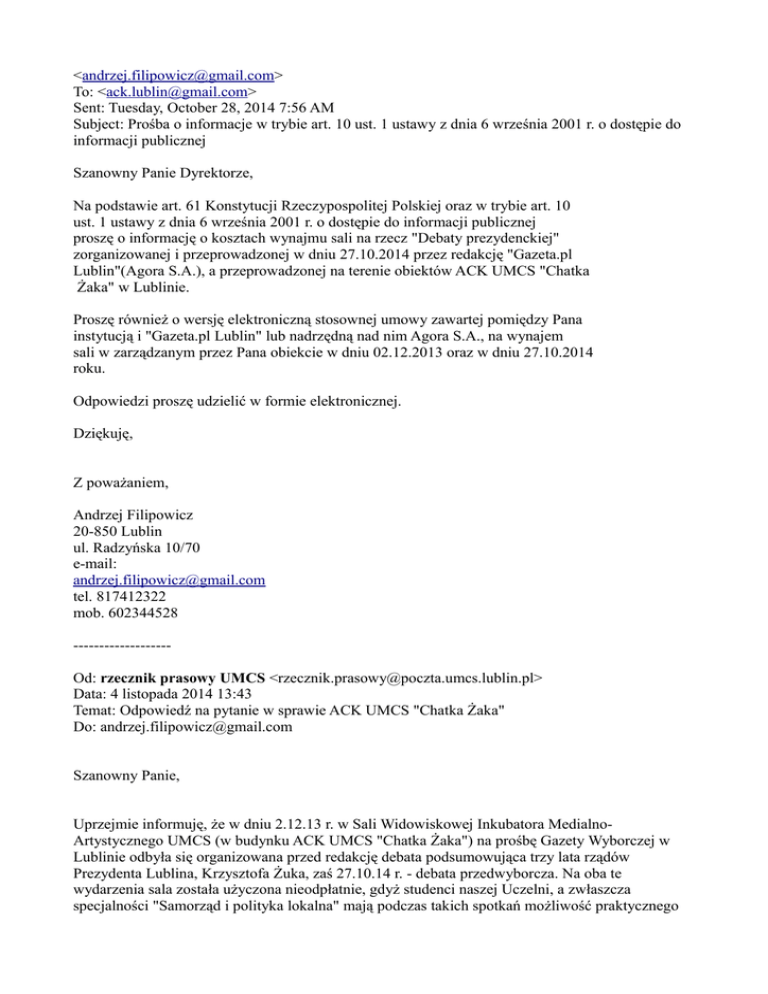 <[email protected]> To: <[email protected]> Sent: Tuesday, October 28, 2014 7:56 AM Subject: Prośba o informacje w trybie art. 10 ust. 1 ustawy z dnia 6 września 2001 r. o dostępie do informacji publicznej Szanowny Panie Dyrektorze, Na podstawie art. 61 Konstytucji Rzeczypospolitej Polskiej oraz w trybie art. 10 ust. 1 ustawy z dnia 6 września 2001 r. o dostępie do informacji publicznej proszę o informację o kosztach wynajmu sali na rzecz "Debaty prezydenckiej" zorganizowanej i przeprowadzonej w dniu 27.10.2014 przez redakcję "Gazeta.pl Lublin"(Agora S.A.), a przeprowadzonej na terenie obiektów ACK UMCS "Chatka Żaka" w Lublinie. Proszę również o wersję elektroniczną stosownej umowy zawartej pomiędzy Pana instytucją i "Gazeta.pl Lublin" lub nadrzędną nad nim Agora S.A., na wynajem sali w zarządzanym przez Pana obiekcie w dniu 02.12.2013 oraz w dniu 27.10.2014 roku. Odpowiedzi proszę udzielić w formie elektronicznej. Dziękuję, Z poważaniem, Andrzej Filipowicz 20-850 Lublin ul. Radzyńska 10/70 e-mail: [email protected] tel. 817412322 mob. 602344528 ------------------Od: rzecznik prasowy UMCS <[email protected]> Data: 4 listopada 2014 13:43 Temat: Odpowiedź na pytanie w sprawie ACK UMCS "Chatka Żaka" Do: [email protected] Szanowny Panie, Uprzejmie informuję, że w dniu 2.12.13 r. w Sali Widowiskowej Inkubatora MedialnoArtystycznego UMCS (w budynku ACK UMCS "Chatka Żaka") na prośbę Gazety Wyborczej w Lublinie odbyła się organizowana przed redakcję debata podsumowująca trzy lata rządów Prezydenta Lublina, Krzysztofa Żuka, zaś 27.10.14 r. - debata przedwyborcza. Na oba te wydarzenia sala została użyczona nieodpłatnie, gdyż studenci naszej Uczelni, a zwłaszcza specjalności "Samorząd i polityka lokalna" mają podczas takich spotkań możliwość praktycznego zapoznania się z funkcjonowaniem samorządu terytorialnego. W obu przypadkach za stronę organizacyjną spotkań odpowiadała redakcja Gazety Wyborczej. Z wyrazami szacunku, Magdalena Kozak-Siemińska Rzecznik Prasowy UMCS ----------------------------------------Od: MagicCam01 . <[email protected]> Data: 4 listopada 2014 15:12 Temat: Re: Odpowiedź na pytanie w sprawie ACK UMCS "Chatka Żaka" Do: [email protected] Szanowna Pani Rzecznik, Dziękuję za odpowiedź na moją prośbę o informacje na wniosek. Rozumiem, że mające miejsce pominięcie przez redakcję "Gazety Wyborczej" dwóch kandydatów w "debacie prezydenckiej" uzyskało Państwa akceptację jako dopuszczalna forma praktycznego zapoznania studentów z dyskryminacja na tle politycznym. Z uwagi na fakt, iż nie spotkałem się ze strony Władz UMCS z żadną formą potępienia wybiórczego zaproszenia do "debaty prezydenckiej" tylko kandydatów akceptowanych przez organ prasowy Agora S.A. - mam nadzieję, że żaden z pominiętych kandydatów nie jest narodowości żydowskiej, bo mogłoby się to spotkać z daleko dalej idącymi reperkusjami krajowymi i międzynarodowymi, niż tylko zniesmaczenie jednego z mieszkańców miasta Lublin. Moje zniesmaczenie jest wprost proporcjonalne do okrągłych w dacie rocznic powołania do życia UMCS jako publicznej uczelni i "odzyskania wolności" przez Polskę. Z poważaniem, Andrzej Filipowicz -------------------------Od: rzecznik prasowy UMCS <[email protected]> Data: 5 listopada 2014 08:37 Temat: Re: Odpowiedź na pytanie w sprawie ACK UMCS "Chatka Żaka" Do: "MagicCam01 ." <[email protected]> Szanowny Panie, Jeszcze raz pragnę podkreślić, że za stronę organizacyjną obu debat odpowiadała redakcja Gazety Wyborczej. Pan Rektor zgodził się na organizację w Chatce Żaka debaty przedwyborczej w dn. 27.10.14 r. dlatego, że był przekonany, że zostali do niej zaproszeni wszyscy kandydaci na urząd prezydenta Lublina. Z wyrazami szacunku, Magdalena Kozak-Siemińska Rzecznik Prasowy UMCS ---------------------------------Od: MagicCam01 . <[email protected]> Data: 5 listopada 2014 08:57 Temat: Re: Odpowiedź na pytanie w sprawie ACK UMCS "Chatka Żaka" Do: [email protected] Szanowna Pani Rzecznik, Jeszcze raz pragnę podkreślić, że nie jest mi znane żadne publiczne oświadczenie Pana Rektora, w którym wyraziłby swoją dezaprobatę wobec pogwałcenia Art. 32 Konstytucji RP, do którego doszło na terenie zarządzanej przez Niego publicznej instytucji. Pani wyjaśnienia przyjmuję do wiadomości ale ich nie akceptuję, bo urągałoby to elementarnemu poczuciu sprawiedliwości i odpowiedzialności za moje miasto i ojczyznę. Proszę w żadnym wypadku nie odbierać do siebie moich uwag i zastrzeżeń, bo wiem doskonale, że jest Pani tylko i wyłącznie rzecznikiem uczelni publicznej, na terenie której doszło do naruszenie nie tylko Konstytucji RP ale również Karty praw podstawowych UE. Z poważaniem, Andrzej Filipowicz