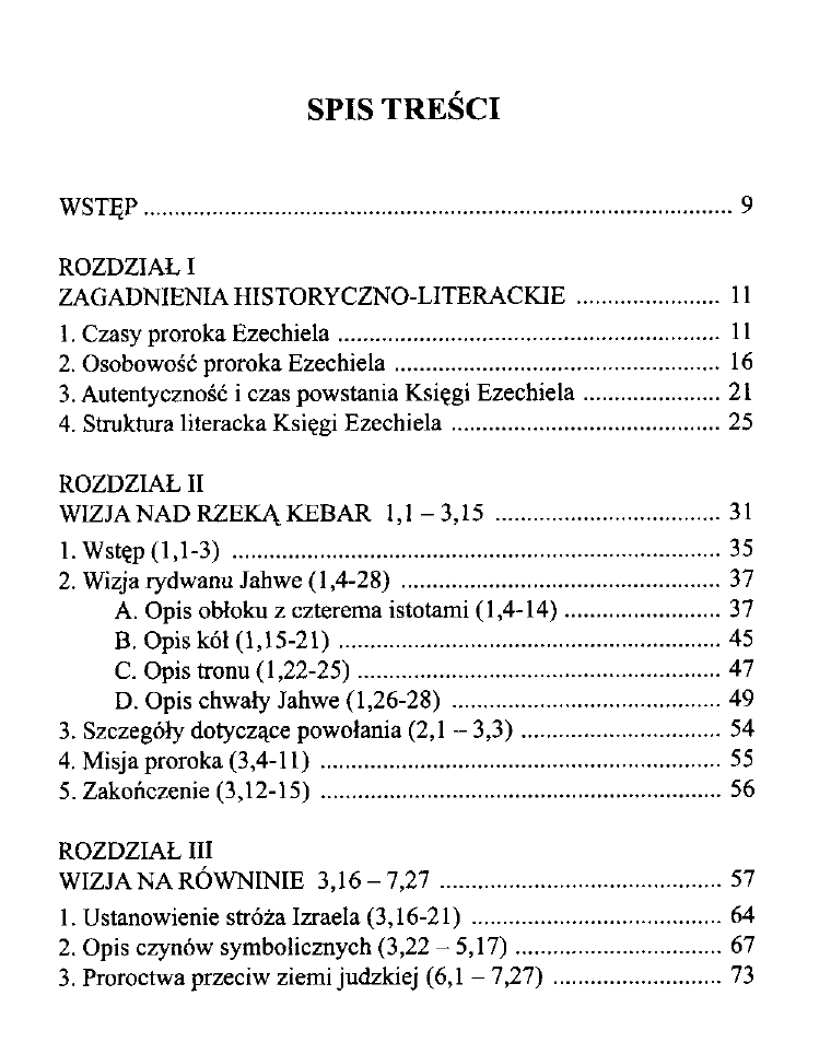 ROZDZIAŁ I ZAGADNIENIA HISTORYCZNO-LITERACKIE 1. Czasy proroka Ezechiela 2. Osobowość proroka Ezechiela 3. Autentyczność i czas powstania Księgi Ezechiela 4. Struktura literacka Księgi Ezechiela ROZDZIAŁ II WIZJA NAD RZEKĄ KEBAR 1,1-3,15 1. Wstęp (1,1-3) 2. Wizja rydwanu Jahwe (1,4-28) A. Opis obłoku z czterema istotami (1,4-14).. B. Opis kół (1,15-21) C. Opis tronu (1,22-25) D. Opis chwały Jahwe (1,26-28) 3. Szczegóły dotyczące powołania (2,1 - 3,3) 4. Misja proroka (3,4-11) 5. Zakończenie (3,12-15) ROZDZIAŁ III WIZJA NA RÓWNINIE 3 , 1 6 - 7 , 2 7 1. Ustanowienie stróża Izraela (3,16-21) 2. Opis czynów symbolicznych (3,22 - 5,17) 3. Proroctwa przeciw ziemi judzkiej (6,1 - 7,27) .... ROZDZIAŁ IV WIZJA W DOMU 8 , 1 - 1 1 , 2 5 1. Wizja zbezczeszczenia świątyni (8,1-18) 2. Zagłada Jerozolimy i częściowe ocalenie (9,1-11) A. Wielkość przewinień narodu wybranego B. Sprawiedliwość Boga C. Znak „TAW" gwarancją ocalenia sprawiedliwych D. Znaczenie pojęcia „Reszty" 3. Ponowna wizja chwały Jahwe (10,1-22) 4. Wyrocznia o zniszczeniu miasta (11,1-25) ROZDZIAŁ V POTĘPIENIE LUDU I PRZYWÓDCÓW 12,1 - 14,23 1. Dwa czyny symboliczne (12,1-16.17-28) 2. Fałszywi prorocy i prorokinie (13,1-16.17-23) 3. Prorocy i sprawiedliwi (14,1-23) ROZDZIAŁ VI ALEGORIE I METAFORY SĄDU 15,1 - 19,14 1. Alegoria o winorośli (15,1-8) 2. Symboliczny opis dziejów Jerozolimy (16,1-63) A. Przyrównanie Jerozolimy do cudzołożnicy (16,1-43) B. Przyrównanie Jerozolimy do Sodomy i Samarii (16,44-63) 3. Alegoria orła (17,1-24) 4. Zasada odpowiedzialności osobistej (18,1-32) 5. Lamentacje nad królami Judy (19,1-14) ROZDZIAŁ VII OSKARŻENIE I SĄD 20,1 - 2 4 , 2 7 1. Historia niewierności Izraela (20,1-44) A. Wstęp (ww. 1-3) B. Dzieje niewierności Izraela (ww. 4-31) C. Opis sądu (ww. 32-44) 2. Miecz jako symbol sądu (21,1-37) A. Miecz skierowany przeciwko południu (ww. 1-12) B. Miecz do zabijania (ww. 13-22) C. Miecz króla Babilonu (ww. 23-32) D. Miecz skierowany przeciwko Ammonitom (ww. 33-37).... 3. Metafory sądu (22,1-31) A. Obrzydliwości w mieście i rozlew krwi (ww. 1-16) B. Boży gniew jako kara (ww. 17-22) C. Wszyscy są winni (ww. 23-31) 4. Motyw dwóch sióstr (23,1-49) A. Alegoria dwóch sióstr (ww. 1-35) B. Dodatek (ww. 36-49) 5. Znaki końca (24,1-27) A. Wrzący kocioł (ww. 1-14) B. Śmierć żony Ezechiela (ww. 15-27) ROZDZIAŁ VIII WYROCZNIE PRZECIW OBCYM NARODOM 25,1 - 32,32 1. Wyrocznie 2. Wyrocznia 3. Wyrocznia 4. Wyrocznie przeciwko przeciwko przeciwko przeciwko małym narodom (25,1-17) Tyrowi (26,1 - 28,19) Sydonowi (28,20-26) Egiptowi (29,1 - 32,32) ROZDZIAŁ IX OBIETNICE ODRODZENIA 33,1 - 3 9 , 2 9 1. Nowe powołanie proroka (33,1-33) A. Prorok stróżem Izraela (33,1-9) B. Odpowiedzialność osobista (33,10-20) C. Nowe warunki przesłania (33,21-33) 2. Oczyszczenie wspólnoty mieszkającej w kraju (34 - 37) A. Bóg Pasterzem Izraela (34) a. Oskarżenie złych pasterzy i ich potępienie (34,1-10) b. Bóg jako dobry pasterz (34,11-16) c. Sąd nad owcami (34,17-22) d. Zapowiedź nowego Pasterza (34,23-24) e. Przymierze pokoju (34,25-31) B. Góry Izraela (35,1 - 36,15) C. Duchowe oczyszczenie Izraela (36,16-38 D. Odnowienie ludu Izraela (37,1-28) a. Wizja wysuszonych kości (37,1-14) a. Dolina wysuszonych kości (37,1-10) p. Otwarte grobowce (37,11-14) y. Znaczenie wizji ożywionych kości b. Połączenie dwóch kawałków drewna (37,15-28) 3. Alegoryczna wizja Goga ( 3 8 - 3 9 ) A. Gog i Magog B. Wymiar eschatologiczno-apokaliptyczny ROZDZIAŁ X WIZJA NOWEJ ŚWIĄTYNI I NOWEGO KULTU 40,1 - 48,35 . 1. Znaczenie sanktuarium centralnego w Jerozolimie A. Świątynia znakiem wybrania B. Świątynia znakiem obecności Boga C. Świątynia wyrazem przymierza z Bogiem D. Odejście chwały Jahwe 2. Świątynia Ezechiela ośrodkiem nowego Izraela A. Symboliczna wizja świątyni B. Tora Ezechiela 3. Związek nowej świątyni z odnowionym przymierzem A. Ożywcze działanie strumienia wody B. Nowy podział kraju C. „Jahwe jest tam" ZAKOŃCZENIE WAŻNIEJSZE KOMENTARZE DO EZECHIELA