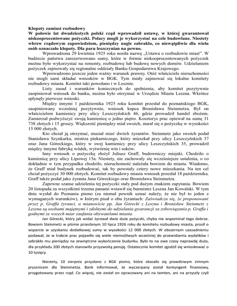 Kłopoty zamiast rozbudowy W połowie lat dwudziestych polski rząd wprowadził ustawę, w której gwarantował niskooprocentowane pożyczki. Polacy mogli je wykorzystać na cele budowlane. Niestety wbrew rządowym zapowiedziom, pieniędzy nagle zabrakło, co niewątpliwie dla wielu osób oznaczało kłopoty. Dla paru leszczynian na pewno. Wprowadzona 29 kwietnia 1925 roku nosiła nazwę „Ustawa o rozbudowie miast”. W budżecie państwa zarezerwowano sumy, które w formie niskooprocentowanych pożyczek można było wykorzystać na remonty, rozbudowę lub budowę nowych domów. Udzielaniem pożyczek zajmowały się regionalne oddziały Banku Gospodarstwa Krajowego. Wprowadzono jeszcze jeden ważny warunek prawny. Otóż właściciele nieruchomości nie mogli sami składać wniosków w BGK. Tym miały zajmować się lokalne komitety rozbudowy miasta. Komitet taki powołano i w Lesznie. Listy zasad i warunków koniecznych do spełnienia, aby komitet pozytywnie zaopiniował wniosek do banku, można było otrzymać w Urzędzie Miasta Leszna. Wkrótce spłynęły pierwsze wnioski. Między innymi 1 października 1925 roku komitet przesłał do poznańskiego BGK, zaopiniowany wcześniej pozytywnie, wniosek kupca Bronisława Steinmetza. Był on właścicielem kamienicy przy ulicy Leszczyńskich 46, gdzie prowadził handel zbożem. Zamierzał podwyższyć swoją kamienicę o jedno piętro. Kosztorys prac opiewał na sumę 31 738 złotych i 15 groszy. Większość pieniędzy miał swoich, starał się o pożyczkę w wysokości 15 000 złotych. Kto chciał ją otrzymać, musiał mieć dwóch żyrantów. Steinmetz jako swoich podał Stanisława Szynkarka, mistrza piekarniczego, który mieszkał przy ulicy Leszczyńskich 37 oraz Jana Góreckiego, który w swej kamienicy przy ulicy Leszczyńskich 35, prowadził między innymi fabrykę wódek, wytwórnię win i soków. Inny wniosek o pożyczkę złożył Juliusz Graff, budowniczy miejski. Chodziło o kamienicę przy ulicy Lipowej 15a. Niestety, nie zachowały się wcześniejsze ustalenia, o co dokładnie w tym przypadku chodziło, nieruchomość należała bowiem do miasta. Wiadomo, że Graff miał budynek rozbudować, tak by powstały cztery nowe mieszkania. Na ten cel chciał pożyczyć 30 000 złotych. Komitet rozbudowy miasta wniosek przesłał 18 października. Graff także podał jako żyranta Jana Góreckiego oraz Bronisława Steinmetza. Zapewne szanse udzielenia tej pożyczki stały pod dużym znakiem zapytania. Bowiem 20 listopada za wszystkimi trzema panami wstawił się burmistrz Leszna Jan Kowalski. W tym dniu wysłał do Poznania pismo (za niemal pewnik uznać należy, że nie był to jeden z wymaganych warunków), w którym pisał o obu żyrantach: Zaświadcza się, że proponowani przez p. Graffa żyranci, a mianowicie pp. Jan Górecki z Leszna i Bronisław Steinmetz z Leszna są osobami majętnymi i zdolnymi do udzielania gwarancji za zobowiązania p. Graffa i godnymi ze wszech miar zaufania obywatelami miasta. Jan Górecki, który jak widać żyrował dwie duże pożyczki, chyba nie wspominał tego dobrze. Bowiem Steinmetz w piśmie przesłanym 10 lipca 1926 roku do komitetu rozbudowy miasta, prosił o wsparcie w uzyskaniu dodatkowej sumy w wysokości 12 000 złotych. W obszernym uzasadnieniu podawał, że w trakcie prac pojawiło się wiele niemożliwych wcześniej do przewidzenia wydatków i zabrakło mu pieniędzy na zewnętrzne wykończenie budynku. Było to na owe czasy naprawdę dużo, dla przykładu 200 złotych stanowiło przyzwoitą pensję. Ostatecznie komitet zgodził się wnioskować o 10 tysięcy. Niestety, 10 sierpnia przysłano z BGK pismo, które okazało się prawdziwym zimnym prysznicem dla Steinmetza. Bank informował, że wyczerpany został kontyngent finansowy, przygotowany przez rząd. Co więcej, nie został on opracowany ani na tamten, ani na przyszły czyli 1927 rok. I nie opracowano go już nigdy, w rządowej kasie zabrakło pieniędzy. We wrześniu 1926 roku Ministerstwo Skarbu zdołało jeszcze wywalczyć część pieniędzy. Przekazano je osobom, których wnioski już wcześniej rozpatrzono pozytywnie. W sumie wszystkie pieniądze jakimi ministerstwo dysponowało, stanowiły zaledwie 16 procent tych z roku 1925. Oznaczało to dla Steinmetza poważne problemy, o czym zresztą informował komitet rozbudowy miasta. Twierdził, że nie może dopuścić do tego, by obaj żyranci musieli za niego spłacać część kredytu. Nic nie wskórał, dodatkowej pożyczki nie dostał. Jak sobie poradził i czy rzeczywiście Stanisław Szynkarek oraz Jan Górecki nie musieli za niego płacić? Tego się już nie dowiemy, lecz na pewno cała sprawa kosztowała ich sporo nerwów. Damian Szymczak W tekście wykorzystałem fragment książki „Słodki i Kwaśny, bracia Jan i Józef Góreccy.”