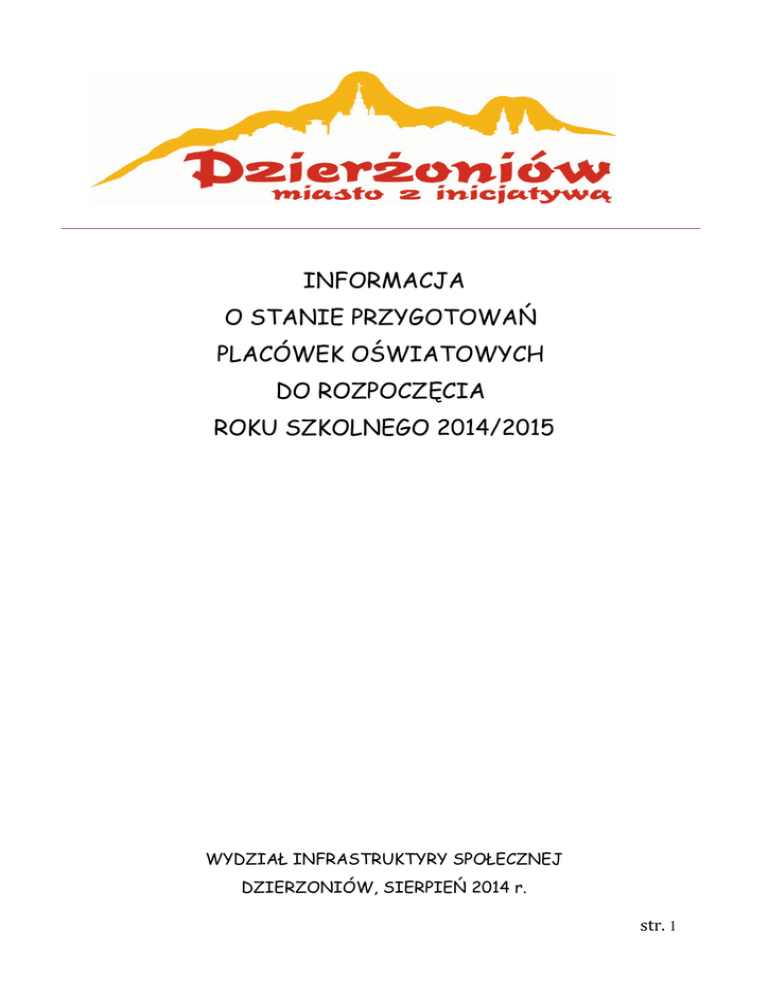 INFORMACJA O STANIE PRZYGOTOWAŃ PLACÓWEK OŚWIATOWYCH DO ROZPOCZĘCIA ROKU SZKOLNEGO 2014/2015 WYDZIAŁ INFRASTRUKTYRY SPOŁECZNEJ DZIERZONIÓW, SIERPIEŃ 2014 r. str. 1 SPIS TREŚCI I. LICZBA UCZNIÓW W PLACÓWKACH OŚWIATOWYCH A PROGNOZY DEMOGRAFICZNE………………………………………………………….....................3-10 II. STOPIEŃ WYKORZYSTANIA MIEJSC W PLACÓWKACH OŚWIATOWYCH……………………………………………………………..................11-12 III. POMOC FINANSOWA DLA UCZNIÓW: ➢ DARMOWY PRĘCZNIK DLA UCZNIÓW KL. I SZKOŁY PODSTAWOWEJ............13 NA ZAKUP PODRĘCZNIKÓW „WYPRAWKA SZKOLNA”………………….....13-14 STYPENDIA SOCJALNE……………………………………………………...........14-15 DOŻYWIANIE……………………………………………………………………..........15 IV. REMONTY ORAZ INWESTYCJE W PLACÓWKACH OŚWIATOWYCH ………………………….....................................................................................................16-20 V. DOCHODY WŁASNE SZKÓŁ I PRZEDSZKOLI PUBLICZNYCH…..………….........20 VI. REALIZACJA PROGRAMÓW OŚWIATOWYCH W ROKU SZKOLNYM 2012/2013………………....................................................................................................20-22 VII.PODSUMOWANIE………………………………………………………………......22-23 str. 2 I. Liczba uczniów w placówkach oświatowych a prognozy demograficzne 1. Przedszkola i żłobek Na terenie Dzierżoniowa sieć placówek oświatowych w porównaniu do roku ubiegłego uległa zmianie. Nadal funkcjonują trzy przedszkola publiczne, Oddział Przedszkolny w Szkole Podstawowej Nr 6 oraz jest sześć przedszkoli niepublicznych. Planowane jest, że w roku szkolnym 2014/2015 do dzierżoniowskich przedszkoli uczęszczać będzie ogółem 1035 dzieci, w tym 19 dzieci niepełnosprawnych. Liczba dzieci w porównaniu do poprzedniego roku szkolnego 2013/2014, kiedy to do przedszkoli zapisanych było 1076 ogółem dzieci, jest mniejsza o 41. W porównaniu do roku szkolnego 2012/2013 ta liczba zmalała o 5 dzieci a porównując do roku szkolnego 2011/2012 jest mniejsza o 17. Od kilku lat liczba dzieci w przedszkolach utrzymywała się na podobnym poziomie, natomiast w roku szkolnym 2014/2015 nastąpił spadek. Mniejsza liczba dzieci w przedszkolach spowodowana jest objęciem obowiązkiem szkolnym dzieci sześcioletnich urodzonych w pierwszym półroczu. W roku szkolnym 2014/2015 dzieci pięcioletnie - tak jak w roku ubiegłym - mają obowiązek odbycia rocznego przygotowania przedszkolnego, natomiast dzieci sześcioletnie (urodzone w pierwszej połowie roku) mają obowiązek pójścia do pierwszej klasy szkoły podstawowej. W roku szkolnym 2014/2015 w klasie I będzie 420 uczniów, z czego 167 to dzieci sześcioletnie, 2013/2014 – 48, 2012/2013 - 46 sześciolatków, w roku 2011/2012 było ich 68. Do przedszkoli publicznych uczęszczać będzie łącznie 494 przedszkolaków i będzie ich o 13 więcej niż w roku poprzednim. Natomiast w przedszkolach niepublicznych liczba dzieci zmalała z 595 w roku ubiegłym do 541 w roku bieżącym (mniej o 54). Liczba dzieci zapisanych do żłobka w roku szkolnym 2014/2015 wynosi 72. W żłobku utworzono 3 grupy. Dzieci do 14 miesiąca życia jest 20, maluchów od roku do 24 miesięcy jest 24, natomiast od 2 lat do3 lat -28 dzieci. Zapotrzebowanie na ten rodzaj usług zwiększa się. Świadczy o tym lista rezerwowa, na której zapisanych jest 15 dzieci oczekujących na przyjęcie. Dzieci, które ukończyły 2,5 roku przyjmowane są również do grup przedszkolnych. Od 1 września 2013 r. w Dzierżoniowie rozpoczął działalność Niepubliczny Żłobek „Akademia Maluszka”, do którego na rok szkolny 2014/2015 zapisanych jest 27 dzieci. W dalszym ciągu utrzymuje się zjawisko niżu demograficznego. W latach 2006 – 2013 liczba urodzeń waha się pomiędzy 257 – 261 urodzeń (tabela 8). Jedynie roczniki 2007, 2008, 2009, 2010 i 2012 przekraczają nieznacznie 300 urodzeń. str. 3 Tabela 1 Liczba dzieci i oddziałów w przedszkolach i żłobku w latach 2010/2011 – 2014/2015 Nazwa placówki Rok szkolny 2010/2011 liczba liczba dzieci oddział ów Przedszkole Publiczne Nr 1 im. Jana Brzechwy Przedszkole Publiczne Nr 2z Oddziałami Integracyjny mi i Oddziałem specjalnym Przedszkole Publiczne Nr 7 Oddział Przedszkolny w Szkole Podstawowej Nr 6 Niepubliczne Przedszkole Nr 3 „Pod Topolą” Niepubliczne Przedszkole Nr 4 Niepubliczne Przedszkole „Słoneczna Piątka” Niepubliczne Przedszkole Promujące Zdrowia „Szóstka” Niepubliczne Przedszkole Sióstr Salezjanek 150 6 150 6 150 6 152 6 160 6 123 6 145 7 151 7 147 7 159 8 126 5 125 5 127 5 154 6 150 6 - - - - - - 28 1 25 1 120 4 121 4 120 4 120 4 110 4 155 5 153 5 150 5 144 5 135 5 106 4 108 4 107 4 102 4 88 4 185 6 175 6 167 6 143 6 130 5 81 3 75 3 68 3 70 3 55 2 Przedszkole Językowe „Europejska Akademia Dziecka” - - - - - - 16 1 23 2 Łącznie: Żłobek Miejski Nr 1 1046 68 39 3 1052 72 40 3 1040 72 40 3 1076 72 43 3 1035 72 43 3 Rok szkolny 2011/2012 liczba liczba dzieci oddział ów Rok szkolny 2012/2013 liczba liczba dzieci oddział ów Rok szkolny 2013/2014 liczba liczba dzieci oddział ów Rok szkolny 2014/2015 liczba liczba dzieci oddziałó w str. 4 Wykres 1 Liczba dzieci w przedszkolach publicznych i niepublicznych na rok szkolny 2014/2015 160 159 150 160 135 140 130 110 120 88 100 80 55 60 40 25 23 20 0 PP 1 PP 2 PP 7 O. P. w SOP 6 NP 3 NP 4 NP 5 NP 6 NPSS P.J. ”E. A. D.” Wykres 2 Liczba dzieci i oddziałów w przedszkolach w latach 2010/2011-2014/2015 1200 1052 1076 1040 1035 1000 800 600 400 200 40 40 43 43 0 2011/2012 2012/2013 Liczba dzieci ogółem 2013/2014 2014/2015 Liczba oddziałów str. 5 2. Szkoły podstawowe i gimnazja 1 września 2014 roku naukę rozpocznie łącznie 2660 uczniów w szkołach, z tego 1767 uczniów w pięciu szkoła