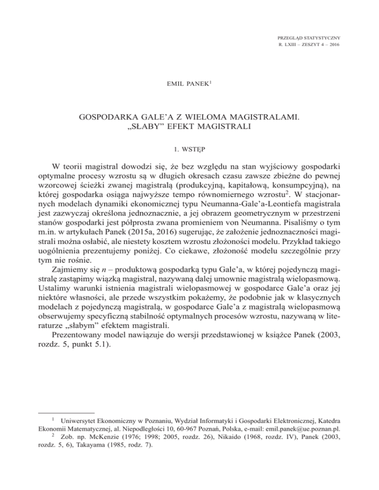 PRZEGLĄD STATYSTYCZNY R. LXIII – ZESZYT 4 – 2016 EMIL PANEK1 GOSPODARKA GALE’A Z WIELOMA MAGISTRALAMI. „SŁABY” EFEKT MAGISTRALI 1. WSTĘP W teorii magistral dowodzi się, że bez względu na stan wyjściowy gospodarki optymalne procesy wzrostu są w długich okresach czasu zawsze zbieżne do pewnej wzorcowej ścieżki zwanej magistralą (produkcyjną, kapitałową, konsumpcyjną), na której gospodarka osiąga najwyższe tempo równomiernego wzrostu2. W stacjonarnych modelach dynamiki ekonomicznej typu Neumanna-Gale’a-Leontiefa magistrala jest zazwyczaj określona jednoznacznie, a jej obrazem geometrycznym w przestrzeni stanów gospodarki jest półprosta zwana promieniem von Neumanna. Pisaliśmy o tym m.in. w artykułach Panek (2015a, 2016) sugerując, że założenie jednoznaczności magistrali można osłabić, ale niestety kosztem wzrostu złożoności modelu. Przykład takiego uogólnienia prezentujemy poniżej. Co ciekawe, złożoność modelu szczególnie przy tym nie rośnie. Zajmiemy się n – produktową gospodarką typu Gale’a, w której pojedynczą magistralę zastąpimy wiązką magistral, nazywaną dalej umownie magistralą wielopasmową. Ustalimy warunki istnienia magistrali wielopasmowej w gospodarce Gale’a oraz jej niektóre własności, ale przede wszystkim pokażemy, że podobnie jak w klasycznych modelach z pojedynczą magistralą, w gospodarce Gale’a z magistralą wielopasmową obserwujemy specyficzną stabilność optymalnych procesów wzrostu, nazywaną w literaturze „słabym” efektem magistrali. Prezentowany model nawiązuje do wersji przedstawionej w książce Panek (2003, rozdz. 5, punkt 5.1). 1 Uniwersytet Ekonomiczny w Poznaniu, Wydział Informatyki i Gospodarki Elektronicznej, Katedra Ekonomii Matematycznej, al. Niepodległości 10, 60-967 Poznań, Polska, e-mail: [email protected]. 2 Zob. np. McKenzie (1976; 1998; 2005, rozdz. 26), Nikaido (1968, rozdz. IV), Panek (2003, rozdz. 5, 6), Takayama (1985, rodz. 7). 356 Emil Panek 2. PRZESTRZEŃ PRODKCYJNA GALE’A. DEFINICJA, WYBRANE WŁASNOŚCI Standardowa n – produktowa przestrzeń produkcyjna Gale’a Z (inaczej: zbiór technologiczny) jest stożkiem wypukłym zawartym w ܴାଶ , z wierzchołkiem w 0. Jego elementami są 2n-wymiarowe wektory ሺݔǡ ݕሻ ሺݔଵ ǡ ǥ ǡ ݔ ǡ ݕଵ ǡ ǥ ǡ ݕ ሻ Ͳ ؤ3, o których mówimy, że opisują dopuszczalne procesy produkcji w gospodarce Gale’a; x – nazywamy wektorem zużycia (nakładów), y – wektorem produkcji (wyników). Zapis ሺݔǡ ݕሻ ܼ אoznacza, że w gospodarce, której technologię opisuje przestrzeń produkcyjna Z, z wektora nakładów x możliwe jest wytworzenie wektora produkcji y. Procesy produkcji podporządkowane są następującym regułom: (G1) ሺݔǡ ݕሻ ߣܼ א Ͳሺߣሺݔǡ ݕሻ ܼ אሻ (warunek proporcjonalności nakładów i wyników), (G2) ൫ ݔ ǡ ݕ ൯ ܼ אǡ ݅ ൌ ͳǡʹ൫ሺ ݔଵ ݔଶ ǡ ݕଵ ݕଶ ሻ ܼ א൯ (warunek addytywności procesów produkcyjnych), (G3) ሺݔǡ ݕሻ ܼ אሺ ݔൌ Ͳ ฺ ݕൌ Ͳሻ (warunek „braku rogu obfitości”), (G4) ሺݔǡ ݕሻ ܼ אሺ ݔᇱ ฺ ݔ ؤሺ ݔᇱ ǡ ݕሻ ܼ אሻ (możliwość marnotrawstwa nakładów), (G5) ሺݔǡ ݕሻ ܼ אሺ ݕᇱ ฺ ݕ أሺݔǡ ݕᇱ ሻ ܼ אሻ (możliwość marnotrawstwa mocy produkcyjnych), (G6) ൫ ݔ ǡ ݕ ൯ ܼ אǡ ݅ ൌ ͳǡʹǡ ǥ ൬൫ ݔ ǡ ݕ ൯ ՜ ሺݔҧ ǡ ݕതሻ ฺ ሺݔҧ ǡ ݕതሻ ܼ א൰ (domkniętość przestrzeni produkcyjnych). Zauważmy, że jeżeli ሺݔǡ ݕሻ ܼ אoraz ሺݔǡ ݕሻ ് Ͳ, to Ͳ ് ݔ. Dalej interesują nas nietrywialne (niezerowe) procesy ሺݔǡ ݕሻ ך ܼ אሼͲሽ . Liczbę ߙሺݔǡ ݕሻ ൌ ሼߙȁߙݕ أ ݔሽ 3 Jeżeli a, b ∈ Rn, to zapis a ≧ b oznacza, że dla każdego i zachodzi: ai ≥ bi. Pisząc a ≥ b rozumiemy, że a ≧ b oraz a ≠ b. Gospodarka Gale’a z wieloma magistralami. „Słaby” efekt magistrali 357 nazywamy wskaźnikiem technologicznej efektywności procesu ሺݔǡ ݕሻ ך ܼ אሼͲሽ . Funkcja α jest ciągła i dodatnio jednorodna stopnia 0 na ܼ ךሼͲሽ . Stąd i z twierdzenia Weierstrassa o istnieniu maksimum funkcji ciągłej na zbiorze zwartym otrzymujemy wniosek, że istnieje rozwiązanie ሺݔҧ ǡ ݕതሻ ך ܼ אሼͲሽ zadania PD[ D [ \ [ \ = ?^` PD[ D [ \ D [ \ ൌ ߙெ , [ \ : gdzie ȳሺͳሻ ൌ ሼሺݔǡ ݕሻ ܼ אȁԡሺݔǡ ݕሻԡ ൌ ͳሽ (tutaj i dalej D ¦D L (1) ).4 Wobec dodatniej L jednorodności stopnia 0 funkcji α rozwiązanie to jest określone z dokładnością do mnożenia przez dowolną stałą dodatnią (z dokładnością do struktury): jeżeli ߙሺݔҧ Ǥ ݕതሻ ൌ PD[ D [ \ ൌ ߙெ , [ \ = ?^` to także ߣ Ͳ ߙሺߣݔҧ Ǥ ߣݕതሻ ൌ PD[ D [ \ ൌ ߙெ . [ \ = ?^` (2) Proces ሺݔҧ ǡ ݕതሻ będący rozwiązaniem zadania (1) nazywamy optymalnym procesem produkcji w gospodarce Gale’a. Liczbę αM nazywamy optymalnym wskaźnikiem technologicznej efektywności produkcji. Oznaczmy przez ܼ௧ ך ܼ ؿሼͲሽ zbiór wszystkich optymalnych procesów produkcji: ܼ௧ ൌ ሼሺݔҧ ǡ ݕതሻ ך ܼ אሼͲሽȁȽሺݔҧ ǡ ݕതሻ ൌ ߙெ ሽ. O jego kształcie mówi poniższe twierdzenie. □ Twierdzenie 1. Przy założeniach (G1) – (G6) zbiór Zopt jest stożkiem wypukłym nie zawierającym 0. Dowód. Weźmy dowolną parę optymalnych procesów ൫ݔҧ ǡ ݕത ൯ ܼ א௧ , i = 1, 2, oraz takie liczby ߣଵ ǡ ߣଶ Ͳ, że ߣଵ ߣଶ Ͳ . Niech ሺݔҧ ǡ ݕതሻ ൌ ߣଵ ሺݔҧ ଵ ǡ ݕതଵ ሻ ߣଶ ሺݔҧ ଶ ǡ ݕത ଶ ሻ . Wówczas ሺݔҧ ǡ ݕതሻ ך ܼ אሼͲሽ, czyli ߙሺݔҧ Ǥ ݕതሻ ߙெ . 4 (3) Zob. np. Panek (2003, tw. 5.2). Zbiór ȳሺͳሻ jest zwarty. W twierdzeniu 5.2 zamiast niego mamy (też zwarty) zbiór ܳ ൌ ሼሺݔǡ ݕሻ ܼ אȁԡሺݔǡ ݕሻԡ ൌ ͳሽ). 358 Emil Panek Z założenia ߙሺݔҧ ଵ ǡ ݕതଵ ሻ ൌ ߙሺݔҧ ଶ ǡ ݕത ଶ ሻ ൌ ߙெ , więc ߙெ ݔҧ ଵ ݕ أത ଵ