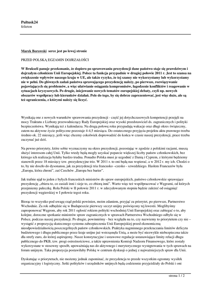 Pultusk24 felieton Marek Borowski serce jest po lewej stronie PRZED POLSKĄ EGZAMIN DOJRZAŁOŚCI W Brukseli panuje przekonanie, że dopiero po sprawowaniu prezydencji dane państwo staje się prawdziwym i dojrzałym członkiem Unii Europejskiej. Polsce ta funkcja przypadnie w drugiej połowie 2011 r. Jest to szansa na zwiększenie wpływów naszego kraju w UE, ale także ryzyko, że tej szansy nie wykorzystamy lub wykorzystamy nie w pełni. Do głównych zadań państwa sprawującego prezydencję należy, po pierwsze, rozwiązywanie pojawiających się problemów, a więc ułatwianie osiągania kompromisów, łagodzenie konfliktów i reagowanie w sytuacjach kryzysowych. Po drugie, inicjowanie nowych tematów europejskiej debaty, czyli np. nowych obszarów współpracy lub kierunków działań. Pole do tego, by się dobrze zaprezentować, jest więc duże, ale są też ograniczenia, z którymi należy się liczyć. Wynikają one z nowych warunków sprawowania prezydencji - część jej dotychczasowych kompetencji przejęli na mocy Traktatu z Lizbony przewodniczący Rady Europejskiej oraz wysoki przedstawiciel ds. zagranicznych i polityki bezpieczeństwa. Wynikają też z kalendarza. Na drugą połowę roku przypadają wakacje oraz długi okres świąteczny, zatem na aktywne życie polityczne pozostaje 4-4,5 miesiąca. Do ostatecznego przyjęcia projektu aktu prawnego trzeba średnio ok. 22 miesięcy, jeśli więc chcemy cokolwiek doprowadzić do końca w czasie naszej prezydencji, prace trzeba zaczynać już dziś. Na pewno priorytety, które sobie wyznaczymy na okres prezydencji, pozostając w zgodzie z polskimi racjami, muszą służyć interesom całej Unii. Tylko wtedy będą mogły uzyskać poparcie większej liczby państw członkowskich, bez którego ich realizacja byłaby bardzo trudna. Ponadto Polska musi je uzgodnić z Danią i Cyprem, z którymi będziemy stanowili przez 18 miesięcy tzw. prezydencyjne trio. W 2011 r. to oni będą nas wspierać, a w 2012 r. my ich. Chodzi o to, by nie doszło do dysonansu, jak za prezydencji tria francusko –czesko - szwedzkiego. Hasłem Francuzów była „Europa, która chroni”, zaś Czechów „Europa bez barier”. Jak trafnie ujął to jeden z byłych francuskich ministrów do spraw europejskich, państwo członkowskie sprawujące prezydencję „zbiera to, co zasiali inni i sieje to, co zbiorą inni”. Warto więc też współpracować z Węgrami, od których przejmiemy pałeczkę. Rola Polski w II połowie 2011 r. w zdecydowanym stopniu będzie zależeć od osiągnięć prezydencji węgierskiej w I połowie tegoż roku. Biorąc to wszystko pod uwagę rząd polski powinien, moim zdaniem, przyjąć za priorytet, po pierwsze, Partnerstwo Wschodnie. Za rok odbędzie się w Budapeszcie pierwszy szczyt unijny poświęcony tej kwestii. Moglibyśmy zaproponować Węgrom, aby rok 2011 ogłosić rokiem polityki wschodniej Unii Europejskiej oraz zabiegać o to, aby kolejne, doroczne spotkanie ministrów spraw zagranicznych w sprawach Partnerstwa Wschodniego odbyło się w Polsce, podczas naszej prezydencji. Po drugie, powinniśmy - bez względu na to, czy nazwiemy to priorytetem czy nie – wystąpić z propozycją skutecznego systemu zabezpieczenia Unii Europejskiej przed ekonomiczną nieodpowiedzialnością poszczególnych państw członkowskich. Praktyka nagminnego przekraczania limitów deficytu budżetowego i długu publicznego przez kraje unijne już wstrząsnęła Unią, a może być niezwykle niebezpieczna także dla strefy euro, do której aspirujemy. Nasze konstytucyjne i ustawowe regulacje ustanawiające limity relacji długu publicznego do PKB, tzw. progi ostrożnościowe, a także uprawnienia Komisji Nadzoru Finansowego, które zostały wykorzystane w stosowny sposób, upoważniają nas do aktywnego i merytorycznego występowania w tych sprawach na forum unijnym. Taka propozycja postawiłaby Polskę w centrum dyskusji o jednej z najważniejszych spraw dla Unii. Dyskutując o priorytetach, nie możemy jednak zapominać, że prezydencja to przede wszystkim ogromny wysiłek organizacyjny i logistyczny. Setki polityków i urzędników unijnych będą codziennie przyjeżdżały do Polski i oni strona 1 / 2 Pultusk24 felieton ocenią nie tyle nasze priorytety, ile naszą sprawność organizacyjną, logistyczną i nasze umiejętności negocjacyjne, bo to będzie do nas należało. Tym samym od nich też będzie w dużym stopniu zależeć to, jak wypadniemy na tym swoistym egzaminie dojrzałości. strona 2 / 2