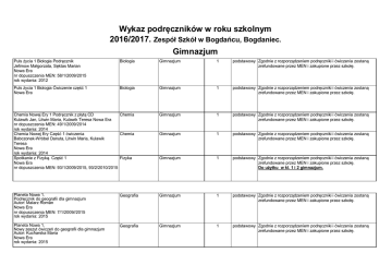 Wykaz podręczników w roku szkolnym 2016/2017. Zespół Szkół w Bogdańcu, Bogdaniec. Gimnazjum Puls życia 1 Biologia Podręcznik Jefimow Małgorzata, Sęktas Marian Nowa Era nr dopuszczenia MEN: 58/1/2009/2015 rok wydania: 2012 Biologia Gimnazjum 1 podstawowy Zgodnie z rozporządzeniem podręczniki i ćwiczenia zostaną zrefundowane przez MEN i zakupione przez szkołę. Puls życia 1 Biologia Ćwiczenie część 1 Nowa Era Biologia Gimnazjum 1 podstawowy Zgodnie z rozporządzeniem podręczniki i ćwiczenia zostaną zrefundowane przez MEN i zakupione przez szkołę. Chemia Nowej Ery 1 Podręcznik z płytą CD Chemia Kulawik Jan, Litwin Maria, Kulawik Teresa Nowa Era nr dopuszczenia MEN: 49/1/2009/2014 rok wydania: 2014 Chemia Nowej Ery Część 1 ćwiczenia Chemia Babczonek-Wróbel Danuta, Litwin Maria, Kulawik Teresa Nowa Era rok wydania: 2014 Spotkanie z Fizyką. Część 1 Fizyka Nowa Era nr dopuszczenia MEN: 93/1/2009/2015, 93/2/2010/2015 Gimnazjum 1 podstawowy Zgodnie z rozporządzeniem podręczniki i ćwiczenia zostaną zrefundowane przez MEN i zakupione przez szkołę. Gimnazjum 1 podstawowy Zgodnie z rozporządzeniem podręczniki i ćwiczenia zostaną zrefundowane przez MEN i zakupione przez szkołę. Gimnazjum 1 podstawowy Zgodnie z rozporządzeniem podręczniki i ćwiczenia zostaną zrefundowane przez MEN i zakupione przez szkołę. Do użytku w kl. 1 i 2 gimnazjum. Planeta Nowa 1. Podręcznik do geografii dla gimnazjum Autor: Malarz Roman Nowa Era nr dopuszczenia MEN: 7/1/2009//2015 rok wydania: 2015 Geografia Gimnazjum 1 podstawowy Zgodnie z rozporządzeniem podręczniki i ćwiczenia zostaną zrefundowane przez MEN i zakupione przez szkołę. Planeta Nowa 1. Nowy zeszyt ćwiczeń do geografii dla gimnazjum Autor: Kucharska Maria Nowa Era rok wydania: 2015 Geografia Gimnazjum 1 podstawowy Zgodnie z rozporządzeniem podręczniki i ćwiczenia zostaną zrefundowane przez MEN i zakupione przez szkołę. Atlas geograficzny Polska kontynenty świat Nowy kl. 1-3 Geografia Nowa Era rok wydania: 2014 Gimnazjum 1 podstawowy Zgodnie z rozporządzeniem podręczniki i ćwiczenia zostaną zrefundowane przez MEN i zakupione przez szkołę. Śladami przeszłości 1 Historia Podręcznik Nowa Era nr dopuszczenia MEN: 60/1/2011/z1 rok wydania: Historia Gimnazjum 1 podstawowy Rodzice uczniów klasy I szkoły podstawowej zobowiązani są do zakupu podręcznika tylko z przedmiotu religia. Pozostałe wraz z materiałami ćwiczeniowymi zostaną zrefundowane przez MEN i zakupione przez szkołę Śladami przeszłości 1 Historia Zeszyt ćwiczeń Nowa Era rok wydania: Historia Gimnazjum 1 podstawowy Zgodnie z rozporządzeniem podręczniki i ćwiczenia zostaną zrefundowane przez MEN i zakupione przez szkołę. New English Plus 1 Autor: Ben Wetz, Diana Pye, Jenny Quintana Oxford University Press nr dopuszczenia MEN: 732/1/2015 Język angielski Gimnazjum 1 podstawowy Zgodnie z rozporządzeniem podręczniki zostaną zrefundowane przez MEN i zakupione przez szkołę.. Dotyczy klasy 1C (uczniowie ze szkoły podstawowej Lubczyno, Jeniniec) New English Plus 2 Oxford University Press Autor: Ben Wetz, Diana Pye, Jenny Quintana nr dopuszczenia MEN: 732/2/2015 Język angielski Gimnazjum 1 podstawowy Zgodnie z rozporządzeniem podręczniki zostaną zrefundowane przez MEN i zakupione przez szkołę. Dotyczy klasy 1 A i 1 B (uczniowie ze szkoły podstawowej Bogdaniec, Jenin) Opisać Świat nr dopuszczenia MEN: 757/1/2015 Nowa Era Rok wydania 2015 Język polski Gimnazjum 1 podstawowy Zgodnie z rozporządzeniem podręczniki i ćwiczenia zostaną zrefundowane przez MEN i zakupione przez szkołę. Matematyka z plusem 1 Podręcznik GWO nr dopuszczenia MEN: 168/1/2015/z1 rok wydania: 2015 Matematyka Gimnazjum 1 podstawowy Zgodnie z rozporządzeniem podręczniki i ćwiczenia zostaną zrefundowane przez MEN i zakupione przez szkołę. Matematyka 1 ćwiczenia podstawowe GWO Rok wydania 2015 Matematyka Gimnazjum 1 podstawowy Zgodnie z rozporządzeniem podręczniki i ćwiczenia zostaną zrefundowane przez MEN i zakupione przez szkołę. Muzyka Gimnazjum 1 podstawowy Zgodnie z rozporządzeniem podręczniki i ćwiczenia zostaną zrefundowane przez MEN i zakupione przez szkołę. Sztuka Tworzenia nr dopuszczenia MEN: 725/2014 Nowa Era rok wydania: 2014 Plastyka Gimnazjum 1 podstawowy Zgodnie z rozporządzeniem podręczniki i ćwiczenia zostaną zrefundowane przez MEN i zakupione przez szkołę. Bez Podręcznika Religia Gimnazjum 1 Bez Podręcznika Informatyka Gimnazjum 1 Zajęcia mechaniczno-motoryzacyjne Nowa Era Rok wydania:2015 Zajęcia techniczne Gimnazjum 1 podstawowy Zgodnie z rozporządzeniem podręczniki i ćwiczenia zostaną zrefundowane przez MEN i zakupione przez szkołę. Magnet 2 podręcznik Motta Giorgio LektorKlett nr dopuszczenia w trakcie procedury rok wydania: 2015 Język niemiecki Gimnazjum 1 podstawowy Zgodnie z rozporządzeniem podręczniki i ćwiczenia zostaną zrefundowane przez MEN i zakupione przez szkołę. Magnet 2 ćwiczenia Motta Giorgio Lektorklett rok wydania: 2015 Język niemiecki Gimnazjum 1 podstawowy Zgodnie z rozporządzeniem podręczniki i ćwiczenia zostaną zrefundowane przez MEN i zakupione przez szkołę. Puls życia 2 Biologia Podręcznik z płytą CD Jefimow Małgorzata Nowa Era nr dopuszczenia MEN: 58/2/2009 rok wydania: 2012 Biologia Gimnazjum 2 podstawowy Zgodnie z rozporządzeniem podręczniki i ćwiczenia zostaną zrefundowane przez MEN i zakupione przez szkołę. Gra muzyka Podręcznik Oleszkowicz Jan Nowa Era nr dopuszczenia MEN: 20/2009/2015 rok wydania: 2015 Puls życia 2 Biologia- ćwiczenia Część 2 Nowa Era Zgodnie z rozporządzeniem podręczniki i ćwiczenia podstawowy zostaną zrefundowane przez MEN i zakupione przez szkołę. Biologia Gimnazjum 2 Chemia Nowej Ery 2 Podręcznik Kulawik Jan, Litwin Maria, Kulawik Teresa Nowa Era nr dopuszczenia MEN: 49/2/2009 rok wydania: 2010 Chemia Gimnazjum 2 podstawowy Zgodnie z rozporządzeniem podręczniki i ćwiczenia zostaną zr