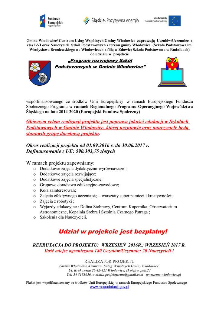 Gmina Włodowice/ Centrum Usług Wspólnych Gminy Włodowice zapraszają Uczniów/Uczennice z klas I-VI oraz Nauczycieli Szkół Podstawowych z terenu gminy Włodowice (Szkoła Podstawowa im. Władysława Broniewskiego we Włodowicach z filią w Zdowie; Szkoła Podstawowa w Rudnikach) do udziału w projekcie „Program rozwojowy Szkół Podstawowych w Gminie Włodowice” współfinansowanego ze środków Unii Europejskiej w ramach Europejskiego Funduszu Społecznego Programu w ramach Regionalnego Programu Operacyjnego Województwa Śląskiego na lata 2014-2020 (Europejski Fundusz Społeczny) Głównym celem realizacji projektu jest poprawa jakości edukacji w Szkołach Podstawowych w Gminie Włodowice, której uczniowie oraz nauczyciele będą stanowili grupę docelową projektu. Okres realizacji projektu od 01.09.2016 r. do 30.06.2017 r. Dofinansowanie z UE: 590.303,75 złotych W ramach projektu zapewniamy: Dodatkowe zajęcia dydaktyczno-wyrównawcze ; Dodatkowe zajęcia rozwijające; Dodatkowe zajęcia specjalistyczne: Grupowe doradztwo edukacyjno-zawodowe; Koła zainteresowań; Zajęcia efektywnego uczenia się – warsztaty super pamięci i kreatywności; Zajęcia z robotyki ; Wyjazdy edukacyjne : Dolina Stobrawy, Centrum Kopernika, Obserwatorium Astronomiczne, Kopalnia Srebra i Sztolnia Czarnego Pstrąga ; o Szkolenia dla Nauczycieli. o o o o o o o o Udział w projekcie jest bezpłatny! REKRUTACJA DO PROJEKTU: WRZESIEŃ 2016R.; WRZESIEŃ 2017 R. Ilość miejsc ograniczona 180 Uczniów/Uczennic; 20 Nauczycieli ! REALIZATOR PROJEKTU Gmina Włodowice /Centrum Usług Wspólnych Gminy Włodowice Ul. Krakowska 26 42-421 Włodowice, II piętro, pok.24 Tel: 34 3153056, e-mail.: [email protected] www.cuw-wlodowice.pl Plakat jest współfinansowany ze środków Unii Europejskiej w ramach Europejskiego Funduszu Społecznego www.mapadotacji.gov.pl