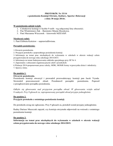 PROTOKÓŁ Nr 33/14 z posiedzenia Komisji Oświaty, Kultury, Sportu i Rekreacji z dnia 30 maja 2014r. W posiedzeniu udział wzięli: 1. Członkowie komisji w liczbie 9 osób - wg załączonej listy obecności. 2. Pan Włodzimierz Żak – Burmistrz Miasta Myszkowa. 3. Pani Marzanna Wieczorek – kierownik MZEASiP. Nieobecni radni: 1. Pani Elżbieta Kościow – usprawiedliwiona. Porządek posiedzenia: 1.Otwarcie posiedzenia. 2. Przyjęcie protokołu z poprzedniego posiedzenia komisji. 3. Informacja na temat prac niezbędnych do wykonania w szkołach w okresie wakacji celem przygotowania do nowego roku szkolnego 2014/2015. 4. Informacja na temat funkcjonowania oddziału specjalnego przy SP Nr 4. 5. Zapoznanie z arkuszami organizacyjnymi szkół i przedszkoli. 6.Wakacje 2014-proponowane przez szkoły, MDK, MOSiR formy wypoczynku dzieci i młodzieży. 7. Sprawy różne. Do punktu 1. Otwarcie posiedzenia. Posiedzenie komisji otworzył i prowadził przewodniczący komisji pan Jacek Trynda. Stwierdził prawomocność obrad. Przedstawił porządek posiedzenia. Poprosił o przegłosowanie porządku posiedzenia. Odbyło się głosowanie nad przyjęciem porządku obrad. W głosowaniu wzięło udział 9 radnych. Przy 9 głosach za, zaproponowany porządek obrad przyjęto jednogłośnie. Do punktu 2. Przyjęcie protokołu z ostatniego posiedzenia komisji. Do protokołu uwag nie zgłoszono. Przy 9 głosach za, protokół został przyjęty jednogłośnie. Radny Dariusz Muszczak zapytał, czy komisja otrzymała odpowiedź na wniosek z ostatniego posiedzenia komisji. Do punktu 3. Informacja na temat prac niezbędnych do wykonania w szkołach w okresie wakacji celem przygotowania do nowego roku szkolnego 2014/2015. 1 Przewodniczący komisji pan Jacek Trynda powiedział, że informacja była do dyspozycji każdego z radnych. Materiał stanowi załącznik do protokołu. Czy Państwo macie jakieś uwagi. Poprosił panią Marzannę Wieczorek o przybliżenie informacji. Pani Marzanna Wieczorek powiedziała, że ten rok, do czego nawiąże przy arkuszach organizacyjnych jest rokiem, kiedy od września zacznie funkcjonować nowa reforma systemu szkolnictwa polegająca na tym, że dzieci 6-letnie pójdź do szkoły. Zasadniczo we wszystkich szkołach remonty były ukierunkowane na przygotowanie szkół, ich zasobów w szkołach, pod kątem przyjęcia dzieci 6 - letnich i rozszerzenia się w związku z tym klas I. W zasadzie do grudnia ubiegłego roku te zasadnicze remonty związane z przyjściem dzieci 6 - letnich do szkół. Były w szkołach przeprowadzone, generalnie są zrealizowane, w tym roku pozostaje ta część związana z zakupem doposażenia do klas pierwszych, gdzie pójdą szczególnie te dzieci małe. Remonty toalet związane z odnowieniem sal, zostały przeprowadzone, tym niemniej na ten rok została, tak jak w ZSP nr 3, gdzie klas pierwszych powstanie więcej niż zakładano. Początkowo. Pozostałe remonty wynikają z rocznych przeglądów budynków szkolnych i przedszkolnych z nakazów Sanepidu i takie przez dyrektorów na tym poziomie są planowane. Szczegółowy wykaz znajduje się w przedłożonej informacji. Przewodniczący komisji pan Jacek Trynda zapytał, czy radni mają jakieś pytania? Radna Mariola Tabaka zapytała, czy w każdej szkole dopięte jest wszystko na ostatni guzik, jeżeli chodzi o przyjęcie 6-latków? Pani Marzanna Wieczorek powiedziała, że całkowicie wszystko będzie dopięte w sierpniu, ale generalnie tak. Radna Mariola Tabaka zapytała, w której szkole będzie najwięcej 6-latków? Pani Marzanna Wieczorek powiedziała, że te dane są w arkuszach organizacyjnych. Najwięcej dzieci będzie w SP nr 5 – 34, SP nr 1 – 28, to się tak rozkłada mniej więcej. Radna Mariola Tabaka zapytał, czy jak jest 34 dzieci, to jest jedna klasa? Pani Marzanna Wieczorek powiedziała, że to są dwie klasy. Przewodniczący komisji pan Jacek trynda powiedział, że ten temat będzie jeszcze poruszany przy arkuszach organizacyjnych. Relacja z tego, jak zostało to wykonane będzie zdana we wrześniu, październiku. Pani Marzanna Wieczorek odpowiedziała, że jak zwykle w sierpniu uszczegółowimy. Do punktu 4. Informacja na temat funkcjonowania oddziału specjalnego przy SP Nr 4. Przewodniczący komisji pan Jacek Trynda zapytał, czy ta informacja formalnie musiała do nas wpłynąć? 2 Pani Marzanna Wieczorek powiedziała, że ta informacja musiała wpłynąć, bo radni złożyli taki wniosek. Przewodniczący komisji pan Jacek Trynda zapytał, czy ta informacja, ocena funkcjonowania jest sprawą wewnętrzną o tyle, że wypowiadali się w tej kwestii głównie rodzice. Pani Marzanna Wieczorek powiedziała, że kiedyś na komisji padł wniosek, żeby radni pojechali na jedno posiedzenie zobaczyć oddział specjalny przy SP Nr 4. Takie były plany, żeby zobaczyć. Przewodniczący komisji pan Jacek Trynda powiedział, że radni na pewno tam będą we wrześniu, natomiast jeśli chodzi o funkcjonowanie, czy będzie ocena zewnętrzna funkcjonowania tego? Pani Marzanna Wieczorek wyjaśniła, że to jest normalny oddział szkolny. Jego ocena zewnętrzna odbywa się poprzez wizytacje kuratoryjne w normalnym trybie. W planie prac Kuratorium jak będzie kolejna czwórka na wizytację w tej szkole, wtedy w ramach struktury szkoły odbywa się ocena pracy każdej szkoły w całości. To nie jest wyodrębniony twór, to jest część składowa szkoły nr 4. To nie podlega innym specjalnym procedurom, niż szkoła. Przewodniczący komisji pan Jacek Trynda zapytał, czy radni mają jakieś pytania? Rodzice bardzo dobrze wypowiadają się na temat funkcjonowania placówki. Myślę, że będzie tak dalej, że dzieci i ich rodzice będą z tego faktu zadowolone. Pani Marzanna Wieczorek powiedziała, że po dwóch, trzech latach wizytacja kuratoryjna to jest to za krótki okres, żeby zrobić merytoryczną kontrolę. Na razie może to być ocena taka z punktu widzenia rodziców. Radna Mariola Taba