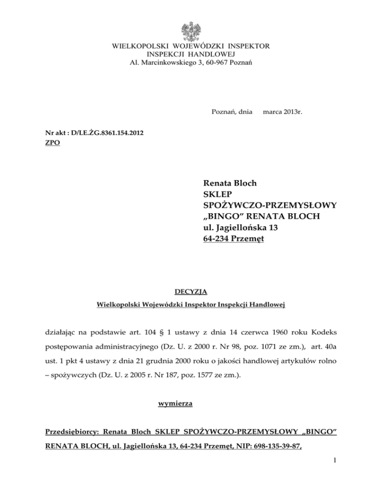 WIELKOPOLSKI WOJEWÓDZKI INSPEKTOR INSPEKCJI HANDLOWEJ Al. Marcinkowskiego 3, 60-967 Poznań Poznań, dnia marca 2013r. Nr akt : D/LE.ŻG.8361.154.2012 ZPO Renata Bloch SKLEP SPOŻYWCZO-PRZEMYSŁOWY „BINGO” RENATA BLOCH ul. Jagiellońska 13 64-234 Przemęt DECYZJA Wielkopolski Wojewódzki Inspektor Inspekcji Handlowej działając na podstawie art. 104 § 1 ustawy z dnia 14 czerwca 1960 roku Kodeks postępowania administracyjnego (Dz. U. z 2000 r. Nr 98, poz. 1071 ze zm.), art. 40a ust. 1 pkt 4 ustawy z dnia 21 grudnia 2000 roku o jakości handlowej artykułów rolno – spożywczych (Dz. U. z 2005 r. Nr 187, poz. 1577 ze zm.). wymierza Przedsiębiorcy: Renata Bloch SKLEP SPOŻYWCZO-PRZEMYSŁOWY „BINGO” RENATA BLOCH, ul. Jagiellońska 13, 64-234 Przemęt, NIP: 698-135-39-87, 1 karę pieniężną w wysokości 700,00 zł. (słownie: siedemset złotych), wynikającą z art. 40a ust. 1 pkt 4 ustawy z dnia 21 grudnia 2000 r. o jakości handlowej artykułów rolno- spożywczych (Dz. U. z 2005 r. Nr 187, poz. 1577 ze zm.), z tytułu wprowadzenia do obrotu handlowego w dniu kontroli tj. w dniu 7 sierpnia 2012 roku w sklepie w Przemęcie, ul. Jagiellońska 13, 64-234 Przemęt, przedsiębiorca: Renata Bloch SKLEP SPOŻYWCZO-PRZEMYSŁOWY „BINGO” RENATA BLOCH, ul. Jagiellońska 13, 64-234 Przemęt, artykułów rolnospożywczych nieodpowiadających jakości handlowej określonej w przepisach o jakości handlowej to jest: partia 10kg filetów z mintaja b/skóry mrożonego glazurowanego, w cenie 9,99zł/kg, importer: P. W. WALDI Sp. z o.o., Sp. k., ul. Krasickiego 15, 64-000 Kościan, z uwagi na: brak informacji dotyczącej ilościowej zawartości glazury, bądź ryby co stanowi naruszenie §17 ust. 1 pkt 3 rozporządzenia Ministra Rolnictwa i Rozwoju Wsi z dnia 10 lipca 2007 roku w sprawie znakowania środków spożywczych (Dz. U. Nr 137, poz. 966), partia 1kg, kiełbasy grillowej chrzanowej, w cenie 12,99zł/kg, producent: JOHN Zakład Mięsny, ul. Źródlana 5, Grotniki, 64-140 Włoszakowice, z uwagi na: brak w miejscu sprzedaży informacji dotyczącej wykazu składników co stanowi naruszenie §17 ust. 1 pkt 2 rozporządzenia Ministra Rolnictwa i Rozwoju Wsi z dnia 10 lipca 2007 roku w sprawie znakowania środków spożywczych (Dz. U. Nr 137, poz. 966), brak informacji o zawartości składników mięsnych co stanowi 2 naruszenie art. 7 ust. 2 ustawy z 21 grudnia 2000 roku o jakości handlowej artykułów rolno- spożywczych, partia 1 kg „Sokoliki”, parówek w cenie drobiowo-cielęcych 14,99zł/kg, wędzonych, producent parzonych SOKOŁÓW S.A., Al. 550-lecia 1, 08-300 Sokołów Podlaski, z uwagi na: brak w miejscu sprzedaży nazwy wyrobu, a także brak informacji dotyczącej wykazu składników co stanowi naruszenie §17 ust 1 pkt 2 rozporządzenia Ministra Rolnictwa i Rozwoju Wsi z dnia 10 lipca 2007 roku w sprawie znakowania środków spożywczych (Dz. U. Nr 137, poz. 966), partia 2 op. wyrobu blokowego, wysokowydajnego „Obkładu wiejskiego”, w cenie 8,31zł/op., producent: JOHN Zakład Mięsny, ul. Źródlana 5, Grotniki, 64-140 Włoszakowice, z uwagi na: brak określenia masy netto produktu, a także brak określenia procentowej zawartości składnika mięsnego co stanowi naruszenie §2 ust. 1 pkt 6 oraz §9 ust. 1 pkt 3 rozporządzenia Ministra Rolnictwa i Rozwoju Wsi z dnia 10 lipca 2007 roku w sprawie znakowania środków spożywczych (Dz. U. Nr 137, poz. 966). Kontrolowany wprowadził zatem do obrotu artykuły rolno-spożywcze nieodpowiadające jakości handlowej określonej w przepisach o jakości handlowej co skutkuje zastosowaniem art. 40a ust. 1 pkt 3 ustawy o jakości handlowej artykułów rolno-spożywczych (Dz. U. z 2005, Nr 187 poz. 1577 ze zm.). „Kto wprowadza do obrotu artykuły rolno-spożywcze nieodpowiadające jakości handlowej określonej w przepisach o jakości handlowej lub deklarowanej przez producenta w oznakowaniu tych artykułów, podlega karze pieniężnej w wysokości do pięciokrotnej wartości korzyści majątkowej uzyskanej lub która mogłaby zostać 3 uzyskana przez wprowadzenie tych artykułów rolno- spożywczych do obrotu, nie niższej jednak niż 500 zł.”. Uzasadnienie Podczas kontroli przeprowadzonej przez Wojewódzki Inspektorat Inspekcji Handlowej w Poznaniu Delegaturę w Lesznie, w dniach od 31 lipca do 7 sierpnia 2012 roku w sklepie w Przemęcie, ul. Jagiellońska 13, 64-234 Przemęt, przedsiębiorca: Renata Bloch SKLEP SPOŻYWCZO-PRZEMYSŁOWY „BINGO” RENATA BLOCH, ul. Jagiellońska 13, 64-234 Przemęt, stwierdzono nieprawidłowe oznakowanie 3 partii towarów luzem oraz 1 partii towarów w opakowaniach jednostkowych to jest: partia 10kg filetów z mintaja b/skóry mrożonego glazurowanego, w cenie 9,99zł/kg, importer: P. W. WALDI Sp. z o.o., Sp. k., ul. Krasickiego 15, 64-000 Kościan, z uwagi na: brak informacji dotyczącej ilościowej zawartości glazury, bądź ryby co stanowi naruszenie §17 ust. 1 pkt 3 rozporządzenia Ministra Rolnictwa i Rozwoju Wsi z dnia 10 lipca 2007 roku w sprawie znakowania środków spożywczych (Dz. U. Nr 137, poz. 966), partia 1kg, kiełbasy grillowej chrzanowej, w cenie 12,99zł/kg, producent: JOHN Zakład Mięsny, ul. Źródlana 5, Grotniki, 64-140 Włoszakowice, z uwagi na: brak w miejscu sprzedaży informacji dotyczącej wykazu składników co stanowi naruszenie §17 ust. 1 pkt 2 rozporządzenia Ministra Rolnictwa i Rozwoju Wsi z dnia 10 lipca 2007 roku w sprawie znakowania środków spożywczych (Dz. U. Nr 4 137, poz. 966), brak informacji o zawartości składników mięsnych co stanowi naruszenie art. 7 ust. 2 ustawy z 21 grudnia 2000 roku o jakości handlowej artykułów rolno- spożywczych, partia 1 kg „Sokoliki”, parówek w drobiowo-cielęcych cenie 14,99zł/kg, wędzonych, producent parzonych SOKOŁÓW S.A., Al. 550- lecia 1, 08-300 Sokołów Podlaski, z uwagi na: brak w miejscu sprzedaży nazwy wyrobu, a także brak informacji dotyczącej wykazu składników co stanowi naruszenie