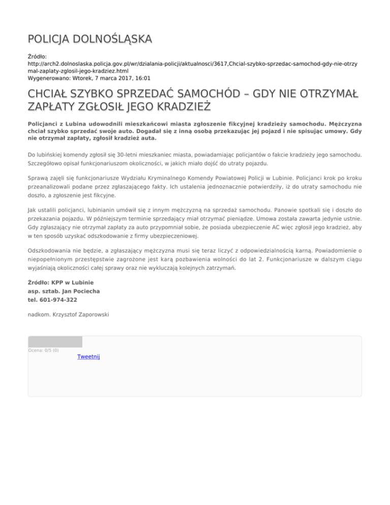 POLICJA DOLNOŚLĄSKA Źródło: http://arch2.dolnoslaska.policja.gov.pl/wr/dzialania-policji/aktualnosci/3617,Chcial-szybko-sprzedac-samochod-gdy-nie-otrzy mal-zaplaty-zglosil-jego-kradziez.html Wygenerowano: Wtorek, 7 marca 2017, 16:01 CHCIAŁ SZYBKO SPRZEDAĆ SAMOCHÓD – GDY NIE OTRZYMAŁ ZAPŁATY ZGŁOSIŁ JEGO KRADZIEŻ Policjanci z Lubina udowodnili mieszkańcowi miasta zgłoszenie fikcyjnej kradzieży samochodu. Mężczyzna chciał szybko sprzedać swoje auto. Dogadał się z inną osobą przekazując jej pojazd i nie spisując umowy. Gdy nie otrzymał zapłaty, zgłosił kradzież auta. Do lubińskiej komendy zgłosił się 30-letni mieszkaniec miasta, powiadamiając policjantów o fakcie kradzieży jego samochodu. Szczegółowo opisał funkcjonariuszom okoliczności, w jakich miało dojść do utraty pojazdu. Sprawą zajęli się funkcjonariusze Wydziału Kryminalnego Komendy Powiatowej Policji w Lubinie. Policjanci krok po kroku przeanalizowali podane przez zgłaszającego fakty. Ich ustalenia jednoznacznie potwierdziły, iż do utraty samochodu nie doszło, a zgłoszenie jest fikcyjne. Jak ustalili policjanci, lubinianin umówił się z innym mężczyzną na sprzedaż samochodu. Panowie spotkali się i doszło do przekazania pojazdu. W późniejszym terminie sprzedający miał otrzymać pieniądze. Umowa została zawarta jedynie ustnie. Gdy zgłaszający nie otrzymał zapłaty za auto przypomniał sobie, że posiada ubezpieczenie AC więc zgłosił jego kradzież, aby w ten sposób uzyskać odszkodowanie z firmy ubezpieczeniowej. Odszkodowania nie będzie, a zgłaszający mężczyzna musi się teraz liczyć z odpowiedzialnością karną. Powiadomienie o niepopełnionym przestępstwie zagrożone jest karą pozbawienia wolności do lat 2. Funkcjonariusze w dalszym ciągu wyjaśniają okoliczności całej sprawy oraz nie wykluczają kolejnych zatrzymań. Źródło: KPP w Lubinie asp. sztab. Jan Pociecha tel. 601-974-322 nadkom. Krzysztof Zaporowski Ocena: 0/5 (0) Tweetnij