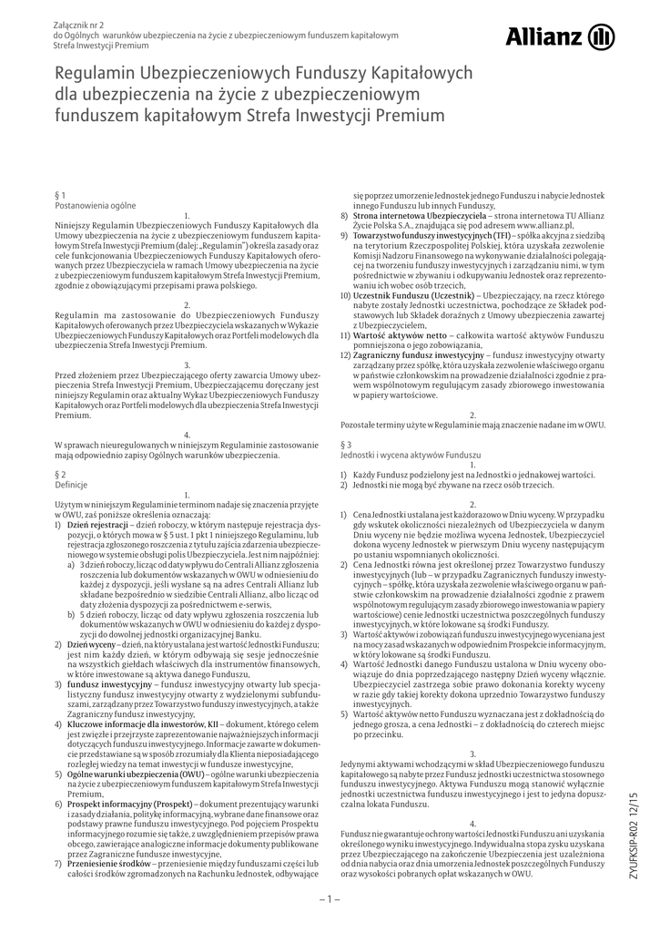 Załącznik nr 2 do Ogólnych warunków ubezpieczenia na życie z ubezpieczeniowym funduszem kapitałowym Strefa Inwestycji Premium Regulamin Ubezpieczeniowych Funduszy Kapitałowych dla ubezpieczenia na życie z ubezpieczeniowym funduszem kapitałowym Strefa Inwestycji Premium §1 Postanowienia ogólne 1. Niniejszy Regulamin Ubezpieczeniowych Funduszy Kapitałowych dla Umowy ubezpieczenia na życie z ubezpieczeniowym funduszem kapitałowym Strefa Inwestycji Premium (dalej: „Regulamin”) określa zasady oraz cele funkcjonowania Ubezpieczeniowych Funduszy Kapitałowych oferowanych przez Ubezpieczyciela w ramach Umowy ubezpieczenia na życie z ubezpieczeniowym funduszem kapitałowym Strefa Inwestycji Premium, zgodnie z obowiązującymi przepisami prawa polskiego. 2. Regulamin ma zastosowanie do Ubezpieczeniow ych Funduszy Kapitałowych oferowanych przez Ubezpieczyciela wskazanych w Wykazie Ubezpieczeniowych Funduszy Kapitałowych oraz Portfeli modelowych dla ubezpieczenia Strefa Inwestycji Premium. 3. Przed złożeniem przez Ubezpieczającego oferty zawarcia Umowy ubezpieczenia Strefa Inwestycji Premium, Ubezpieczającemu doręczany jest niniejszy Regulamin oraz aktualny Wykaz Ubezpieczeniowych Funduszy Kapitałowych oraz Portfeli modelowych dla ubezpieczenia Strefa Inwestycji Premium. 4. W sprawach nieuregulowanych w niniejszym Regulaminie zastosowanie mają odpowiednio zapisy Ogólnych warunków ubezpieczenia. się poprzez umorzenie Jednostek jednego Funduszu i nabycie Jednostek innego Funduszu lub innych Funduszy, 8) Strona internetowa Ubezpieczyciela – strona internetowa TU Allianz Życie Polska S.A., znajdująca się pod adresem www.allianz.pl, 9) Towarzystwo funduszy inwestycyjnych (TFI) – spółka akcyjna z siedzibą na terytorium Rzeczpospolitej Polskiej, która uzyskała zezwolenie Komisji Nadzoru Finansowego na wykonywanie działalności polegającej na tworzeniu funduszy inwestycyjnych i zarządzaniu nimi, w tym pośrednictwie w zbywaniu i odkupywaniu Jednostek oraz reprezentowaniu ich wobec osób trzecich, 10) Uczestnik Funduszu (Uczestnik) – Ubezpieczający, na rzecz którego nabyte zostały Jednostki uczestnictwa, pochodzące ze Składek podstawowych lub Składek doraźnych z Umowy ubezpieczenia zawartej z Ubezpieczycielem, 11) Wartość aktywów netto – całkowita wartość aktywów Funduszu pomniejszona o jego zobowiązania, 12)Zagraniczny fundusz inwestycyjny – fundusz inwestycyjny otwarty zarządzany przez spółkę, która uzyskała zezwolenie właściwego organu w państwie członkowskim na prowadzenie działalności zgodnie z prawem wspólnotowym regulującym zasady zbiorowego inwestowania w papiery wartościowe. 2. Pozostałe terminy użyte w Regulaminie mają znaczenie nadane im w OWU. §3 Jednostki i wycena aktywów Funduszu 1. Użytym w niniejszym Regulaminie terminom nadaje się znaczenia przyjęte w OWU, zaś poniższe określenia oznaczają: 1) Dzień rejestracji – dzień roboczy, w którym następuje rejestracja dyspozycji, o których mowa w § 5 ust. 1 pkt 1 niniejszego Regulaminu, lub rejestracja zgłoszonego roszczenia z tytułu zajścia zdarzenia ubezpieczeniowego w systemie obsługi polis Ubezpieczyciela. Jest nim najpóźniej: a) 3 dzień roboczy, licząc od daty wpływu do Centrali Allianz zgłoszenia roszczenia lub dokumentów wskazanych w OWU w odniesieniu do każdej z dyspozycji, jeśli wysłane są na adres Centrali Allianz lub składane bezpośrednio w siedzibie Centrali Allianz, albo licząc od daty złożenia dyspozycji za pośrednictwem e-serwis, b) 5 dzień roboczy, licząc od daty wpływu zgłoszenia roszczenia lub dokumentów wskazanych w OWU w odniesieniu do każdej z dyspozycji do dowolnej jednostki organizacyjnej Banku. 2) Dzień wyceny – dzień, na który ustalana jest wartość Jednostki Funduszu; jest nim każdy dzień, w którym odbywają się sesje jednocześnie na wszystkich giełdach właściwych dla instrumentów finansowych, w które inwestowane są aktywa danego Funduszu, 3) fundusz inwestycyjny – fundusz inwestycyjny otwarty lub specjalistyczny fundusz inwestycyjny otwarty z wydzielonymi subfunduszami, zarządzany przez Towarzystwo funduszy inwestycyjnych, a także Zagraniczny fundusz inwestycyjny, 4) Kluczowe informacje dla inwestorów, KII – dokument, którego celem jest zwięzłe i przejrzyste zaprezentowanie najważniejszych informacji dotyczących funduszu inwestycyjnego. Informacje zawarte w dokumencie przedstawiane są w sposób zrozumiały dla Klienta nieposiadającego rozległej wiedzy na temat inwestycji w fundusze inwestycyjne, 5) Ogólne warunki ubezpieczenia (OWU) – ogólne warunki ubezpieczenia na życie z ubezpieczeniowym funduszem kapitałowym Strefa Inwestycji Premium, 6) Prospekt informacyjny (Prospekt) – dokument prezentujący warunki i zasady działania, politykę informacyjną, wybrane dane finansowe oraz podstawy prawne funduszu inwestycyjnego. Pod pojęciem Prospektu informacyjnego rozumie się także, z uwzględnieniem przepisów prawa obcego, zawierające analogiczne informacje dokumenty publikowane przez Zagraniczne fundusze inwestycyjne, 7) Przeniesienie środków – przeniesienie między funduszami części lub całości środków zgromadzonych na Rachunku Jednostek, odbywające –1– 1. 1) Każdy Fundusz podzielony jest na Jednostki o jednakowej wartości. 2) Jednostki nie mogą być zbywane na rzecz osób trzecich. 2. 1) Cena Jednostki ustalana jest każdorazowo w Dniu wyceny. W przypadku gdy wskutek okoliczności niezależnych od Ubezpieczyciela w danym Dniu wyceny nie będzie możliwa wycena Jednostek, Ubezpieczyciel dokona wyceny Jednostek w pierwszym Dniu wyceny następującym po ustaniu wspomnianych okoliczności. 2) Cena Jednostki równa jest określonej przez Towarzystwo funduszy inwestycyjnych (lub – w przypadku Zagranicznych funduszy inwestycyjnych – spółkę, która uzyskała zezwolenie właściwego organu w państwie członkowskim na prowadzenie działalno